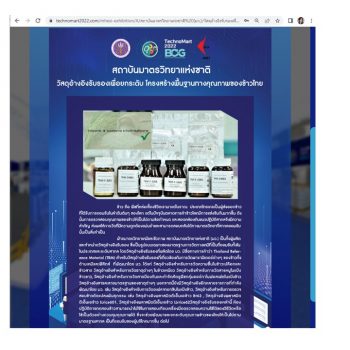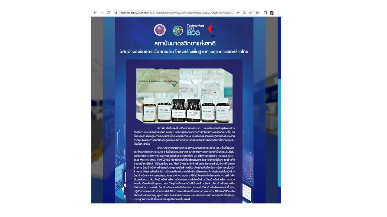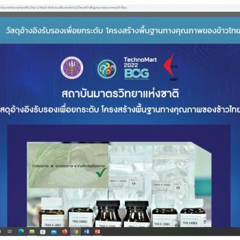 ในการนี้ สถาบันมาตรวิทยาแห่งชาติ ร่วมนำเสนอผลงานในรูปแบบออนไลน์ ในกลุ่ม agriculture เกี่ยวกับเรื่อง “วัสดุอ้างอิงรับรองเพื่อยกระดับ โครงสร้างพื้นฐานทางคุณภาพของข้าวไทย” ซึ่ง“ข้าว คือ พืชที่หล่อเลี้ยงชีวิตเรามาแต่โบราณ ประเทศไทยเคยเป็นผู้ส่งออกข้าวที่ได้รับการยอมรับในลำดับต้นๆ ของโลก แต่ในปัจจุบันตลาดการค้าข้าวโลกมีการแข่งขันกันมากขึ้น ดังนั้นการตรวจสอบคุณภาพของข้าวให้เป็นไปตามข้อกำหนด และสอดคล้องกับแนวปฏิบัติสากลจึงมีความสำคัญ ส่งผลให้การวัดที่มีความถูกต้องแม่นยำและสามารถสอบกลับได้ทางมาตรวิทยาที่สากลยอมรับนั้นเป็นสิ่งจำเป็น ฝ่ายมาตรวิทยาเคมีและชีวภาพ สถาบันมาตรวิทยาแห่งชาติ (มว.) เป็นทั้งผู้ผลิต และจำหน่ายวัสดุอ้างอิงรับรอง ซึ่งเป็นรูปแบบเฉพาะของมาตรฐานการวัดทางเคมีที่เป็นที่ยอมรับทั้งในในประเทศและระดับสากล โดยวัสดุอ้างอิงรับรองที่ผลิตโดย มว. มีชื่อทางการค้าว่า Thailand Reference Material (TRM) ซึ่งวัสดุอ้างอิงรับรองที่เราผลิตขึ้น ห้องปฏิบัติการทดสอบข้าวสามารถนำไปใช้ในการสอบเทียบเครื่องมือตรวจสอบความใช้ได้ของวิธีวัดหรือใช้เป็นตัวอย่างควบคุมคุณภาพได้ ซึ่งจะช่วยพัฒนาและยกระดับคุณภาพข้าวของไทยให้เป็นไปตามมาตรฐานสากล เป็นที่ยอมรับของผู้บริโภคมากขึ้น ต่อไป