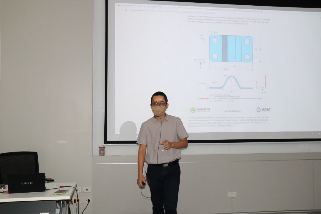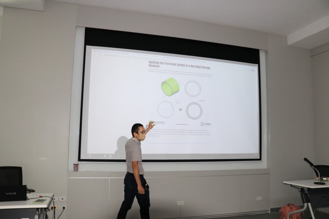 ส่วนฝึกอบรม กลุ่มงานพัฒนาธุรกิจ ฝ่ายนโยบายและยุทธศาสตร์ จัดการอบรมหลักสูตรมาตรวิทยาประจำปีงบประมาณ 2566 ในหัวข้อ “ หลักเกณฑ์ความคลาดเคลื่อนทางขนาดและเรขาคณิต (GD&T) ระดับ 1” ซึ่งเป็นหลักสูตรที่เหมาะสำหรับผู้เขียนและออกแบบทางเครื่องกล วิศวกร เจ้าหน้าที่ ผู้วัดตรวจสอบชิ้นงาน หรือผู้ที่สนใจทั่วไป เพื่อให้ผู้เข้ารับการอบรมทั้งจากภาครัฐ เอกชน และอุตสาหกรรม มีความเข้าใจเกี่ยวกับมาตรฐาน ISO 1101 และ ASME Y14.5 และเข้าใจเกณฑ์ความเผื่อทางขนาดและเรขาคณิตสำหรับการออกแบบและการวัด ตลอดจนสามารถคำนวณและวิเคราะห์เกณฑ์ความเผื่อทางขนาดและเรขาคณิตได้ บรรยายโดย ดร.วิโรจน์ สุดาธรรม (วิทยากร) นักมาตรวิทยาชำนาญการ กลุ่มงานวิศวกรรมการวัดละเอียด และ นางสาวสิริชัญญา ถ้ำเพชร (ผู้ช่วยวิทยากร) นักมาตรวิทยาฝึกหัดปฏิบัติการ กลุ่มงานวิศวกรรมการวัดละเอียด ฝ่ายมาตรวิทยามิติ โดยผู้เข้ารับการอบรมจะได้เรียนรู้เนื้อหาในภาคทฤษฎี อาทิ บทนำ GD&T, ISO 1101 และ ASME Y14.5 จุดอ้างอิงและระบบดาตัม สัญลักษณ์พิกัดความเผื่อทางเรขาคณิต แนวทางการวัดและการวิเคราะห์ และปฏิบัติการวิเคราะห์จากข้อมูลดิบ เป็นต้น ณ ห้องประชุมชั้น 3 อาคารพัฒนามาตรฐานการวัดเพื่อรองรับการพัฒนาระบบราง และอาคารผดุงมาตร (มว.) จ.ปทุมธานี