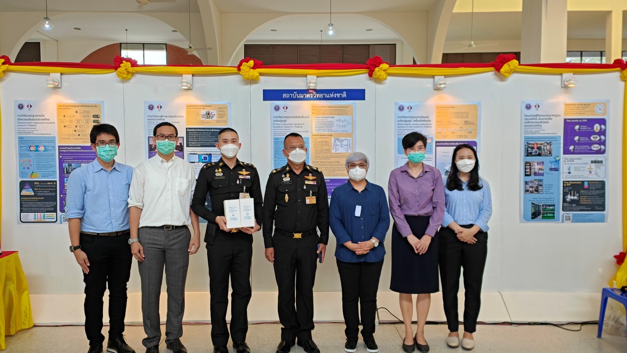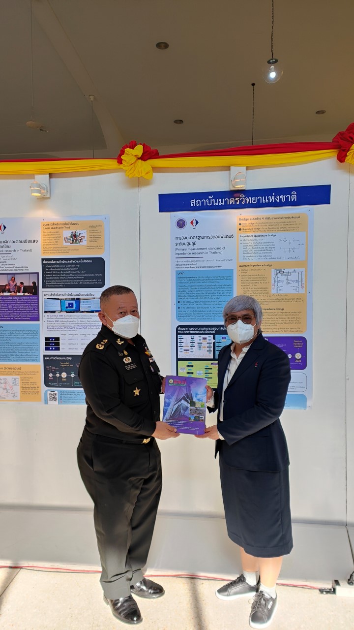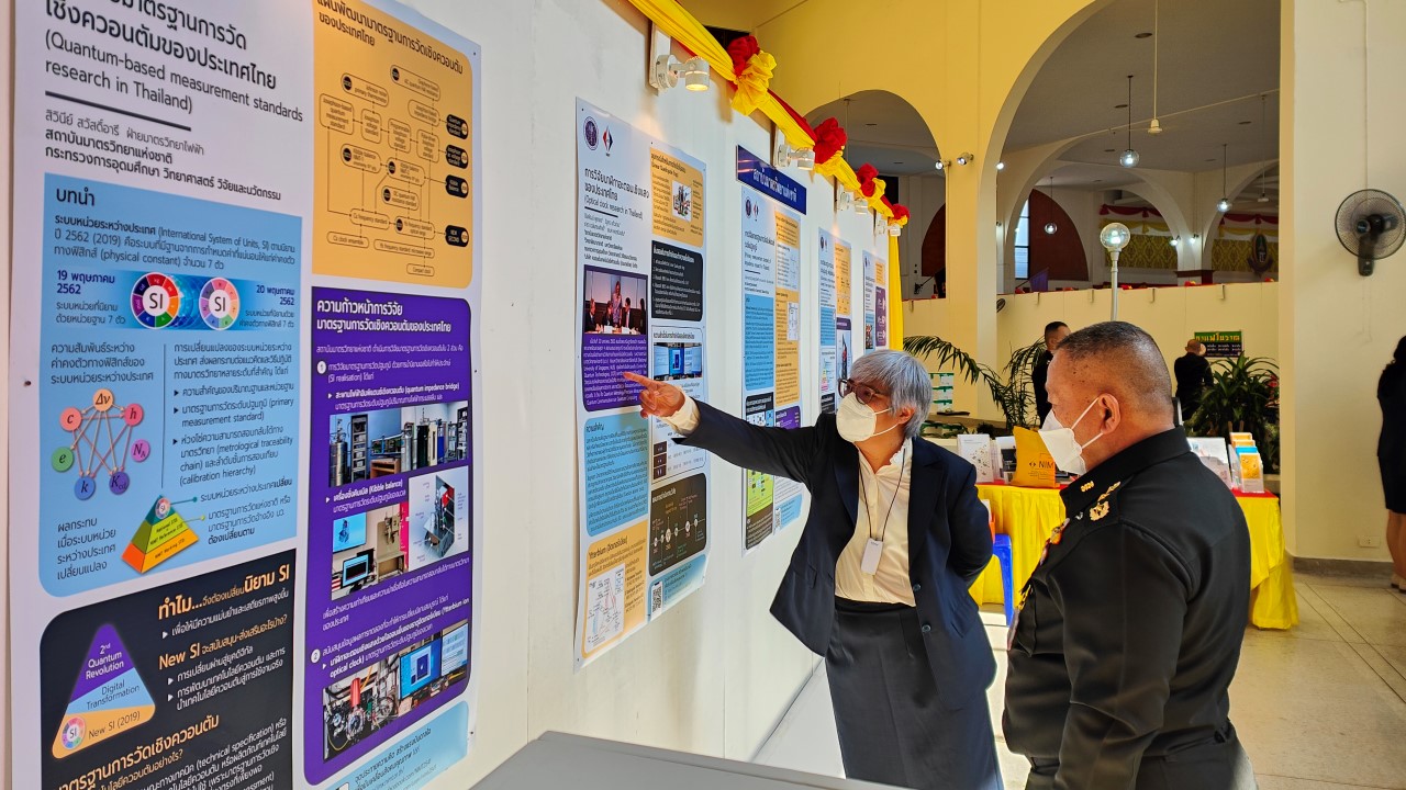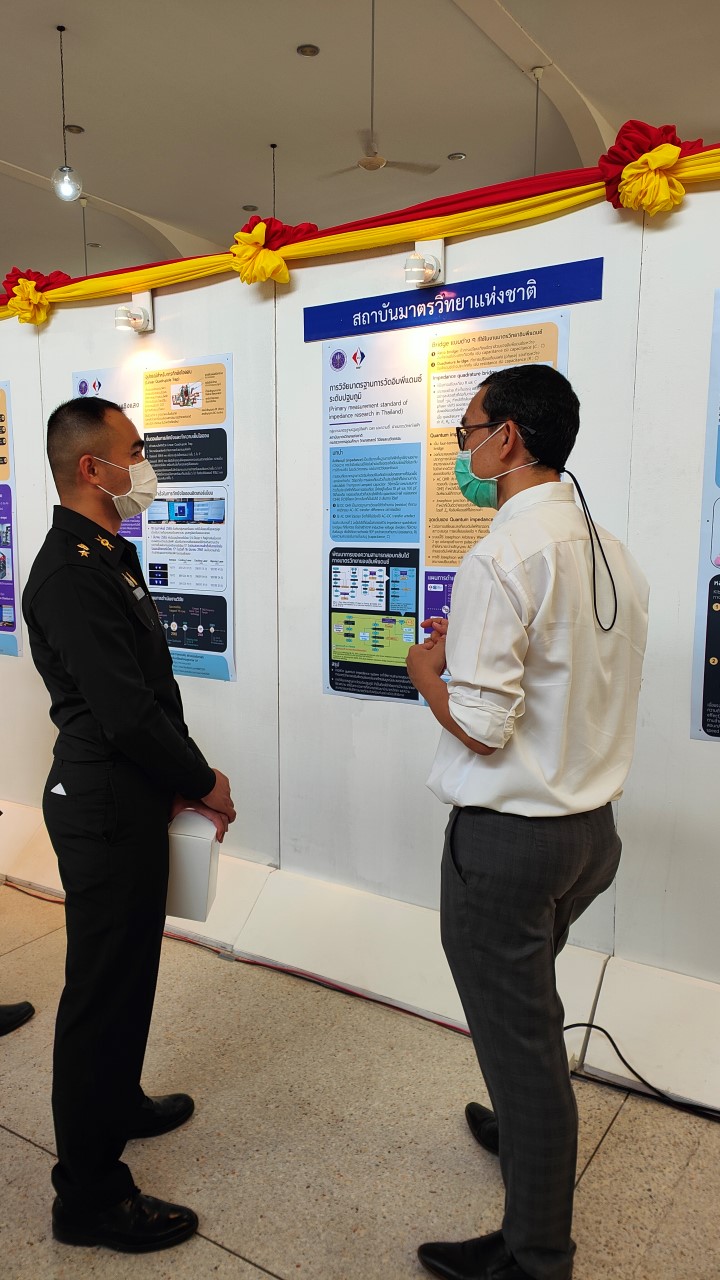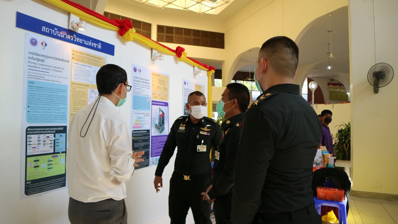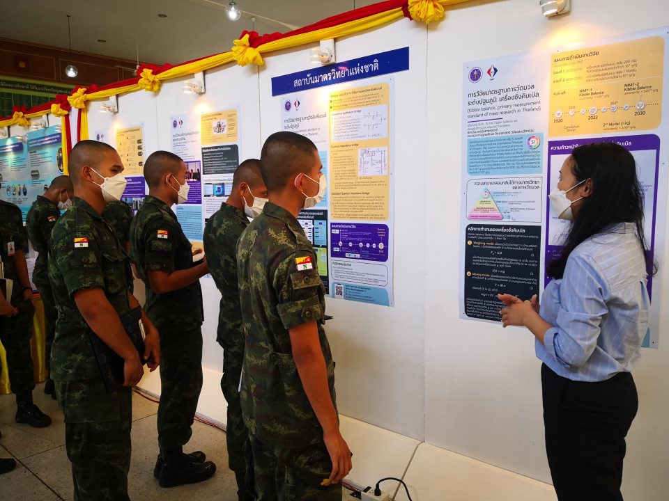 ในการนี้ น.ส.สิวินีย์ สวัสดิ์อารี หัวหน้าฝ่ายมาตรวิทยาไฟฟ้าพร้อมด้วย พนักงาน มว. เข้าร่วมงานดังกล่าว โดยร่วมนำเสนอผลงานทางวิชาการในหัวข้อ “การวิจัยและสร้างมาตรฐานการวัดเชิงควอนตัมของประเทศไทย” โดยการจัดนิทรรศการครั้งนี้ได้รายงานความก้าวหน้าของการวิจัยมาตรฐานการวัดระดับปฐมภูมิ 3 รายการ ได้แก่ นาฬิกาอะตอมเชิงแสงด้วยไอออนเย็นของธาตุอิตเทอร์เบียม (Ytterbium ion optical clock) สะพานไฟฟ้าอิมพิแดนซ์เชิงควอนตัม (quantum impedance bridge) และตราชั่งแบบคิบเบิล (Kibble balance) ซึ่งจะเป็นมาตรฐานการวัดระดับปฐมภูมิของเวลา อิมพิแดนซ์ และมวล ตามลำดับ มาตรฐานการวัดทั้งสามรายการนี้เป็นระบบขนาดใหญ่ที่มีความซับซ้อน เกิดจากการสร้างปรากฏการณ์ธรรมชาติเชิงควอนตัมที่มีลักษณะเฉพาะเจาะจงและคงตัว แล้วนำมาผนวกกับระบบวัดที่มีความไวอย่างยิ่งเพื่อสำแดง หรือถ่ายทอดลักษณะเฉพาะเชิงควอนตัมนั้นมาเป็นสัญญาณที่สามารถนำไปใช้ประโยชน์ทางมาตรวิทยาต่อไป ทั้งนี้เพือเป็นการประชาสัมพันธ์องค์ความรู้เกี่ยวกับการเปลี่ยนแปลงนิยามของ ระบบหน่วยระหว่างประเทศ หรือเอสไอ (International System of Units, SI) ตามนิยามปี 2562 ที่วางอยู่บนค่าคงที่ที่มีค่าแน่นอนจำนวน 7 ตัว รวมไปถึงการสร้างความรู้ ความเข้าใจ บทบาท หน้าที่ ภารกิจ ของสถาบันมาตรวิทยาแห่งชาติ ให้เป็นที่รู้จักในวงกว้าง เพื่อสร้างความรับรู้และสร้างความตระหนักให้สังคมได้รับทราบ และเห็นความสำคัญของงานด้านมาตรวิทยาที่เป็นหนึ่งในองค์ประกอบของงานด้านโครงสร้างพื้นฐานทางคุณภาพของประเทศ ที่มีส่วนสำคัญต่อการพัฒนาทั้งทางด้านเศรษฐกิจ สังคม รวมไปถึงงานด้านความมั่นคงของชาติ ณ โรงเรียนนายร้อยพระจุลจอมเกล้า จ.นครนายก
