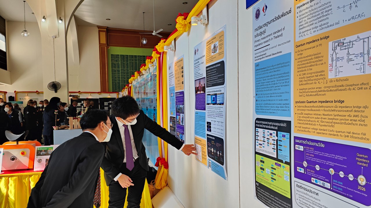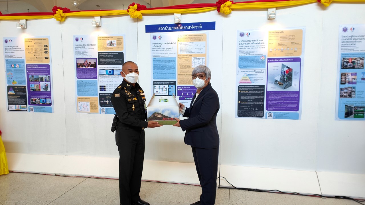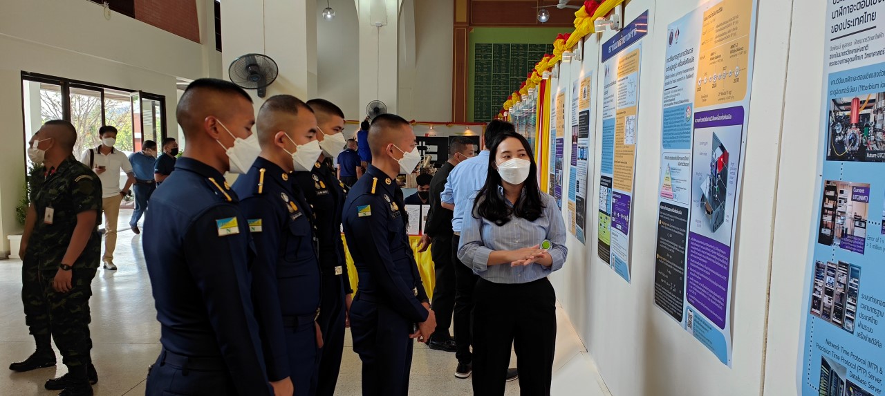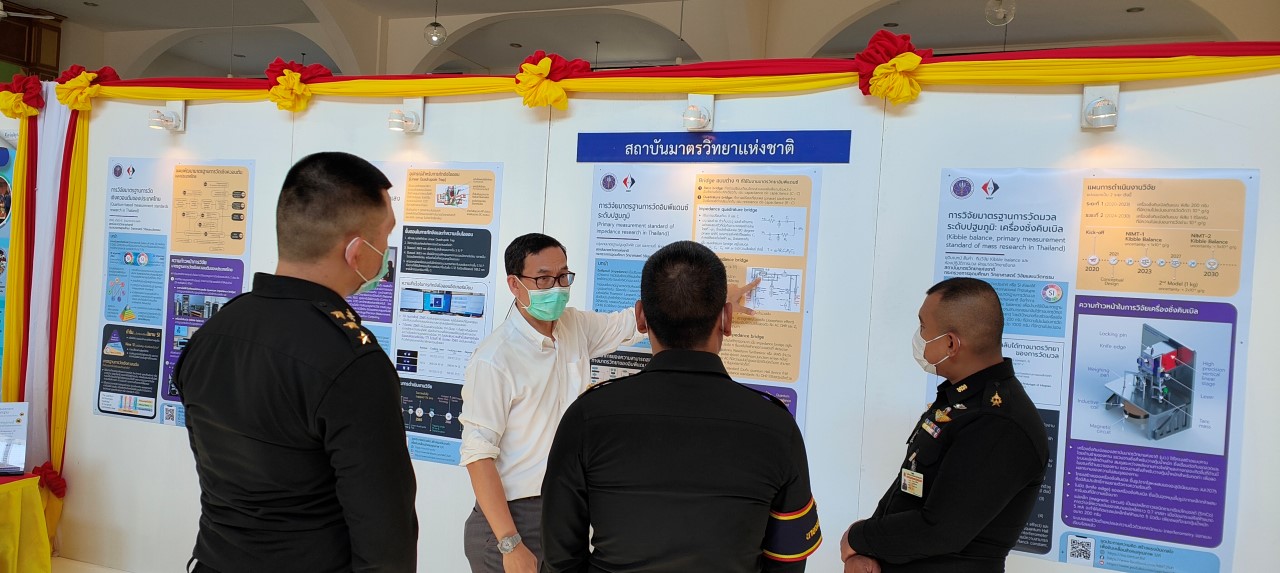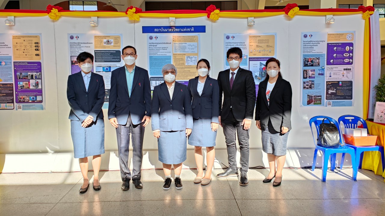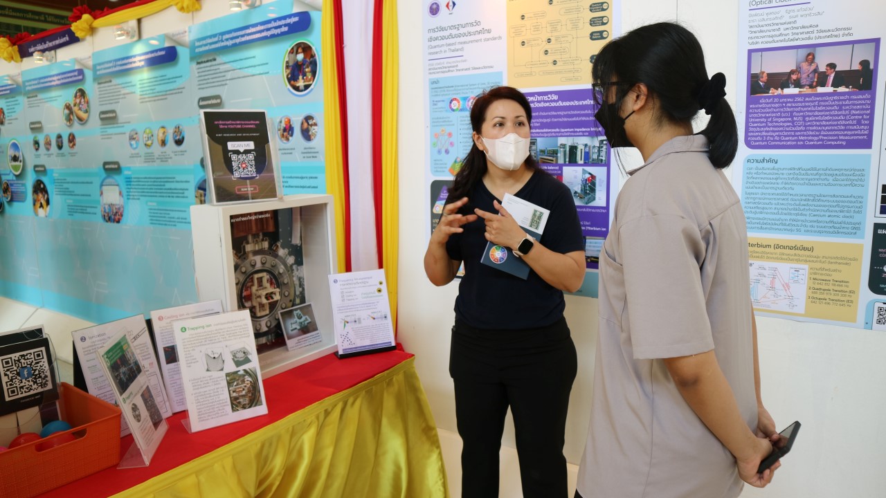 ในการนี้ น.ส.สิวินีย์ สวัสดิ์อารี หัวหน้าฝ่ายมาตรวิทยาไฟฟ้าพร้อมด้วย พนักงาน มว. เข้าร่วมงานดังกล่าว โดยร่วมนำเสนอผลงานทางวิชาการในหัวข้อ “การวิจัยและสร้างมาตรฐานการวัดเชิงควอนตัมของประเทศไทย” โดยการจัดนิทรรศการครั้งนี้ได้รายงานความก้าวหน้าของการวิจัยมาตรฐานการวัดระดับปฐมภูมิ 3 รายการ ได้แก่ นาฬิกาอะตอมเชิงแสงด้วยไอออนเย็นของธาตุอิตเทอร์เบียม (Ytterbium ion optical clock) สะพานไฟฟ้าอิมพิแดนซ์เชิงควอนตัม (quantum impedance bridge) และตราชั่งแบบคิบเบิล (Kibble balance) ซึ่งจะเป็นมาตรฐานการวัดระดับปฐมภูมิของเวลา อิมพิแดนซ์ และมวล ตามลำดับ มาตรฐานการวัดทั้งสามรายการนี้เป็นระบบขนาดใหญ่ที่มีความซับซ้อน เกิดจากการสร้างปรากฏการณ์ธรรมชาติเชิงควอนตัมที่มีลักษณะเฉพาะเจาะจงและคงตัว แล้วนำมาผนวกกับระบบวัดที่มีความไวอย่างยิ่งเพื่อสำแดง หรือถ่ายทอดลักษณะเฉพาะเชิงควอนตัมนั้นมาเป็นสัญญาณที่สามารถนำไปใช้ประโยชน์ทางมาตรวิทยาต่อไป ทั้งนี้เพือเป็นการประชาสัมพันธ์องค์ความรู้เกี่ยวกับการเปลี่ยนแปลงนิยามของ ระบบหน่วยระหว่างประเทศ หรือเอสไอ (International System of Units, SI) ตามนิยามปี 2562 ที่วางอยู่บนค่าคงที่ที่มีค่าแน่นอนจำนวน 7 ตัว รวมไปถึงการสร้างความรู้ ความเข้าใจ บทบาท หน้าที่ ภารกิจ ของสถาบันมาตรวิทยาแห่งชาติ ให้เป็นที่รู้จักในวงกว้าง เพื่อสร้างความรับรู้และสร้างความตระหนักให้สังคมได้รับทราบ และเห็นความสำคัญของงานด้านมาตรวิทยาที่เป็นหนึ่งในองค์ประกอบของงานด้านโครงสร้างพื้นฐานทางคุณภาพของประเทศ ที่มีส่วนสำคัญต่อการพัฒนาทั้งทางด้านเศรษฐกิจ สังคม รวมไปถึงงานด้านความมั่นคงของชาติ ณ โรงเรียนนายร้อยพระจุลจอมเกล้า จ.นครนายก