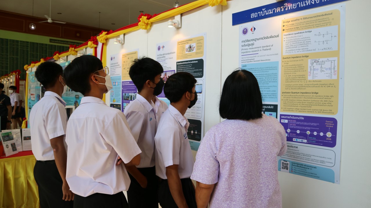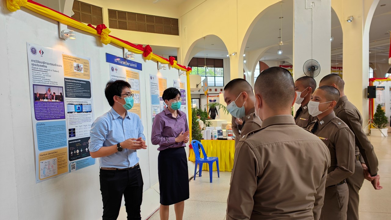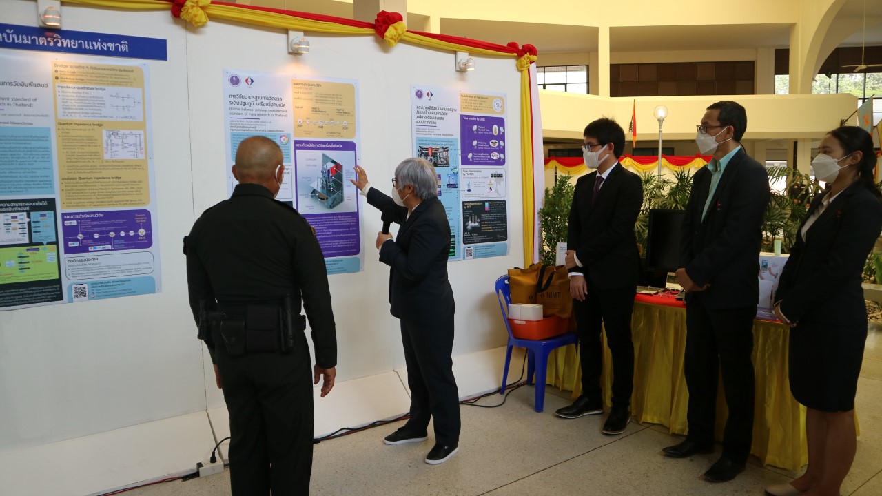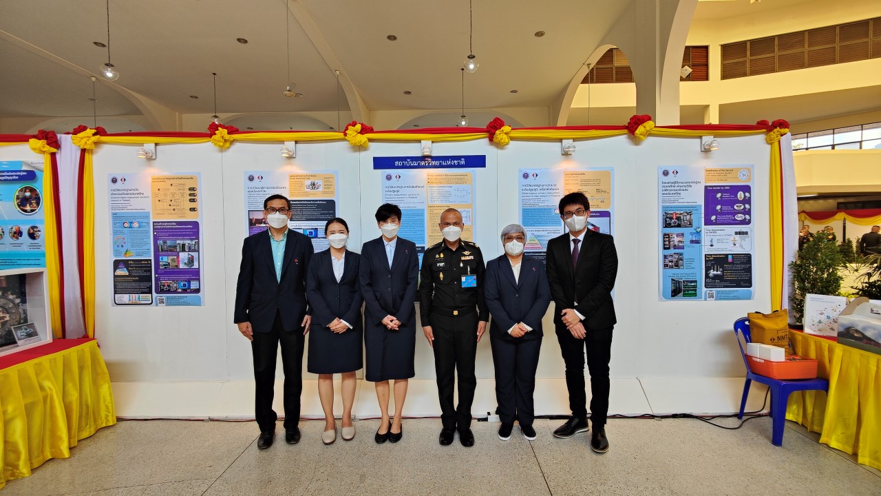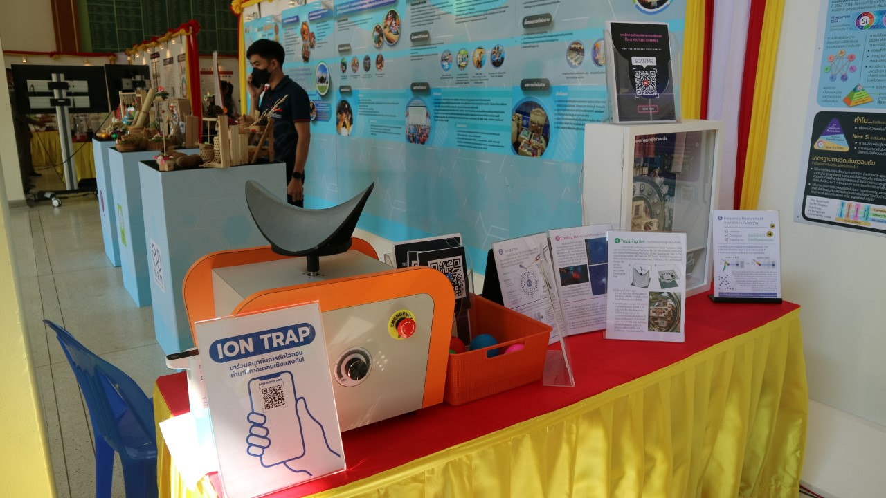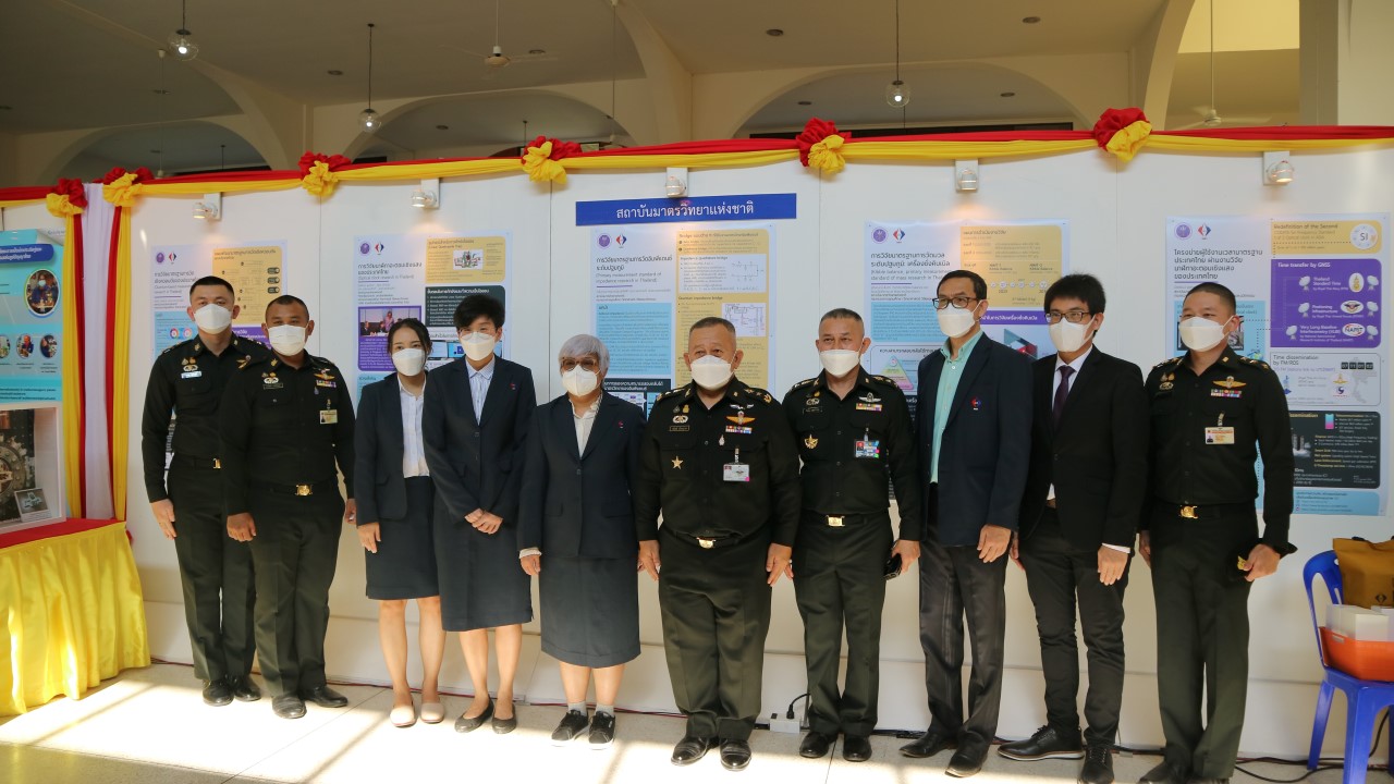 ในการนี้ น.ส.สิวินีย์ สวัสดิ์อารี หัวหน้าฝ่ายมาตรวิทยาไฟฟ้าพร้อมด้วย พนักงาน มว. เข้าร่วมงานดังกล่าว โดยร่วมนำเสนอผลงานทางวิชาการในหัวข้อ “การวิจัยและสร้างมาตรฐานการวัดเชิงควอนตัมของประเทศไทย” โดยการจัดนิทรรศการครั้งนี้ได้รายงานความก้าวหน้าของการวิจัยมาตรฐานการวัดระดับปฐมภูมิ 3 รายการ ได้แก่ นาฬิกาอะตอมเชิงแสงด้วยไอออนเย็นของธาตุอิตเทอร์เบียม (Ytterbium ion optical clock) สะพานไฟฟ้าอิมพิแดนซ์เชิงควอนตัม (quantum impedance bridge) และตราชั่งแบบคิบเบิล (Kibble balance) ซึ่งจะเป็นมาตรฐานการวัดระดับปฐมภูมิของเวลา อิมพิแดนซ์ และมวล ตามลำดับ มาตรฐานการวัดทั้งสามรายการนี้เป็นระบบขนาดใหญ่ที่มีความซับซ้อน เกิดจากการสร้างปรากฏการณ์ธรรมชาติเชิงควอนตัมที่มีลักษณะเฉพาะเจาะจงและคงตัว แล้วนำมาผนวกกับระบบวัดที่มีความไวอย่างยิ่งเพื่อสำแดง หรือถ่ายทอดลักษณะเฉพาะเชิงควอนตัมนั้นมาเป็นสัญญาณที่สามารถนำไปใช้ประโยชน์ทางมาตรวิทยาต่อไป ทั้งนี้เพือเป็นการประชาสัมพันธ์องค์ความรู้เกี่ยวกับการเปลี่ยนแปลงนิยามของ ระบบหน่วยระหว่างประเทศ หรือเอสไอ (International System of Units, SI) ตามนิยามปี 2562 ที่วางอยู่บนค่าคงที่ที่มีค่าแน่นอนจำนวน 7 ตัว รวมไปถึงการสร้างความรู้ ความเข้าใจ บทบาท หน้าที่ ภารกิจ ของสถาบันมาตรวิทยาแห่งชาติ ให้เป็นที่รู้จักในวงกว้าง เพื่อสร้างความรับรู้และสร้างความตระหนักให้สังคมได้รับทราบ และเห็นความสำคัญของงานด้านมาตรวิทยาที่เป็นหนึ่งในองค์ประกอบของงานด้านโครงสร้างพื้นฐานทางคุณภาพของประเทศ ที่มีส่วนสำคัญต่อการพัฒนาทั้งทางด้านเศรษฐกิจ สังคม รวมไปถึงงานด้านความมั่นคงของชาติ ณ โรงเรียนนายร้อยพระจุลจอมเกล้า จ.นครนายก