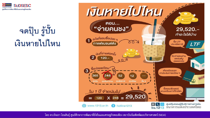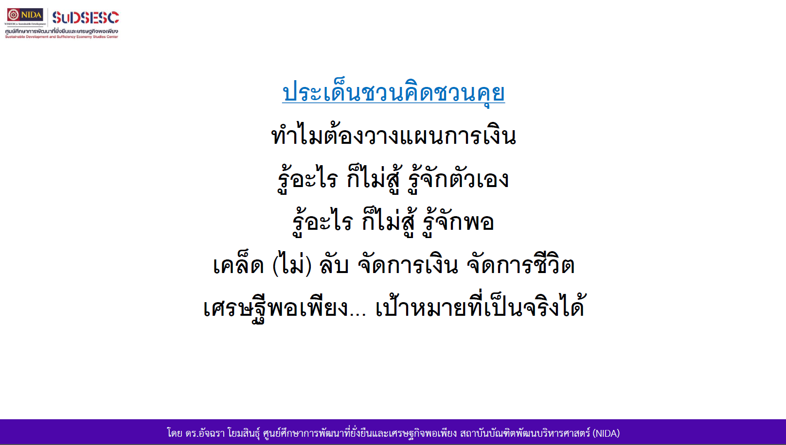 - วิทยากร : ดร.อัฉรา โยมสินธุ์ : นักคิด นักเขียน ผู้เชี่ยวชาญด้านการเงินส่วนบุคคล และนักวิจัย ศูนย์ศึกษาการพัฒนาที่ยั่งยืนและเศรษฐกิจพอเพียง (SuDSESC) สถาบันบัณฑิตพัฒนบริหารศาสตร์ (NIDA)