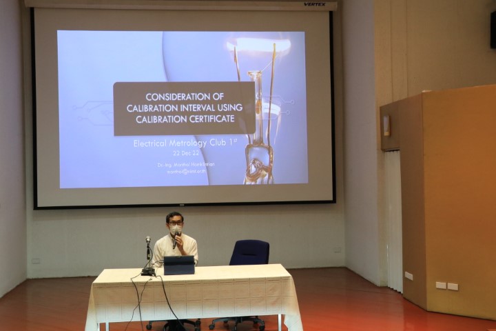 นางอัจฉรา เจริญสุข ผู้อำนวยการ มว. เป็นประธานเปิดกิจกรรมชมรมมาตรวิทยาไฟฟ้า ครั้งที่ 1 ประจำปี 2566 เรื่องแนวทางการดูแลมาตรฐานการวัดด้านไฟฟ้าและหารือแนวทางการใช้ใบรับรองผลการสอบเทียบแบบดิจิตอล โดยมีวัตถุประสงค์เพื่อให้สมาชิกของชมรมได้ทราบถึงแนวทางการดูแลรักษามาตรฐานการวัดด้านไฟฟ้าและแนวทางการใช้ใบรับรองผลการสอบเทียบแบบดิจิตอล โดยการบรรยายในช่วงเช้า จะเป็นหัวข้อ การบำรุงรักษาเครื่องมือวัดทางไฟฟ้า บรรยายโดยคุณสุรเชษฐ เพิ่มฉลาด นักมาตรวิทยาชำนาญการ คุณกองศักดิ์ ทองบุญ นักมาตรวิทยาชำนาญการ และ ดร.มณฑล หอมกลิ่นเทียน นักมาตรวิทยาชำนาญการพิเศษและรักษาการหัวหน้ากลุ่มงานมาตรฐานปฐมภูมิไฟฟ้า เวลาและความถี่ ฝ่ายมาตรวิทยาไฟฟ้า บรรยายในหัวข้อ การพิจารณารอบของการสอบเทียบ โดยใช้ผลของการสอบเทียบ และในช่วยบ่ายเป็นการบรรยายหัวข้อ การบริการมาตรวิทยาในยุค Digital Transformation โดยดร.นรินทร์ จันทวงศ์ นักมาตรวิทยาชำนาญการพิเศษ ฝ่ายมาตรวิทยามิติ และการรับฟังความคิดเห็นต่อ “ใบรับรองผลการสอบเทียบแบบดิจิทัล (Digital Calibration Certificate, DCC)” โดยคุณไปรยา ทองเหลือง และคุณสุนันติยา พาระนา นักวิจัยโครงการมาตรวิทยาเพื่อการเปลี่ยนผ่านสู่เศรษฐกิจดิจิทัล กิจกรรมชมรมมาตรวิทยาดังกล่าวจัดขึ้น ณ ห้องประชุม 226 อาคารสำนักงานกลาง (มว.) คลองห้า จังหวัดปทุมธานี