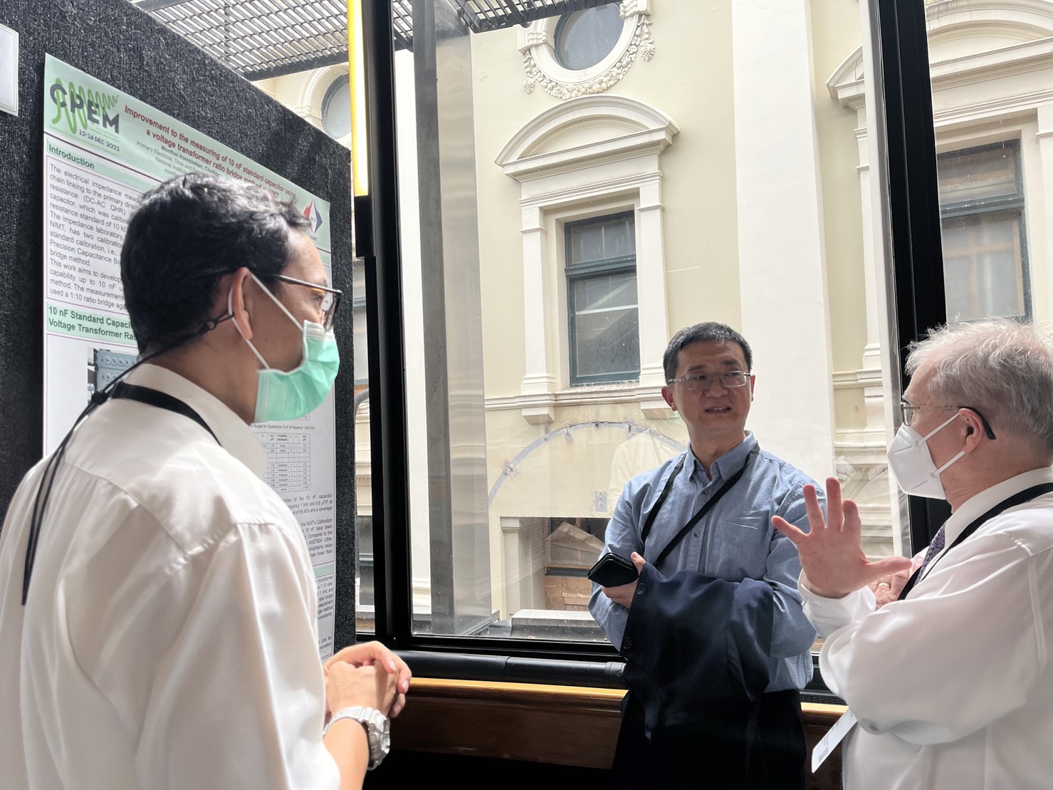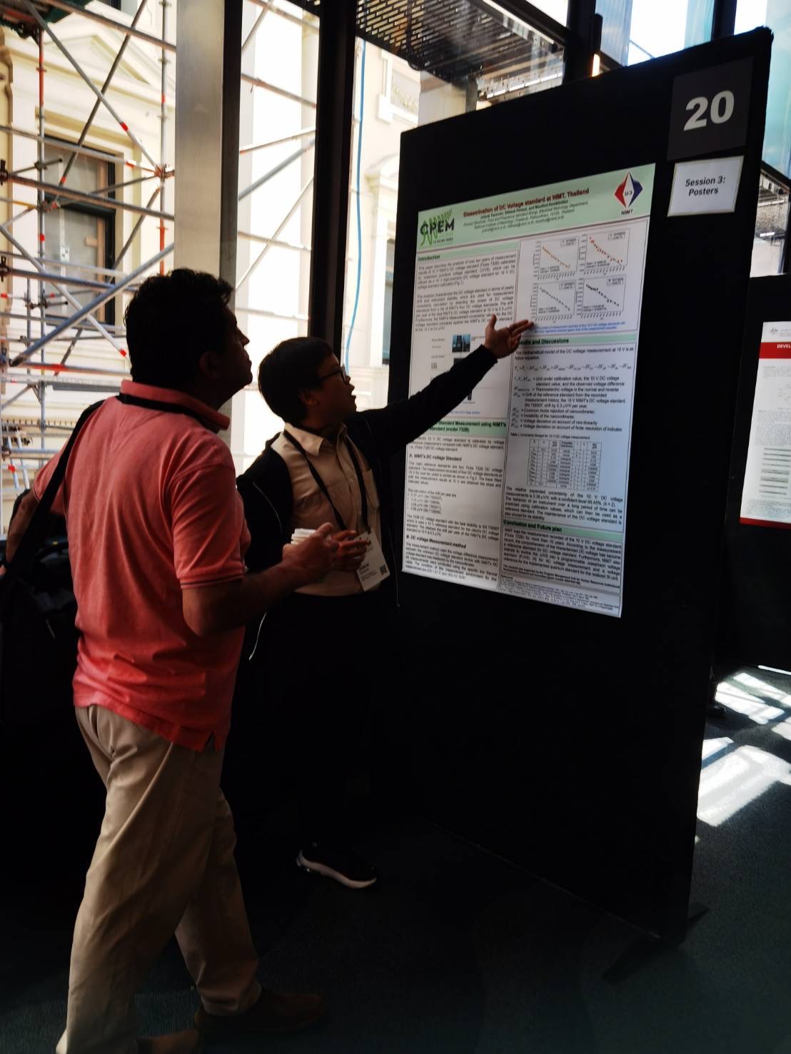 - ดร.มณฑล หอมกลิ่นเทียน นักมาตรวิทยาชำนาญการพิเศษ รักษาการหัวหน้ากลุ่มงานมาตรฐานปฐมภูมิไฟฟ้า เวลาและความถี่ ฝ่ายมาตรวิทยาไฟฟ้า นำเสนองานวิจัยหัวข้อ“Improvement to the measuring of 10 nF standard capacitor using a voltage transformer ratio bridge method at NIMT”