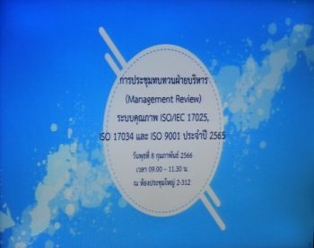 ส่วนงานคุณภาพ กลุ่มงานสารบรรณและการประชุม จัดประชุมทบทวนฝ่ายบริหาร (Management Review) ระบบคุณภาพ ISO/IEC 17025, ISO 17034 และ ISO 9001 โดยมีวัตถุประสงค์เพื่อทบทวน ปรับปรุง แก้ไข ระบบคุณภาพ ISO/IEC 17025, ISO 17034 และ ISO 9001 ให้มีประสิทธิภาพมากยิ่งขึ้น ในการนี้ นายอนุสรณ์ ทนหมื่นไวย รองผู้อำนวยการ มว. เป็นประธานในการประชุมดัง ยังได้แจ้งให้ที่ประชุมทราบเรื่องการแต่งตั้ง ดร.จริยา บัวเจริญ ให้เป็นผู้จัดการคุณภาพของ ISO/IEC 17025, ISO 17034 และ QMR ของ ISO 9001 อีกด้วย การประชุมดังกล่าวจัดขึ้น ณ อาคารผดุงมาตร มว. จังหวัดปทุมธานี