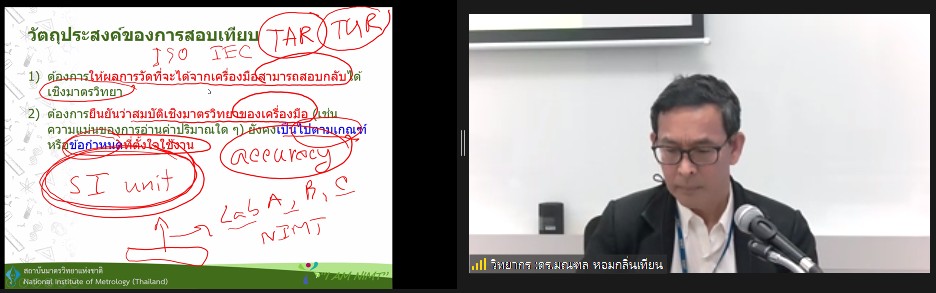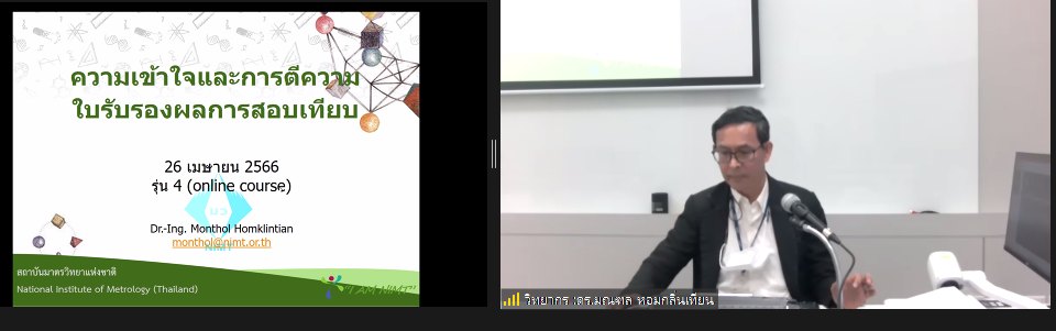 ส่วนฝึกอบรม กลุ่มงานพัฒนาธุรกิจ จัดการอบรมหลักสูตรมาตรวิทยาประจำปีงบประมาณ 2566 ในรูปแบบออนไลน์ หัวข้อ “ ความเข้าใจและการตีความใบรับรองผลการสอบเทียบ รุ่น 4 ” ที่เป็นหลักสูตรที่เหมาะสำหรับผู้ตรวจประเมินระบบคุณภาพ ISO ผู้รับผิดชอบด้านระบบคุณภาพและเครื่องมือวัด และเจ้าหน้าที่ทดสอบและสอบเทียบมาตรฐานเครื่องมือวัด บรรยายโดย ดร.มณฑล หอมกลิ่นเทียน นักมาตรวิทยาชำนาญการพิเศษ รักษาการหัวหน้ากลุ่มงานมาตรฐานปฐมภูมิไฟฟ้า เวลาและความถี่ ฝ่ายมาตรวิทยาไฟฟ้า ทั้งนี้เพื่อให้ผู้เข้าอบรมมีความรู้ความเข้าใจและทราบถึงองค์ประกอบสำคัญในใบรายงานการสอบเทียบ และตระหนักถึงความสำคัญของใบรายงานผลการสอบเทียบเครื่องมือวัด สามารถอธิบายนิยามศัพท์ทางมาตรวิทยาที่ปรากฎในใบรับรองการสอบเทียบได้อย่างถูกต้อง พร้อมทั้งสามารถนำข้อมูลในใบรายงานการสอบเทียบไปใช้ได้อย่างถูกต้อง รวมไปถึงการมีองค์ความรู้ในการเลือกใช้บริการห้องปฏิบัติการสอบเทียบได้อย่างถูกต้องต่อไป ณ ห้องประชุมชั้น 3 อาคารพัฒนามาตรฐานการวัดเพื่อรองรับการพัฒนาระบบราง (มว.) จ.ปทุมธานี