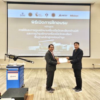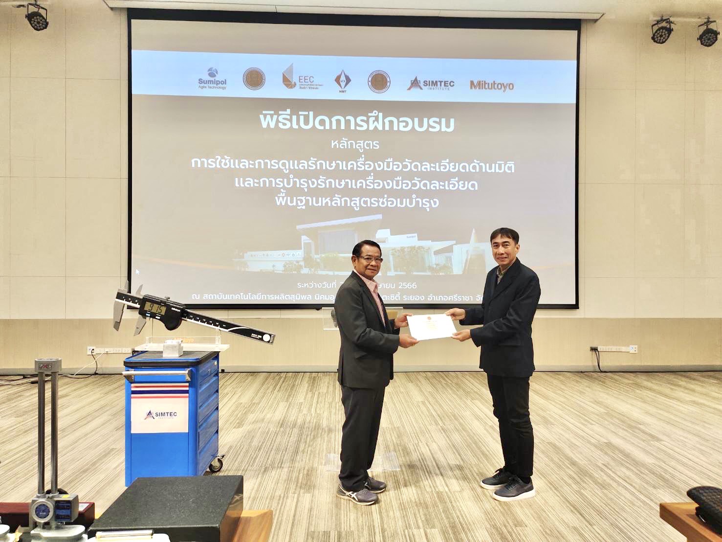 สถาบันมาตรวิทยาแห่งชาติ (มว.) ร่วมกับ สำนักงานคณะกรรมการการอาชีวศึกษาสถาบันการอาชีวศึกษาภาคตะวันออก คณะทำงานประสานงานด้านการพัฒนาบุคลากรในเขตพัฒนาพิเศษภาคตะวันออก(EEC HDC) สถาบันเทคโนโลยีการผลิตสุมิพล บริษัท สุมิพล คอร์ปอเรชั่น จำกัด และบริษัท มิตูโตโย (ประเทศไทย) จำกัด จัดกิจกรรมการฝึกอบรมหลักสูตร “การใช้และการดูแลรักษาเครื่องมือวัดละเอียดด้านมิติ และการบำรุงรักษาเครื่องมือวัดละเอียดพื้นฐานหลักสูตรซ่อมบำรุง” ภายใต้โครงการฝึกอบรมพัฒนาทักษะครูอาชีวศึกษาทฤษฎีเชิงปฏิบัติ ประจำปี 2566 ให้แก่ครูผู้สอนในสังกัดสำนักงานคณะกรรมการการอาชีวศึกษา โดยมีวัตถุประสงค์เพื่อให้ครูผู้สอนในสาขาที่เกี่ยวข้อง มีความรู้ ความเข้าใจ พร้อมที่จะนำองค์ความรู้ไปถ่ายทอดให้กับนักศึกษาได้อย่างถูกต้อง เพื่อเป็นการเตรียมความพร้อมให้กับนักเรียนอาชีวศึกษา ในสาขาที่เกี่ยวข้องให้ได้รับการฝึกให้มีความรู้ ทักษะ และมีความพร้อมสำหรับประกอบอาชีพ และสามารถปฏิบัติงานได้อย่างถูกต้อง และสามารถนำความรู้ที่ได้ไปใช้ในการพัฒนาภาคอุตสาหกรรมของประเทศต่อไปในอนาคต ณ สถาบันเทคโนโลยีการผลิตสุมิพล (SIMTEC) จ.ชลบุรี