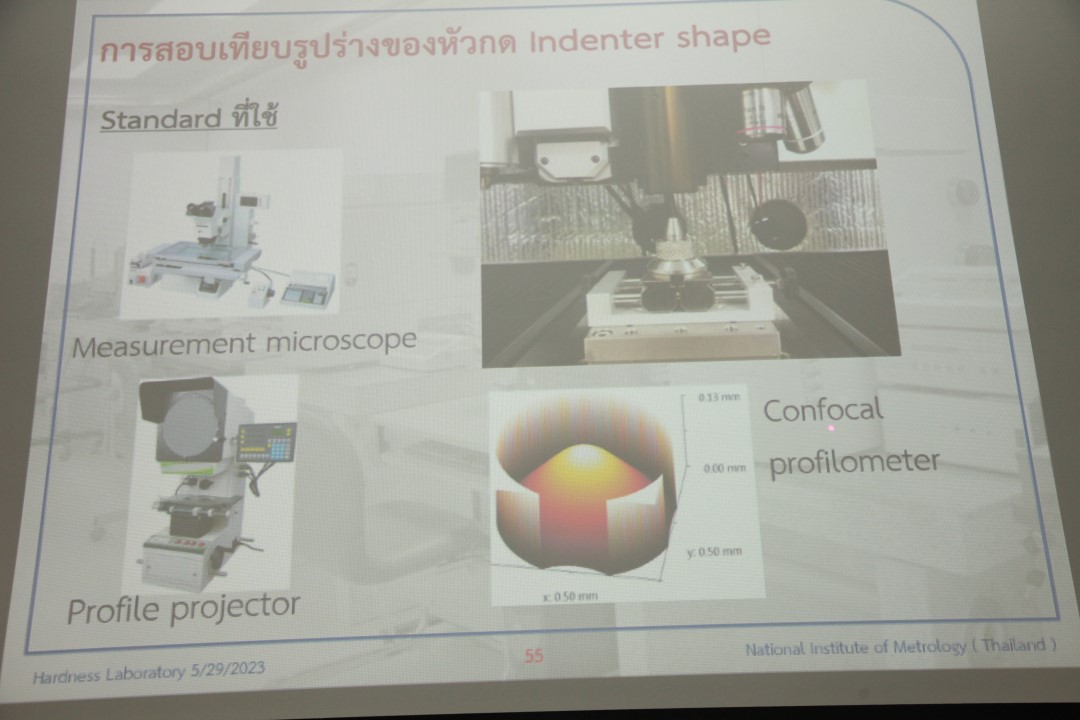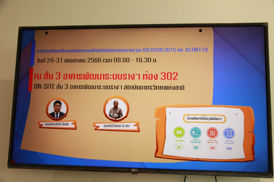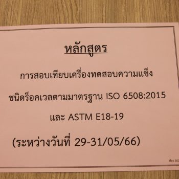 ส่วนฝึกอบรม กลุ่มงานพัฒนาธุรกิจ ฝ่ายนโยบายและยุทธศาสตร์ จัดการอบรมหลักสูตรมาตรวิทยาประจำปี 2566 หลักสูตร “การสอบเทียบเครื่องทดสอบความแข็งชนิดร็อคเวลตามมาตรฐาน ISO 6508:2015 และ ASTM E18-16 : The Calibration of Rockwell Hardness Testing Machine According to ISO 6508-2 : 2015 and ASTM E18-16 ” ที่เหมาะสำหรับหน่วยงานที่มี เครื่องทดสอบความแข็งชนิด Rockwell โดยมีวัตถุประสงค์เพื่อให้ผู้เข้าอบรมทั้งจากภาครัฐ เอกชน และอุตสาหกรรม สามารถบอกหลักการสอบเทียบตามมาตรฐาน ISO 6508-2015 และสอบเทียบเครื่องทดสอบความแข็งชนิด Rockwell ได้ โดยสามารถทำการตรวจสอบระหว่างใช้งานได้ พร้อมทั้งรายงานผลการวัดและค่าความไม่แน่นอนของการวัดได้อย่างถูกต้อง บรรยายโดย นายนิธิวัฒน์ สะสม นักมาตรวิทยาชำนาญการ (วิทยากร) และนายลัทธสิทธิ์ เสือโต นักมาตรวิทยาปฏิบัติการ (ผู้ช่วยวิทยากร) กลุ่มงานกลศาสตร์ของแข็งและการทดสอบ ฝ่ายมาตรวิทยาเชิงกล โดยผู้เข้ารับการอบรมจะได้เรียนรู้เนื้อหาทั้งในภาคทฤษฎี อาทิ หลักการวัดและการทดสอบความแข็งชนิด Rockwell ข้อกำหนดการสอบเทียบตามมาตรฐาน ISO 6508-2015 การสอบเทียบแบบ Direct verification และ Indirect Verification การประเมินค่าความไม่แน่นอนของการวัด และการรายงานผลการสอบเทียบ และการฝึกภาคปฏิบัติ พร้อมทั้งการตอบข้อซัก-ถาม เพื่อให้ผู้เข้าอบรมสามารถนำความรู้ที่ได้ไปประยุกต์ใช้ในการปฏิบัติงานได้จริง ณ ห้องประชุมชั้น 3 อาคารพัฒนามาตรฐานการวัดเพื่อรองรับการพัฒนาระบบราง (มว.) จ.ปทุมธานี