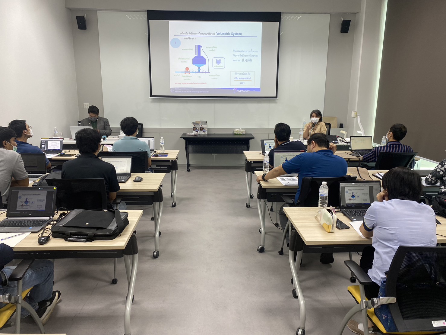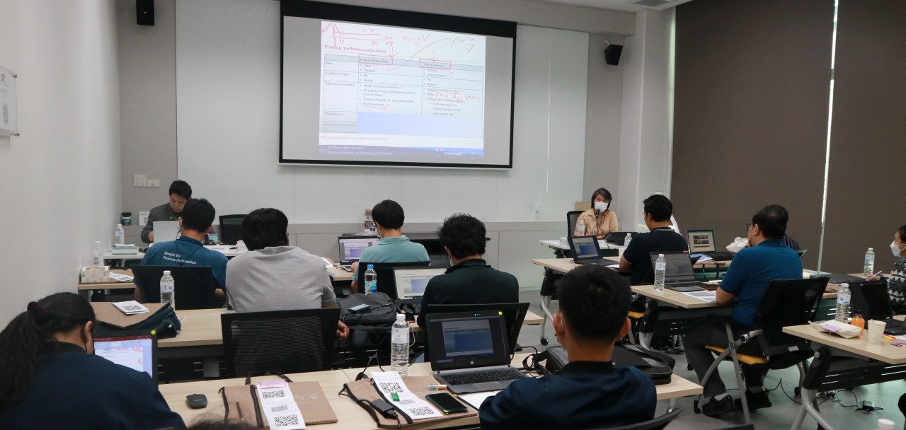 บรรยายโดย ดร.ธีรารักษ์ ชินารักษ์ (วิทยากร) นักมาตรวิทยาชำนาญการพิเศษ และดร.พัชรพล กอกิตรัตนกุล(ผู้ช่วยวิทยากร) นักมาตรวิทยาปฏิบัติการ กลุ่มงานกลศาสตร์ของไหล ฝ่ายมาตรวิทยาเชิงกล โดยผู้เข้ารับการอบรมจะได้เรียนรู้เนื้อหาทั้งในภาคทฤษฎี และภาคปฏิบัติ อาทิ ความรู้เบื้องต้นของการสอบเทียบมาตรวัดน้ำ การทดลองวัดการไหลเบื้องต้น การหาค่า Error และ Correction ความรู้เบื้องต้นเกี่ยวกับการคำนวณความไม่แน่นอนในการวัด ขั้นตอนวิธีการสอบเทียบมาตรวัดน้ำด้วยวิธีมาสเตอร์มิเตอร์ การคำนวณค่าที่เกี่ยวกับการสอบเทียบมาตรวัดน้ำ และการนำผลจากใบสอบเทียบไปใช้งาน พร้อมทั้งการตอบข้อซัก-ถาม เพื่อให้ผู้เข้าอบรมสามารถนำความรู้ที่ได้ไปประยุกต์ใช้ในการปฏิบัติงานได้จริง ณ ห้องประชุมชั้น 3 อาคารพัฒนามาตรฐานการวัดเพื่อรองรับการพัฒนาระบบราง (มว.) จ.ปทุมธานี