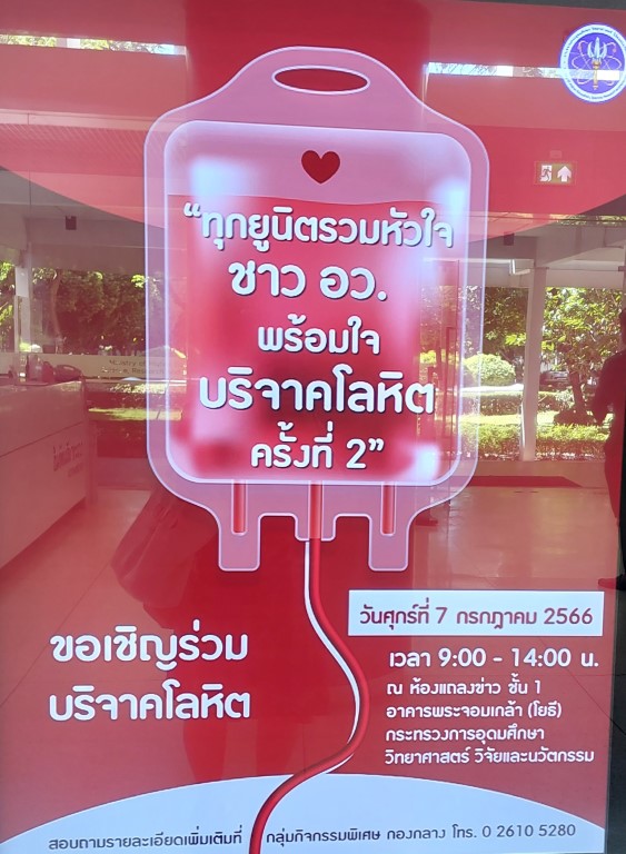 สำนักงานปลัดกระรวงการอุดมศึกษา วิทยาศาสตร์ วิจัยและนวัตกรรม (อว.) จัดกิจกรรมบริจาคโลหิต “ทุกยูนิต รวมหัวใจ ชาว อว. พร้อมใจบริจาคโลหิต” ครั้งที่ 2 โดยมีวัตถุประสงค์เพื่อให้บุคลากรในสังกัดกระทรวงการอุดมศึกษา วิทยาศาสตร์ วิจัยและนวัตกรรม ได้มีกิจกรรมร่วมกัน และเป็นการทำกิจกรรมจิตอาสา อันเป็นสาธารณประโยชน์ ในการนี้พนักงานของสถาบันมาตรวิทยาแห่งชาติ (มว.) ได้เข้าร่วมบริจาคโลหิตด้วย ณ ห้องแถลงข่าวชั้น 1 อาคารพระจอมเกล้า สำนักงานปลัดกระทรวงการอุดมศึกษา วิทยาศาสตร์ วิจัยและนวัตกรรม (โยธี) กรุงเทพฯ