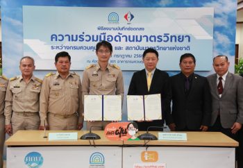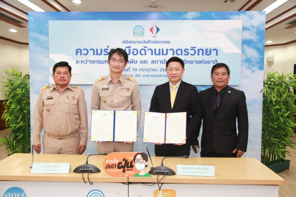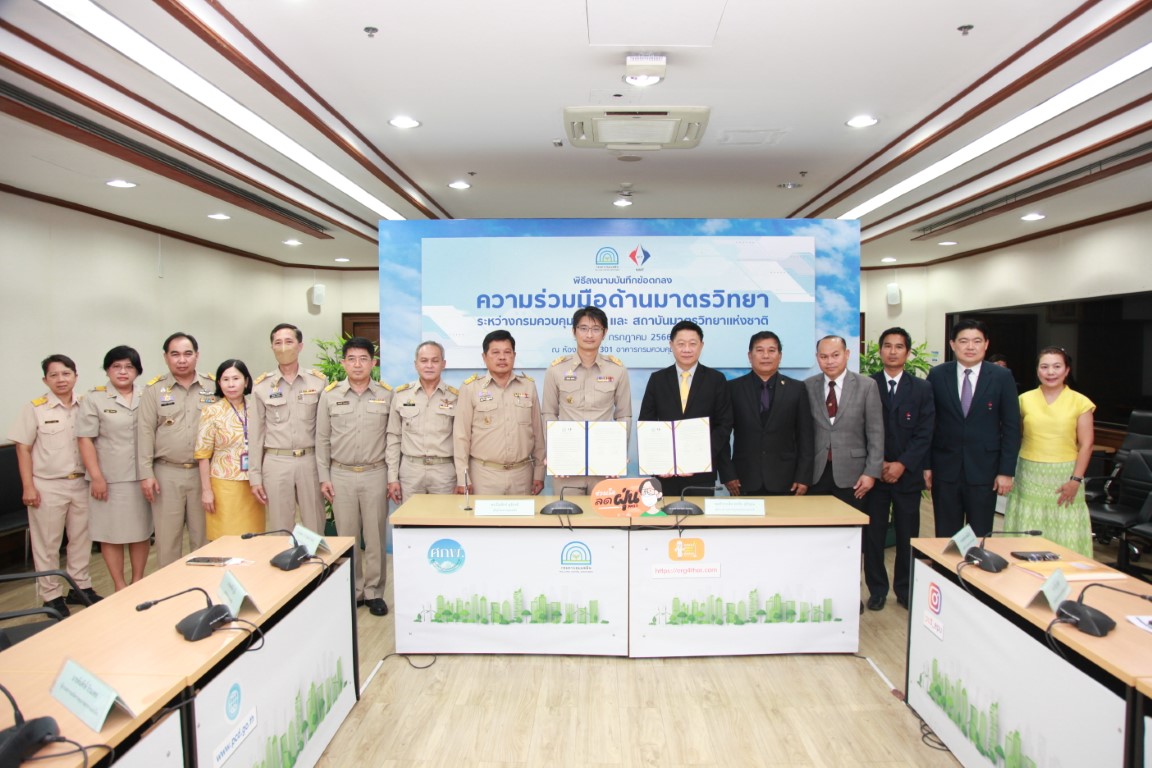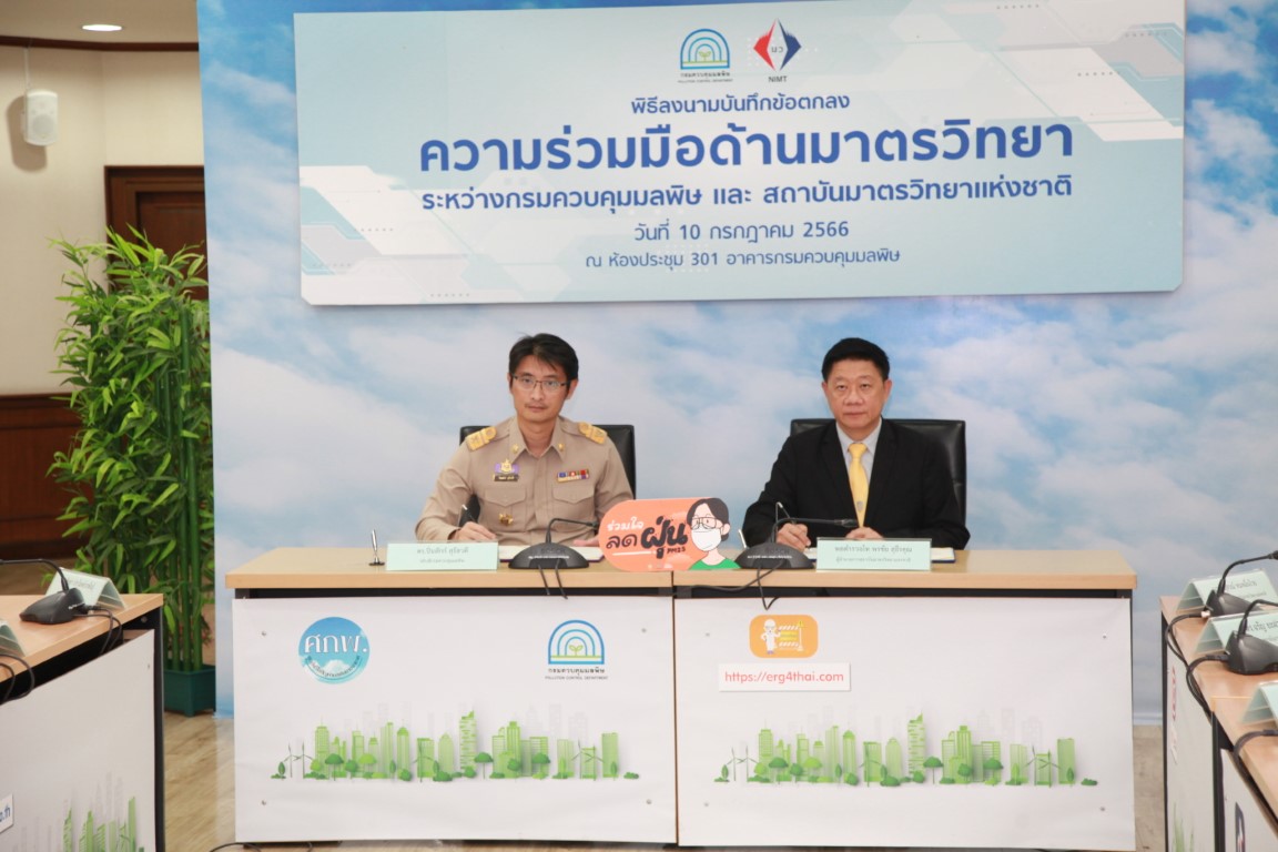10 กรกฎาคม 66: พล.ต.ท. พรชัย สุธีรคุณ ผู้อำนวยการสถาบันมาตรวิทยาแห่งชาติ (มว.) กระทรวงการอุดมศึกษา วิทยาศาสตร์ วิจัยและนวัตกรรม (อว.) และนายปิ่นสักก์ สุรัสวดี อธิบดีกรมควบคุมมลพิษ (คพ.) กระทรวงทรัพยากรธรรมชาติและสิ่งแวดล้อม (ทส.) ร่วมลงนามบันทึกข้อตกลงว่าด้วยความร่วมมือด้านมาตรวิทยา เพื่อสร้างมาตรฐานการวัดที่ก่อให้เกิดประโยชน์กับหน่วยงานที่ปฏิบัติงานในการจัดการปัญหาสิ่งแวดล้อมต่างๆ จากการนำองค์ความรู้หรือแนวทางปฏิบัติในการตรวจวัดคุณภาพสิ่งแวดล้อม การตรวจวัดการระบายมลพิษจากแหล่งกำเนิด นำไปสู่การกำหนดแนวทางปฏิบัติเดียวกันทั่วประเทศ รวมทั้งการนำนวัตกรรมที่เกิดขึ้นจากความร่วมมือครั้งนี้ไปใช้ในการเสริมสร้างความเชื่อมั่นของระบบการวัดที่เป็นมาตรฐานของประเทศและเทียบเท่าสากล ทั้งสองหน่วยงานได้ตระหนักถึงความสำคัญและเห็นชอบร่วมกันในการพัฒนาด้านมาตรวิทยาอย่างต่อเนื่อง โดยความร่วมมือที่จะดำเนินการร่วมกันในช่วง 3 ปี นับตั้งแต่วันนี้ ถึงวันที่ 30 กันยายน 2569 ที่ครอบคลุมประเภทของมลพิษ 4 ด้าน ได้แก่ ด้านการตรวจวัดคุณภาพอากาศ ด้านการตรวจวัดการระบายมลพิษทางอากาศจากแหล่งกำเนิด ด้านการตรวจวัดคุณภาพน้ำ และด้านการตรวจวัดระดับเสียงและความสั่นสะเทือน ณ กรมควบคุมมลพิษ กรุงเทพฯ