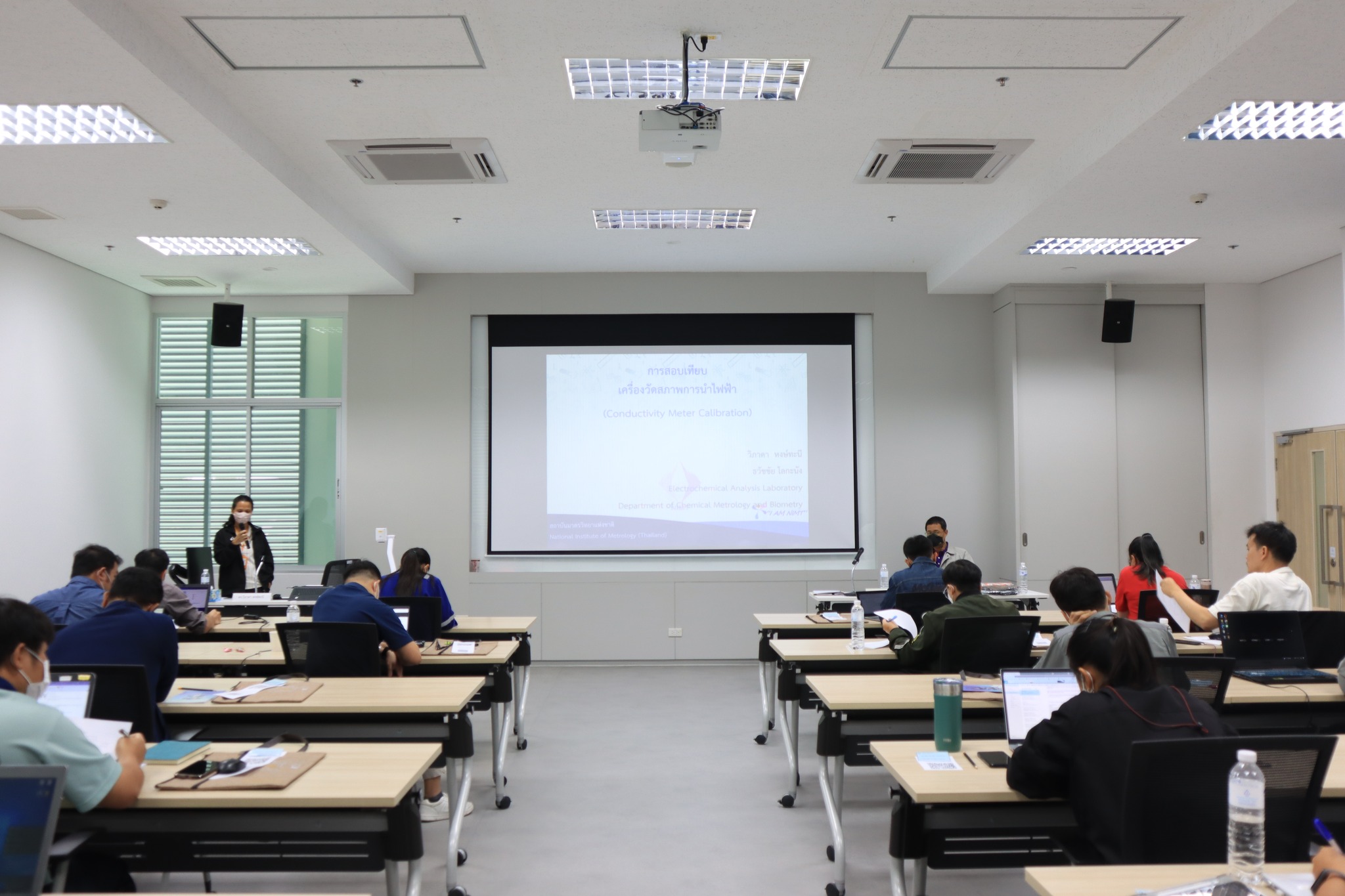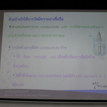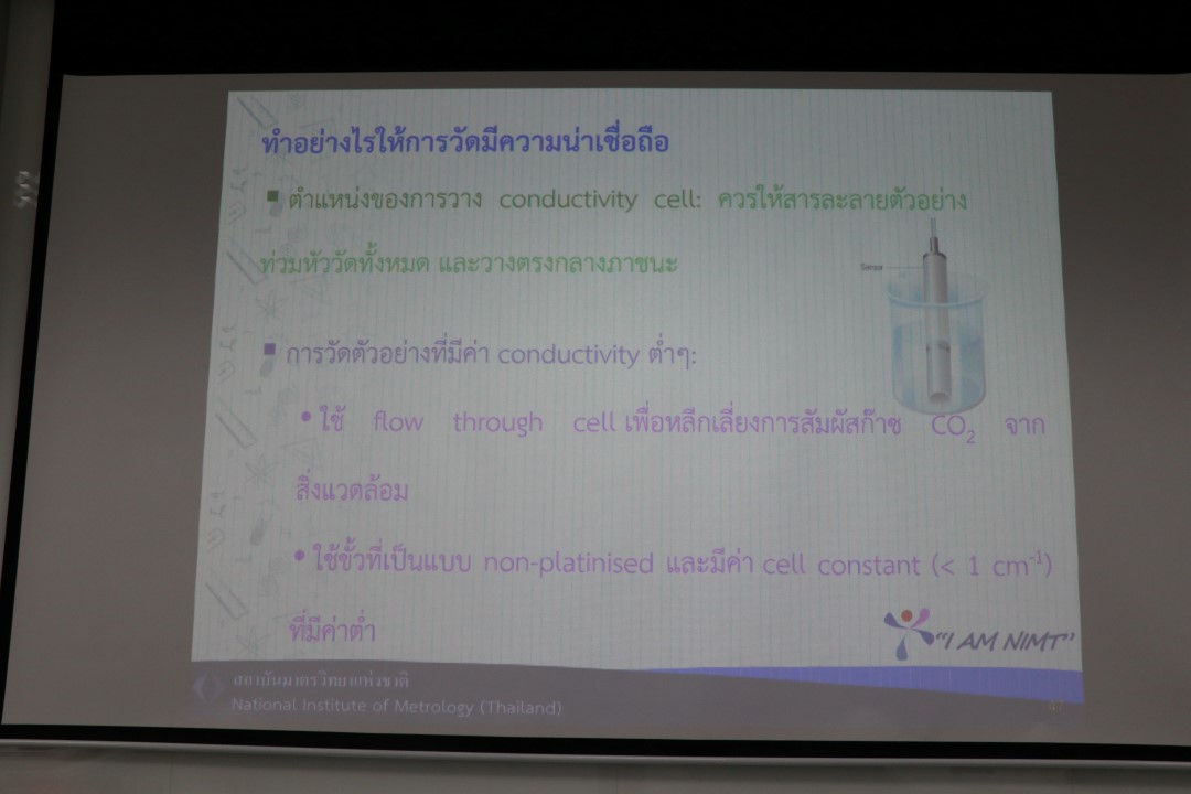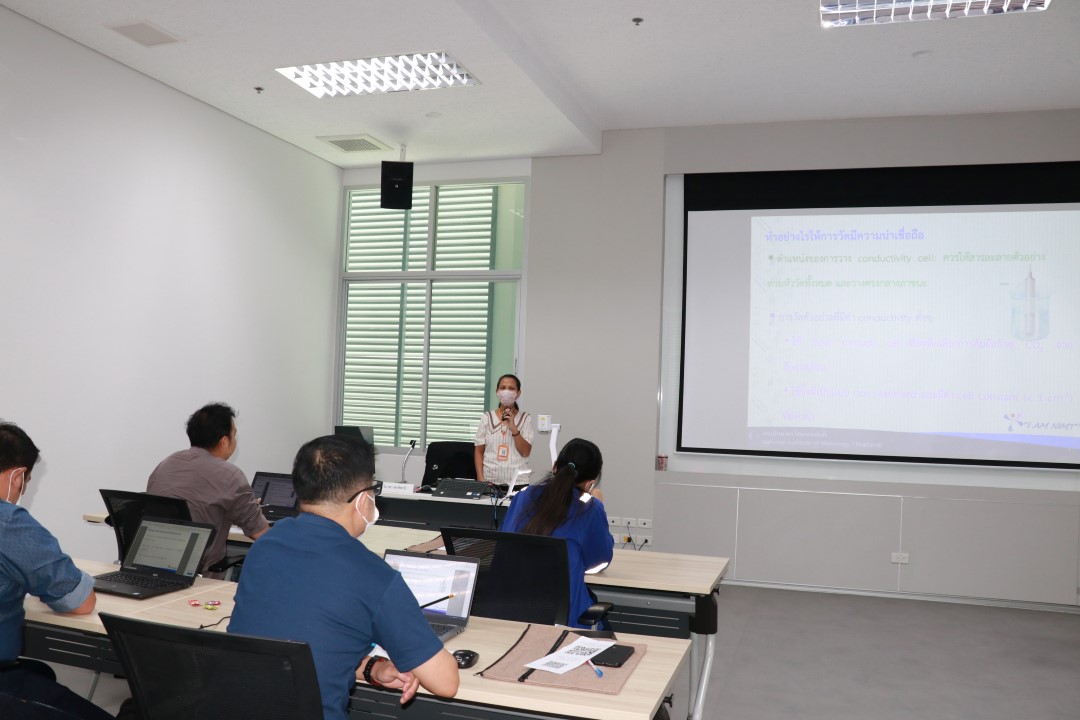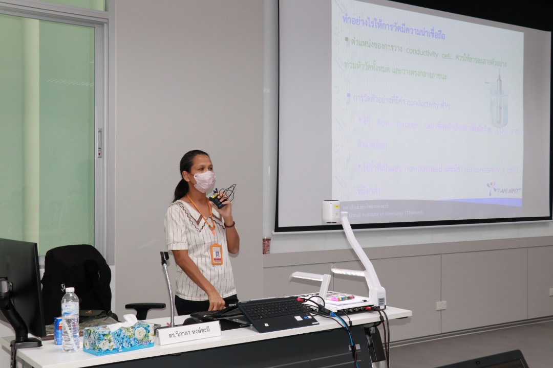 บรรยายโดย ดร.วิภาดา หงษ์ทะนี (วิทยากร) นักมาตรวิทยาชำนาญการ และ นายธวัชชัย โลกะนัง (ผู้ช่วยวิทยากร) นักมาตรวิทยาชำนาญการ กลุ่มงานวิเคราะห์อนินทรีย์เคมี ฝ่ายมาตรวิทยาเคมีและชีวภาพ โดยผู้เข้ารับการอบรมจะได้เรียนรู้เนื้อหาทั้งในภาคทฤษฎี และภาคปฏิบัติ อาทิ ทฤษฎีเบื้องต้นของการวัดและการสอบกลับได้ของการวัดค่า conductivity, องค์ประกอบของเครื่อง conductivity meter, รวมไปถึงวิธีการสอบเทียบเครื่อง conductivity meter และวิธีการคำนวณค่าความไม่แน่นอนของการสอบเทียบ พร้อมทั้งตอบข้อซัก-ถาม เพื่อให้ผู้เข้าอบรมสามารถนำความรู้ที่ได้ไปประยุกต์ใช้ในการปฏิบัติงานได้จริง ณ ห้องประชุมชั้น 3 อาคารพัฒนามาตรฐานการวัดเพื่อรองรับการพัฒนาระบบราง (มว.) จ.ปทุมธานี