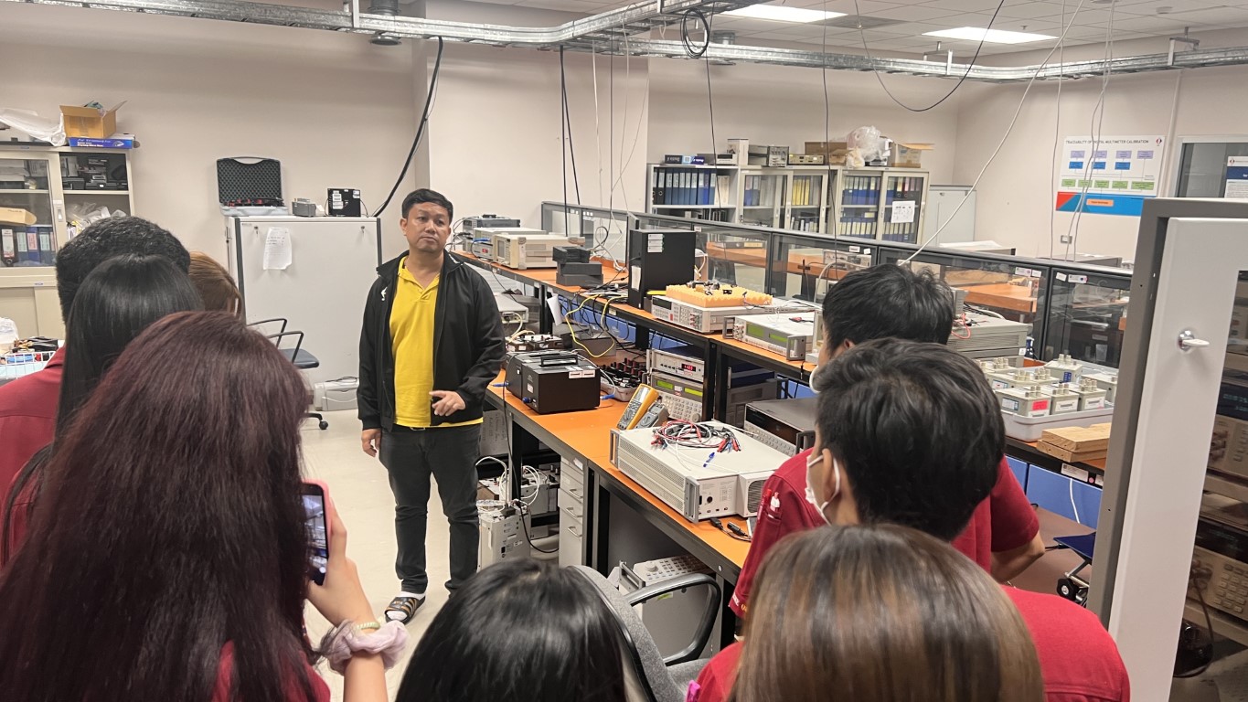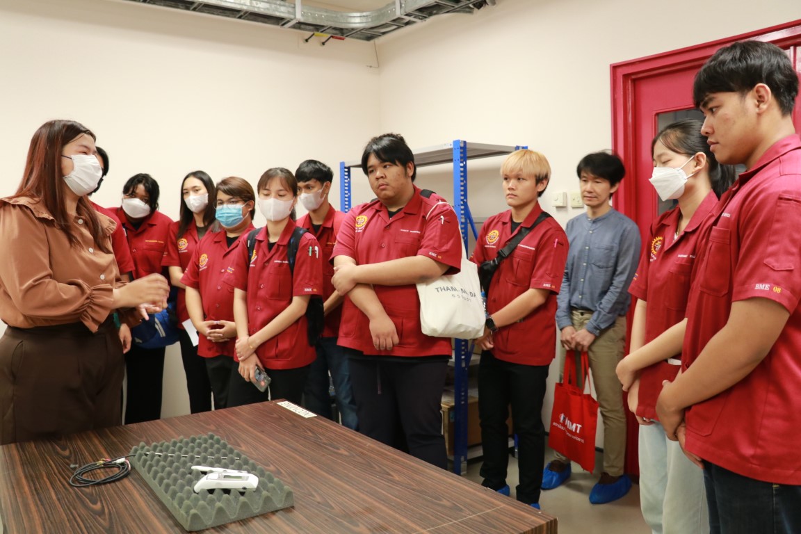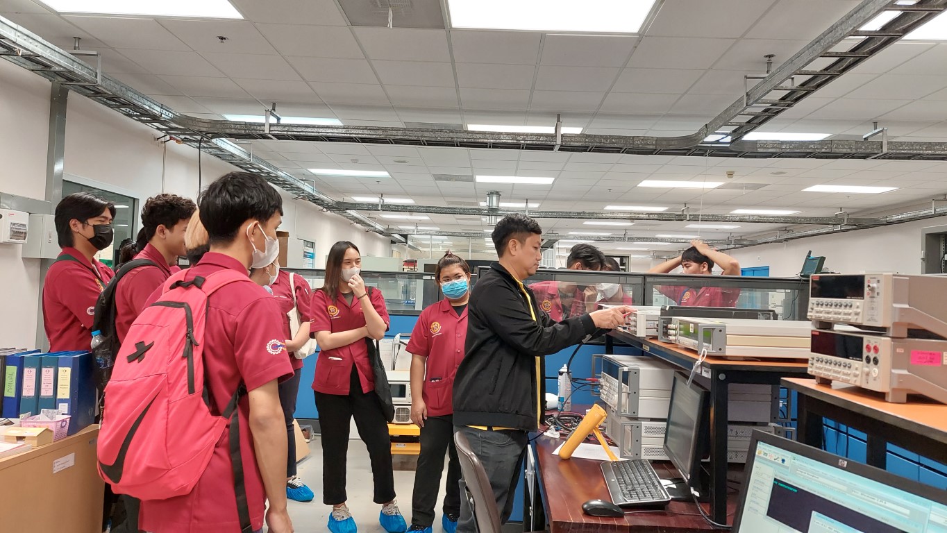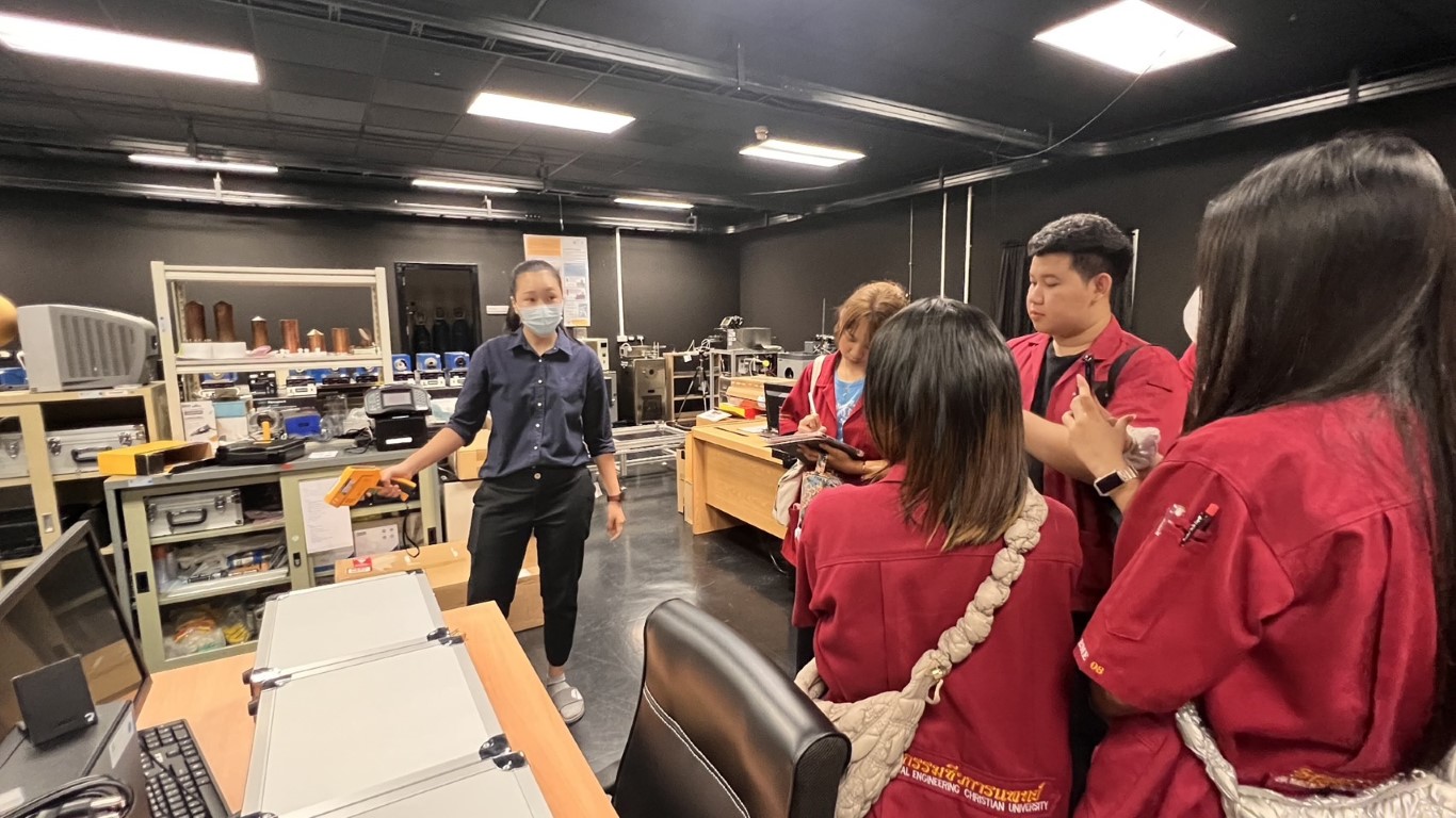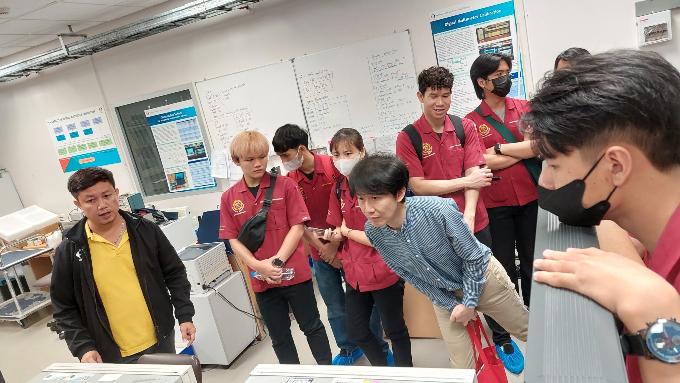 นายสุรเชษฐ เพิ่มฉลาด นักมาตรวิทยาชำนาญการ ฝ่ายมาตรวิทยาไฟฟ้า ให้การต้อนรับ อาจารย์ศุภชัย ยิ่งเจริญ และนักศึกษา สาขาวิชาวิศวกรรมชีวการแพทย์ คณะวิทยาศาสตร์สุขภาพ มหาวิทยาลัยคริสเตียน โดยสาขาวิชาวิศวกรรมชีวการแพทย์ ได้จัดการเรียนการสอนรายวิชา TBME3309 การควบคุมคุณภาพและการบำรุงรักษาอุปกรณ์ทางการแพทย์ และเพื่อให้การเรียนการสอนมีประสิทธิภาพ จึงได้จัดให้มีการเยี่ยมชมห้องปฏิบัติการของสถาบันในครั้งนี้ขึ้น ซึ่งนักศึกษาก็จะได้เรียนรู้จากประสบการณ์จริงของนักมาตรวิทยาในแต่ละห้องปฏิบัติการ อันจะเป็นประโยชน์ต่อการปฏิบัติงานในวิชาชีพต่อไปในอนาคต กิจกรรมการเยี่ยมชมดังกล่าวจัดขึ้น ณ อาคารพัฒนาระบบรางฯ และอาคารผดุงมาตร (มว.) คลองห้า จังหวัดปทุมธานี