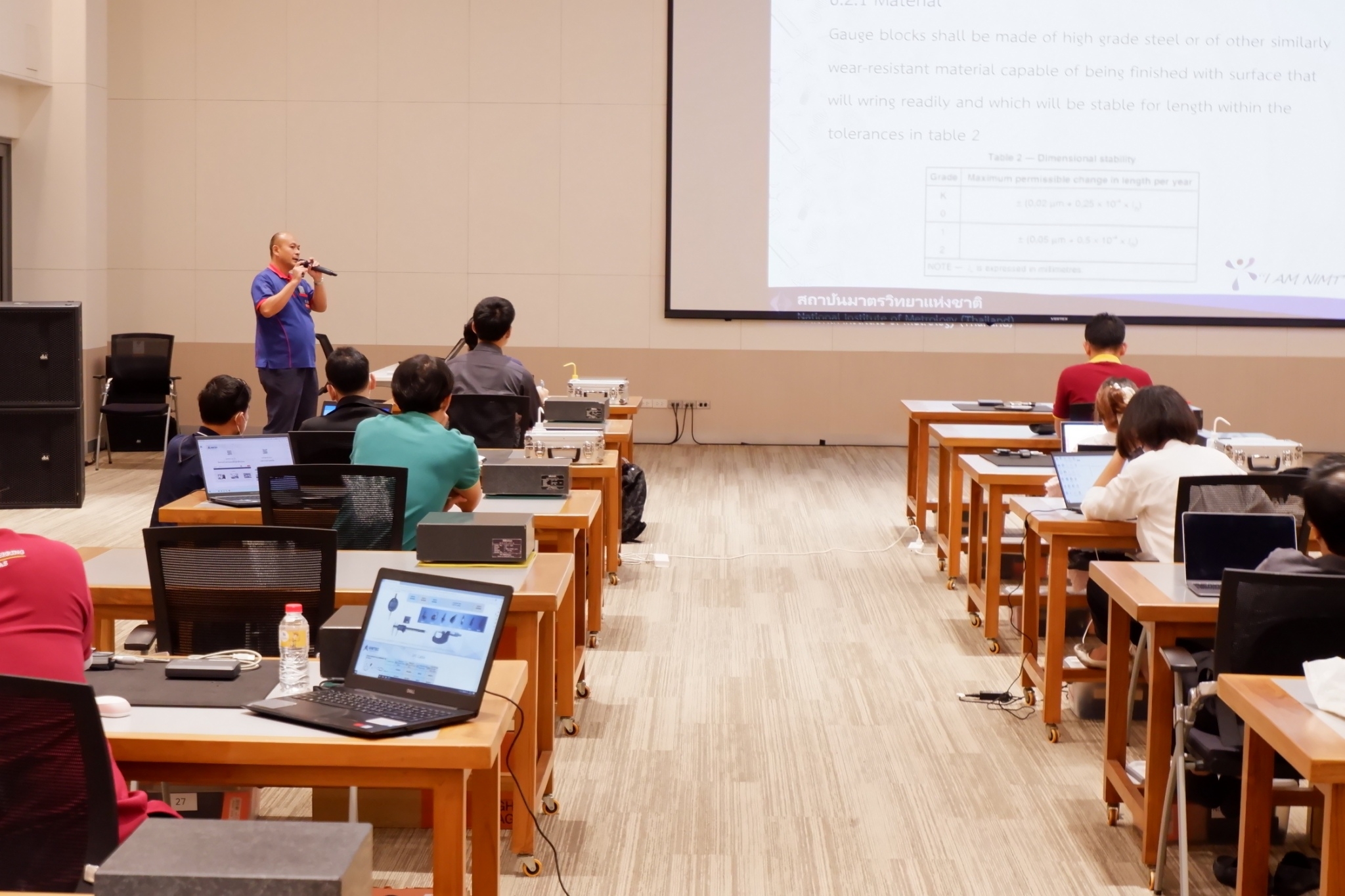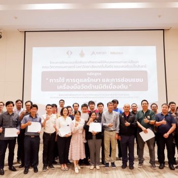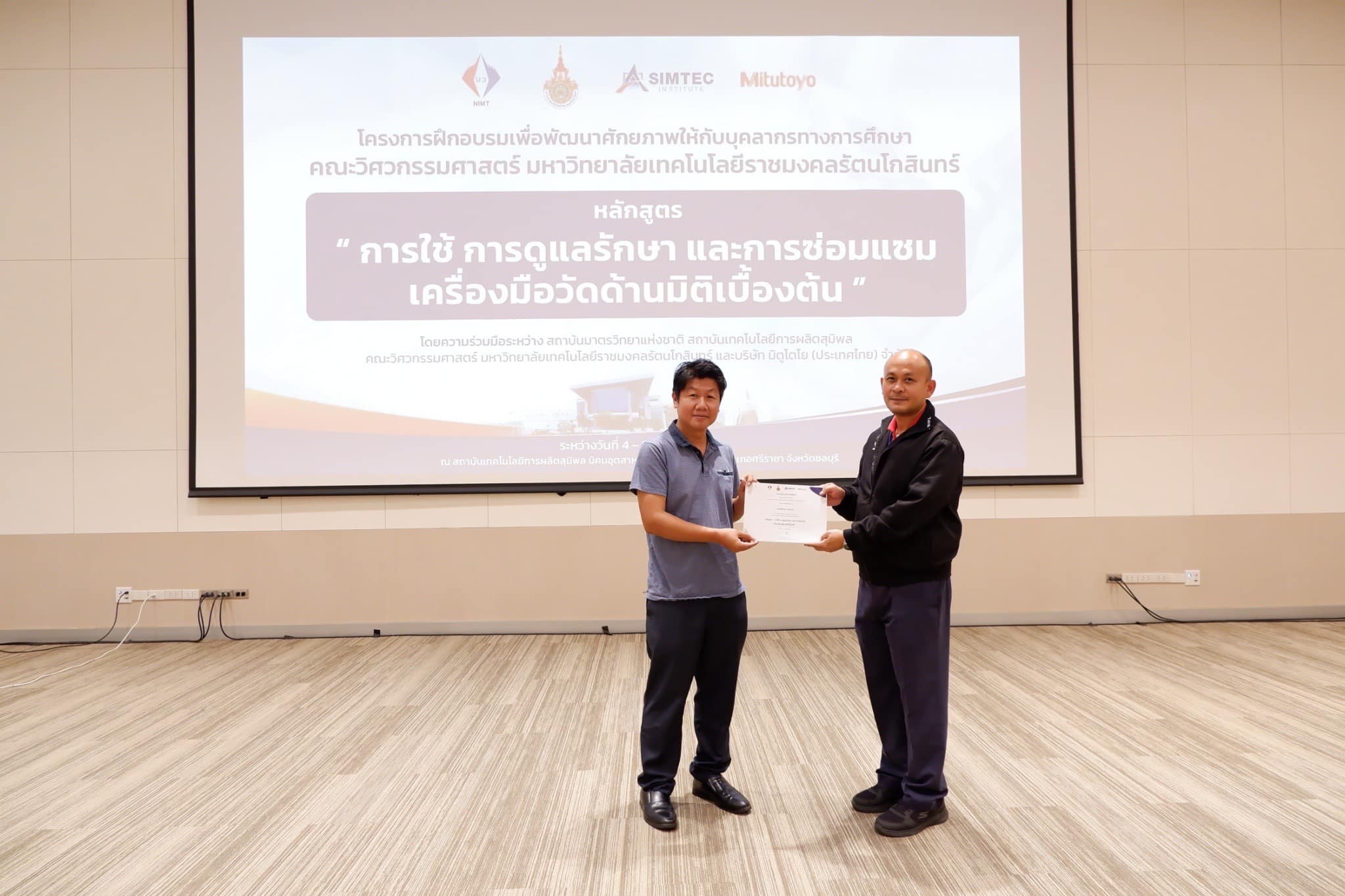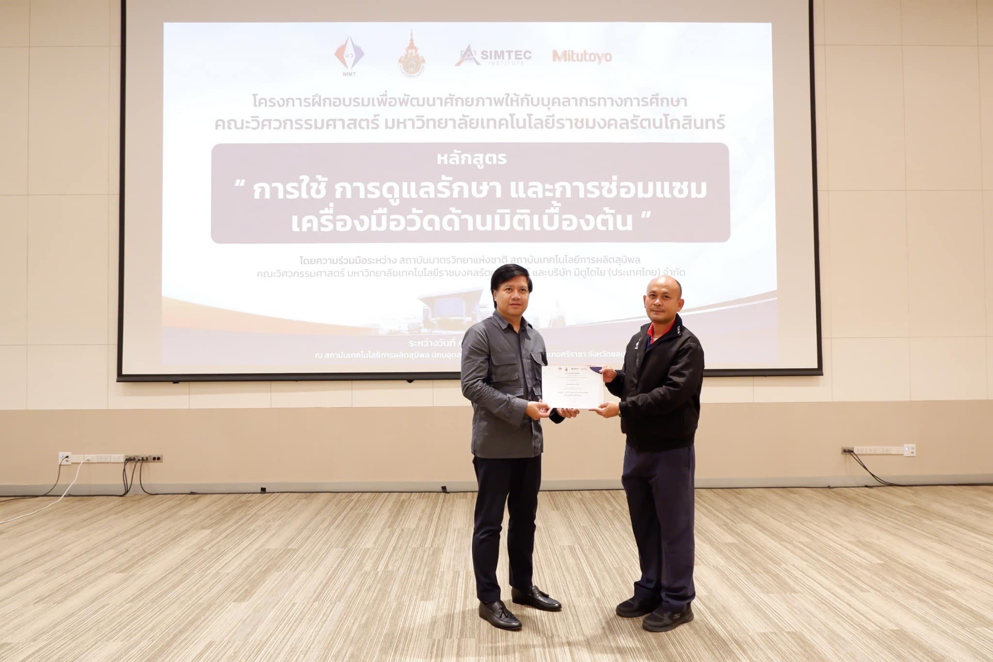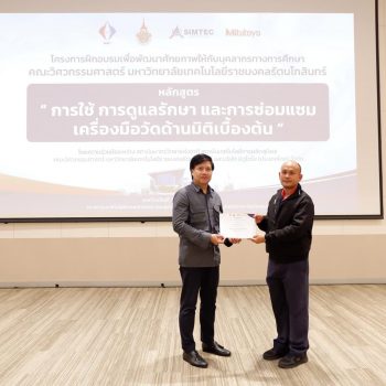 ฝ่ายมาตรวิทยามิติ สถาบันมาตรวิทยาแห่งชาติ (มว.) ร่วมกับคณะวิศวกรรมศาสตร์ มหาวิทยาลัยเทคโนโลยีราชมงคลรัตนโกสินทร์ สถาบันเทคโนโลยีการผลิตสุมิพล (SIMTEC) และบริษัท มิตูโตโย (ประเทศไทย) จำกัด จัดโครงการฝึกอบรมเพื่อพัฒนาศักยภาพให้กับบุคลากรทางการศึกษาคณะวิศวกรรมศาสตร์ มหาวิทยาลัยเทคโนโลยีราชมงคลรัตนโกสินทร์ ในหลักสูตร “การใช้ การดูแลรักษาและการซ่อมแซมเครื่องมือวัดด้านมิติเบื้องต้น” ระหว่างวันที่ 4 – 6 ตุลาคม 2566 โดยมีวัตถุประสงค์ในการเสริมความรู้และทักษะ ตลอดจนการจัดการพัฒนาหลักสูตรให้เป็นไปตามมาตรฐานและนวัตกรรมเทคโนโลยีการวัดให้สอดคล้องกับอุตสาหกรรมการผลิตยุคใหม่ ทั้งนี้เพื่อให้บุคลากรภาคการศึกษามีความรู้ ความเข้าใจที่ถูกต้องด้านการวัดและสามารถส่งต่อองค์ความรู้ไปยังผู้ที่เกี่ยวข้องได้อย่างเป็นรูปธรรมต่อไป ณ สถาบันเทคโนโลยีการผลิตสุมิพล (SIMTEC) จ.ชลบุรี