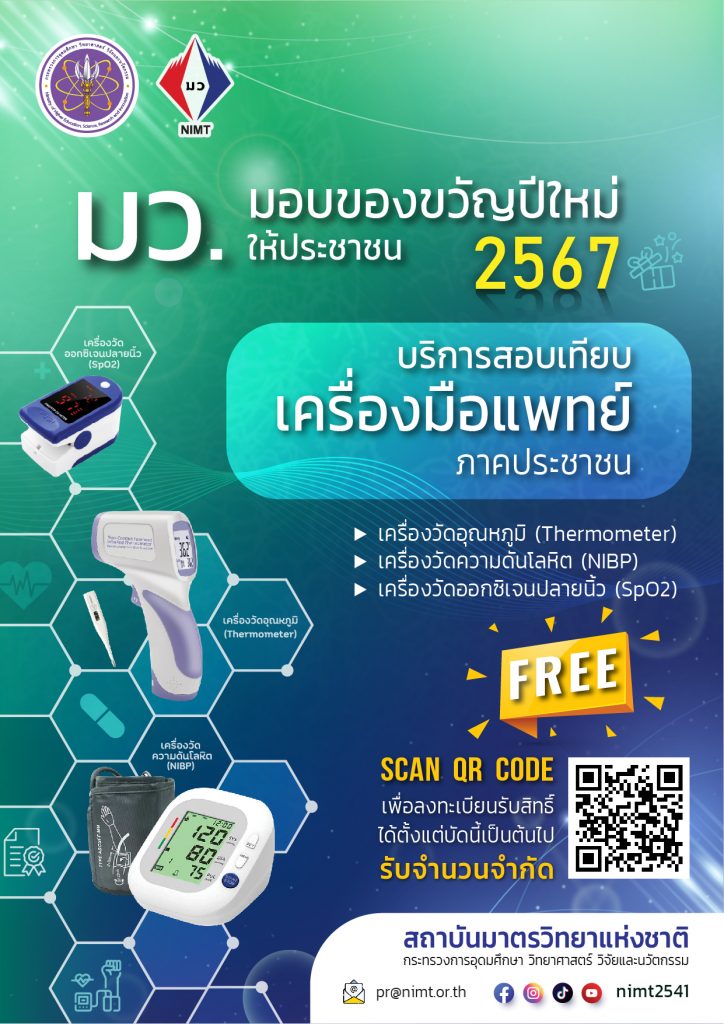 14 ธันวาคม 2566 : พล.ต.ท. นพ.พรชัย สุธีรคุณ ผู้อำนวยการสถาบันมาตรวิทยาแห่งชาติ (มว.) กระทรวงการอุดมศึกษา วิทยาศาสตร์ วิจัยและนวัตกรรม (อว.) นำทีมผู้เชี่ยวชาญให้บริการสอบเทียบเครื่องมือแพทย์พื้นฐานสำหรับประชาชน พร้อมออกใบรายงานผลการวัด โดยไม่มีค่าใช้จ่าย เป็นการมอบของขวัญปีใหม่ 2567 ให้ประชาชน ภายใต้กิจกรรม “บริการสอบเทียบเครื่องมือแพทย์ภาคประชาชน” เพื่อเป็นการพิสูจน์ว่ามาตรฐานเครื่องมือแพทย์พื้นฐานสำหรับประชาชนที่ใช้อยู่ทั่วไปให้ค่าความแม่นยำที่ถูกต้องตามมาตรฐานเป็นที่ยอมรับ เพื่อสุขภาพที่ดีของประชาชน