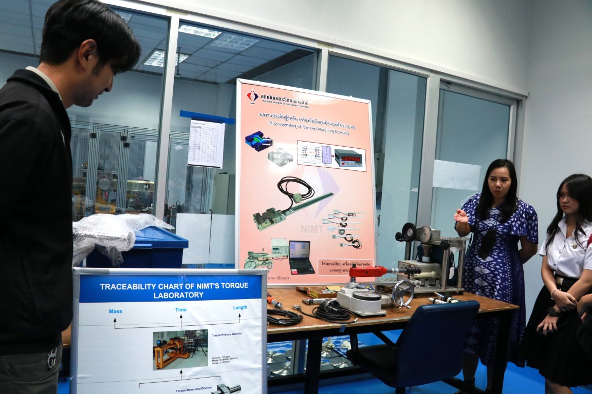นายศมน เพี้ยงบางยาง ผู้ช่วยหัวหน้าฝ่ายมาตรวิทยามิติ พร้อมด้วยนักมาตรวิทยา ฝ่ายมาตรวิทยามิติ ให้การต้อนรับ ดร.จินดาวรรณ จันทมาส อาจารย์และนักศึกษาจากสาขาวิชาวิทยาศาสตร์ศึกษา คณะวิทยาศาสตร์และเทคโนโลยี มหาวิทยาลัยราชภัฏพระนครศรีอยุธยา ในโอกาสเข้าเยี่ยมชมห้องปฏิบัติการของสถาบัน โดยมีวัตถุประสงค์เพื่อให้นักศึกษาได้มีความรู้ความเข้าใจเกี่ยวกับมาตรฐานการวัด และวัสดุอ้างอิง การวิเคราะห์ ทดสอบ และสอบเทียบในประเทศ ซึ่งสอดคล้องกับวิชาการวัดและเครื่องมือวัดทางฟิสิกส์ที่นักศึกษาได้เรียน กิจกรรมดังกล่าวจัดขึ้น ณ อาคารผดุงมาตร และอาคารสำนักงานกลาง (มว.) คลองห้า จังหวัดปทุมธานี
