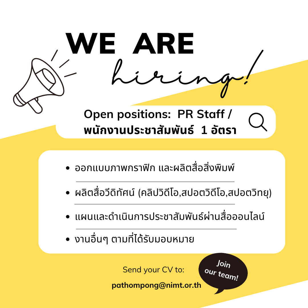 ผู้สนใจสามารถส่ง CV มาที่นายปฐมพงษ์ กิตติสาร กลุ่มงานบริหารและพัฒนาทรัพยากรบุคคล สถาบันมาตรวิทยาแห่งชาติ, email: pathompong@nimt.or.th หรือสอบถามรายละเอียดเพิ่มเติมได้ที่ 02 -577-5100 ต่อ 4112