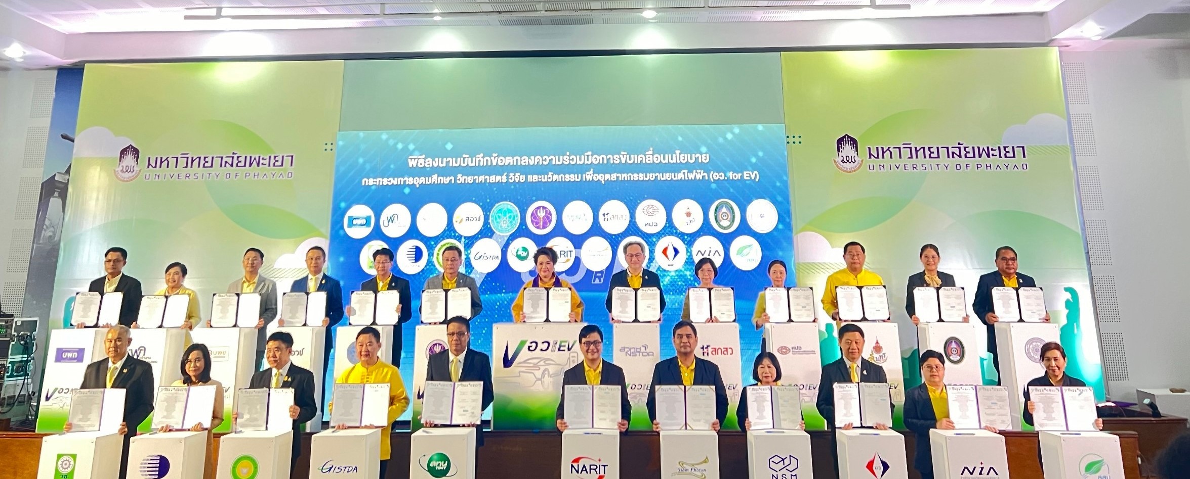 น.ส.ศุภมาส อิศรภักดี รมว.การอุดมศึกษา วิทยาศาสตร์ วิจัยและนวัตกรรม (อว.) เป็นประธานในพิธีลงนามข้อตกลงความร่วมมือการขับเคลื่อนนโยบาย อว. For EV ของ 23 หน่วยงานสังกัดกระทรวง อว. เพื่อขับเคลื่อนประเทศไทยไปเป็น EV HUB ที่ใหญ่ที่สุดในภูมิภาคเอเชียแปซิฟิค โดยมี น.ส.สุชาดา แทนทรัพย์ เลขานุการ รมว.อว นายเพิ่มสุข สัจจาภิวัฒน์ ปลัด อว. ศ.ดร.ศุภชัย ปทุมนากุล รองปลัด อว. พร้อมผู้บริหาร อว. เข้าร่วม ที่มหาวิทยาลัยพะเยา จ.พะเยา ระหว่างการลงพื้นที่ติดตามการดำเนินงานของกระทรวง อว. ภายใต้การประชุมคณะรัฐมนตรี (ครม.) สัญจร กลุ่มจังหวัดภาคเหนือตอนบน 2 (เชียงราย พะเยา แพร่ น่าน)