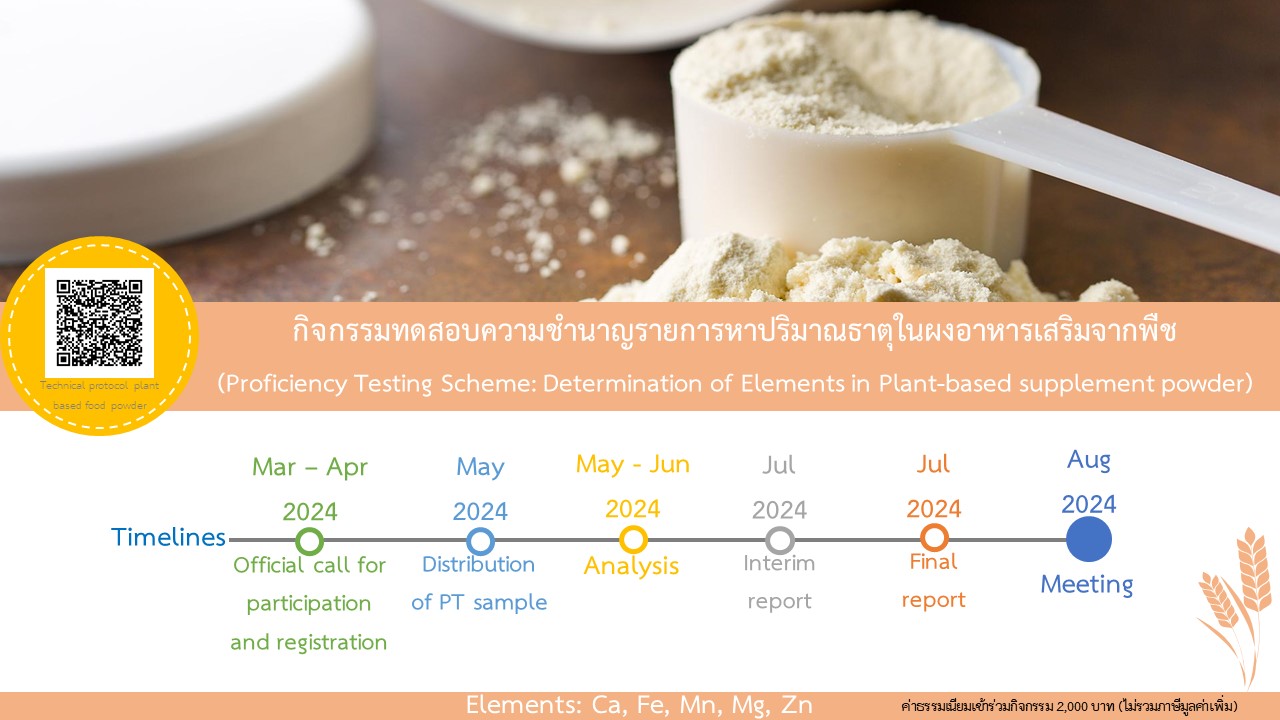 สำหรับโปรแกรมทดสอบความชำนาญการหาปริมาณธาตุในผงอาหารเสริมจากพืช รวม 5 ธาตุ ได้แก่ Ca, Fe, Mg, Mn และ Zn มีรายละเอียดตามเอกสาร Technical Protocol