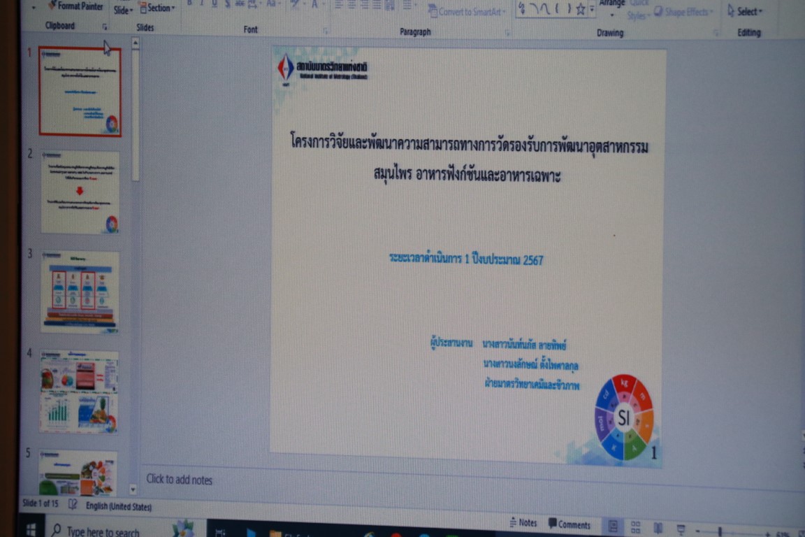 ดร.จรัญ ยะฝา ผู้ช่วยผู้อำนวยการ มว. และนางสาวพริมา เกิดอุดม ผู้จัดการฝ่ายนโยบายและยุทธศาสตร์ สถาบันมาตรวิทยาแห่งชาติ (มว.) พร้อมด้วยนักมาตรวิทยาจากฝ่ายมาตรวิทยาเคมีและชีวภาพ เจ้าหน้าที่จากงานอบรม กลุ่มงานพัฒนาธุรกิจ ฝ่ายนโยบายและยุทธศาสตร์ ให้การต้อนรับ ดร.จันทร์เพ็ญ เมฆาอภิรักษ์ ผู้ตรวจราชการกระทรวง พร้อมทีมงานในโอกาสเข้าตรวจราชการโครงการตามยุทธศาสตร์กระทรวงการอุดมศึกษา วิทยาศาสตร์ วิจัยและนวัตกรรม ของสถาบันมาตรวิทยาแห่งชาติ ประจำปีงบประมาณ พ.ศ. 2567 จำนวน 2 โครงการ ได้แก่ โครงการวิจัยและพัฒนาความสามารถทางการวัดรองรับการพัฒนาอุตสาหกรรมสมุนไพร อาหารฟังก์ชัน และอาหารเฉพาะ และโครงการการยกระดับศักยภาพอุตสาหกรรมไทยด้วยเทคโนโลยีมาตรวิทยา รวมถึงการเยี่ยมชมห้องปฏิบัติการของฝ่ายมาตรวิทยาเคมีและชีวภาพ ณ อาคารมาตรธำรง ส่วนกิจกรรมการประชุมจัดขึ้น ณ อาคารผดุงมาตร (มว.) คลองห้า จังหวัดปทุมธานี