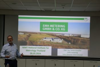พ.อ.อ.วรพล พระภักดี และดร.ธัญญา คชวัฒน์ นักมาตรวิทยาชำนาญการพิเศษ กลุ่มงานไฟฟ้ากำลังและเครื่องวัดไฟฟ้าความถูกต้องสูง ฝ่ายมาตรวิทยาไฟฟ้า มว. ให้การต้องรับ คุณนิชา ลาภวิสุทธิสาโรจน์ ผู้จัดการ บริษัทแอมพ์ทรอนอินสทรูเม็นทส์ (ประเทศไทย) จำกัด ตัวแทนจำหน่ายมิเตอร์ไฟฟ้า แบรนด์ EMH Metering จากประเทศเยอรมนี และ Mr. Detlef Einacker, Director International Sales Department, EMH metering ในโอกาสเข้ามาแนะนำอุปกรณ์มิเตอร์ไฟฟ้า ที่ใช้ในระบบชาร์จของรถ EV รุ่น iML e-moc และรุ่น eHZB e-moc ซึ่งเป็นเทคโนโลยีใหม่ๆ ให้แก่ นักมาตรวิทยา ฝ่ายมาตรวิทยาไฟฟ้า เจ้าหน้าที่จากศูนย์ทดสอบผลิตภัณฑ์ไฟฟ้าและอิเล็กทรอนิกส์ (PTEC) เจ้าหน้าที่จากสถาบันไฟฟ้าและอิเล็กทรอนิกส์ (EEI) เจ้าหน้าที่กองชั่ง ตวง วัด เจ้าหน้าที่จากการไฟฟ้านครหลวง เจ้าหน้าที่จากกาไฟฟ้าฝ่ายผลิตแห่งประเทศไทย กิจกรรมดังกล่าวจัดขึ้น ณ อาคารมาตรธำรง (มว.) คลองห้า จังหวัดปทุมธานี