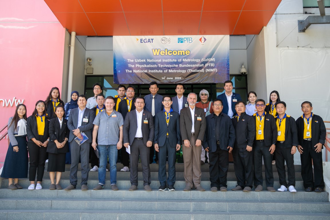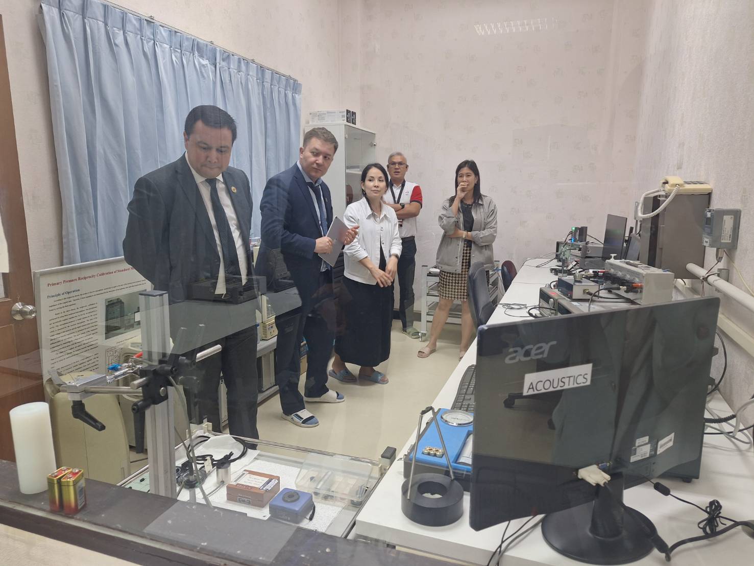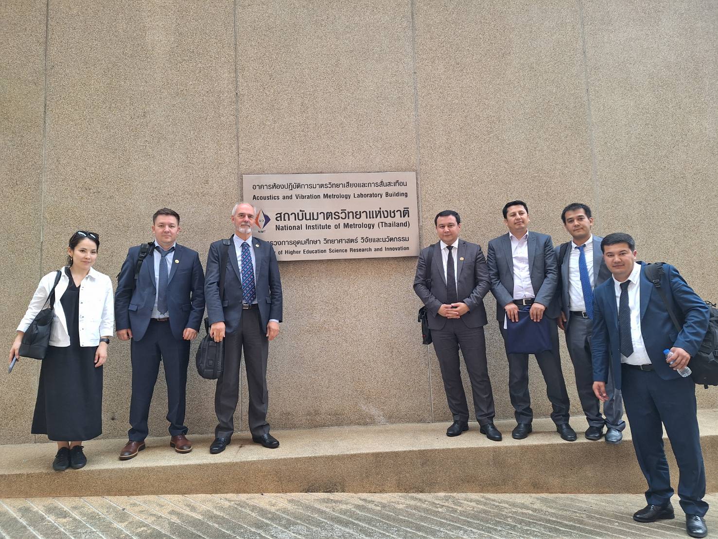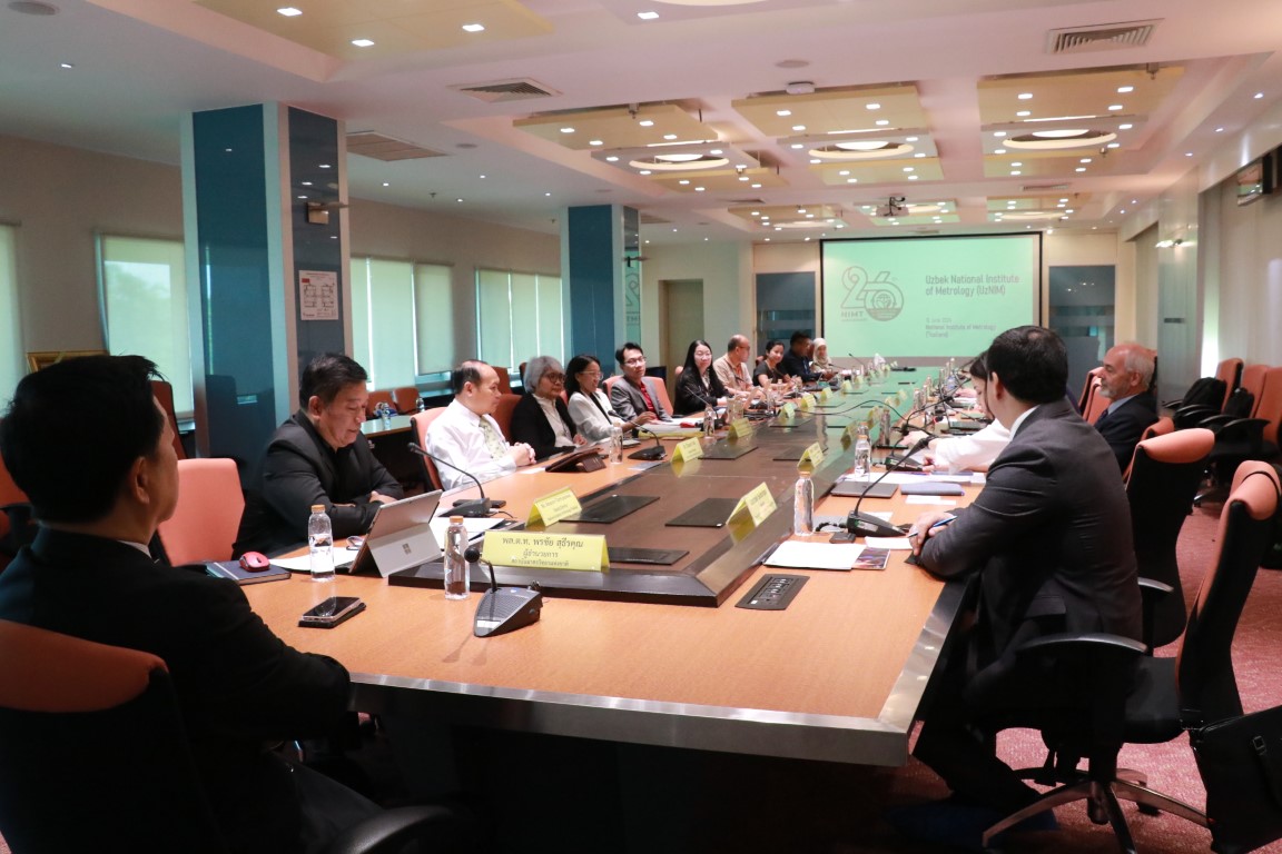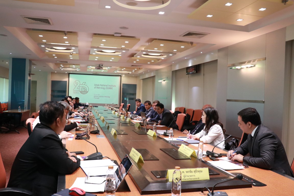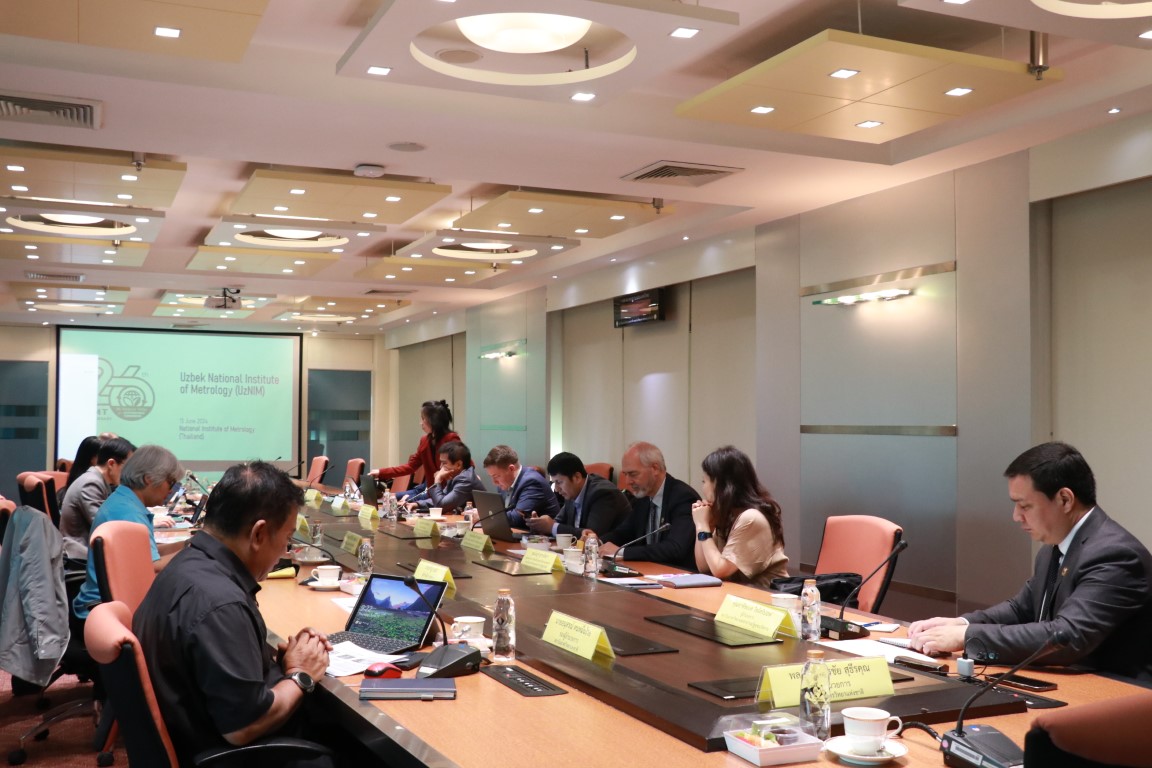 พล.ต.ท.นพ.พรชัย สุธีรคุณ ผู้อำนวยการ พร้อมด้วย นายอนุสรณ์ ทนหมื่นไวย รองผู้อำนวยการ ดร.จรัญ ยะฝา ผู้ช่วยผู้อำนวยการ หัวหน้าฝ่าย รักษาการหัวหน้าฝ่าย และเจ้าหน้าที่ มว. ให้การต้อนรับ Mr. Lazizbek Furkatjanovich Saidoripov ผู้อำนวยการ The Uzbek National Institute of Metrology (UzNIM), ประเทศอุซเบกิสถาน พร้อมทีมงาน Dr.-Ing. Clemens Sanetra ผู้เชี่ยวชาญระยะยาวสำหรับโครงสร้างพื้นฐานทางคุณภาพ PTB และ Ms. Aynur Khusanovna Turabekova ผู้แทนโครงการท้องถิ่นในอุซเบกิสถานและล่าม ในโอกาสเข้าศึกษาดูงาน รับคำปรึกษา และเรียนรู้ประสบการณ์จากสถาบันมาตรวิทยาของประเทศไทย รวมทั้งเยี่ยมชมห้องปฏิบัติการของสถาบัน สำนักงานกลางชั่ง ตวง วัด (กรมการค้าภายใน) การไฟฟ้าฝ่ายผลิตแห่งประทศไทย และสมาคมส่งเสริมเทคโนโลยี (ไทย-ญี่ปุ่น) โดยกิจกรรมการหารือ ศึกษาดูงาน และเยี่ยมชมห้องปฏิบัติการของสถาบัน จัดขึ้น ณ อาคารผดุงมาตร อาคารพัฒนาระบบราง และอาคารมาตรธำรง (มว.) คลองห้า จังหวัดปทุมธานี