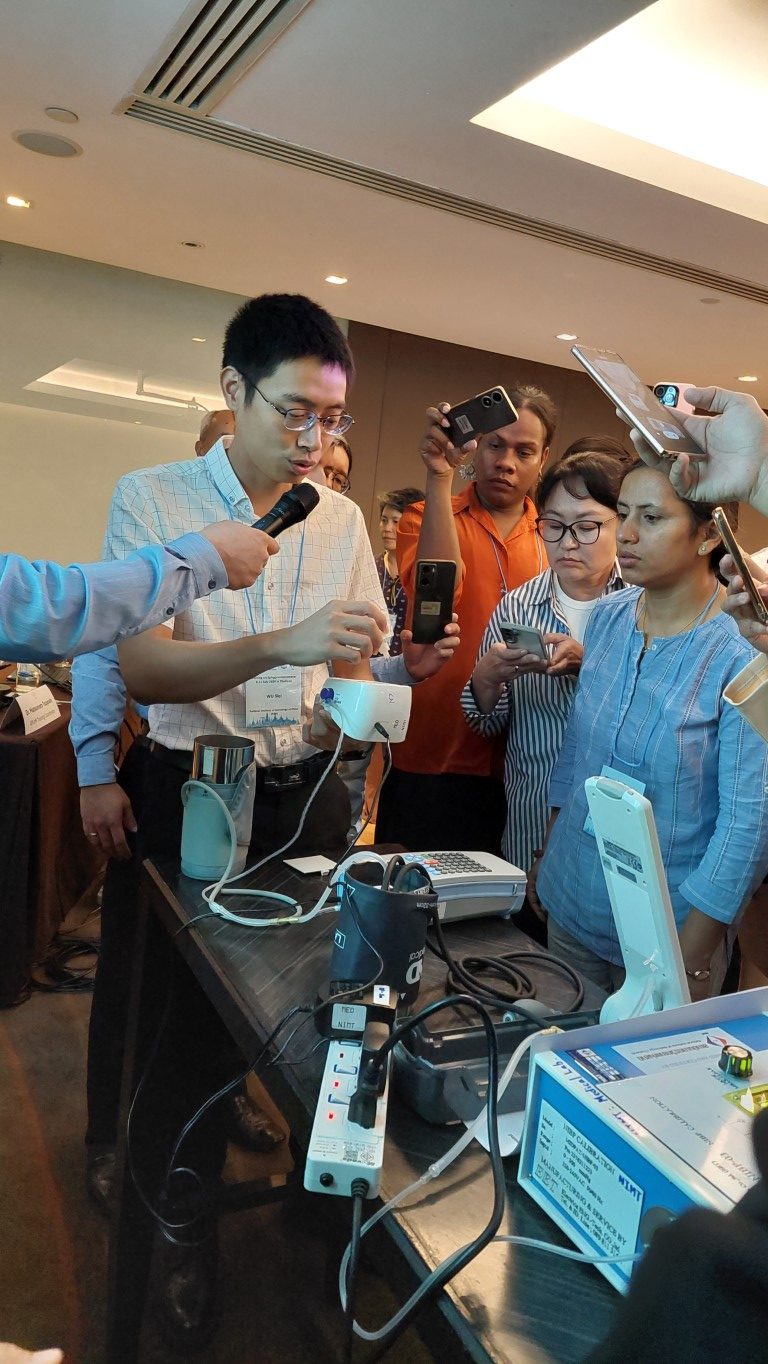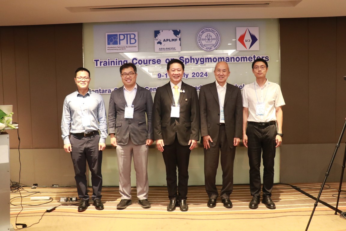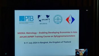 กระทรวงการอุดมศึกษา วิทยาศาสตร์ วิจัยและนวัตกรรม (อว.) สถาบันมาตรวิทยาแห่งชาติ (มว.) โดย พล.ต.ท.นพ.พรชัย สุธีรคุณ ผู้อำนวยการ พร้อมด้วยนายอนุสรณ์ ทนหมื่นไวย รองผู้อำนวยการ ดร.จริยา บัวเจริญ กำกับดูแลงานวิเทศสัมพันธ์ และนักมาตรวิทยาจากกลุ่มเครื่องมือแพทย์ ให้การต้อนรับผู้เข้าอบรม MEDEA : Metrology – Enabling Developing Economies in Asia; APLMF/APMP Training Course on Sphygmomanometers ซึ่งหัวข้อหลักในการฝึกอบรมครั้งนี้ประกอบด้วย 1. การบรรยายรายละเอียดต่าง ๆ ในวิธีการมาตรฐานท้ง 2 (OIML R148 และ OIML R149 2. การบรรยายรายละเอียดวิธีการมาตรฐานขอประเทศจีนตาม JJG692-2010 ที่ประกอบด้วยวิธีการดำเนินการ เครื่องมือและอุปกรณ์ที่เกี่ยวข้อง 3. การฝึกอบรมได้ฝึกปฏิบัติการทดสอบ sphygmomanometers ตามวิธีการมาตรฐานของประเทศจีน (JJG692-2010) ใน 3 หัวข้อด้วยกันคือ MPE test, Leak Test และ Repeatability of blood pressure indicator โดยใช้เครื่องมือของ มว. ในการฝึกปฏิบัติ 4. การบรรยาการคำนวณผล การประเมินความไม่แน่นอน และการรายงานผลการวัด นอกจากนั้น ในการฝึกอบรมครั้งนี้ได้มีการนำเสนอความคืบหน้าการวิจัยระบบการสอบกลับได้สำหรับการสอบเทียบ NIBP Simulator ซึ่งดำเนินการโดย KRISS