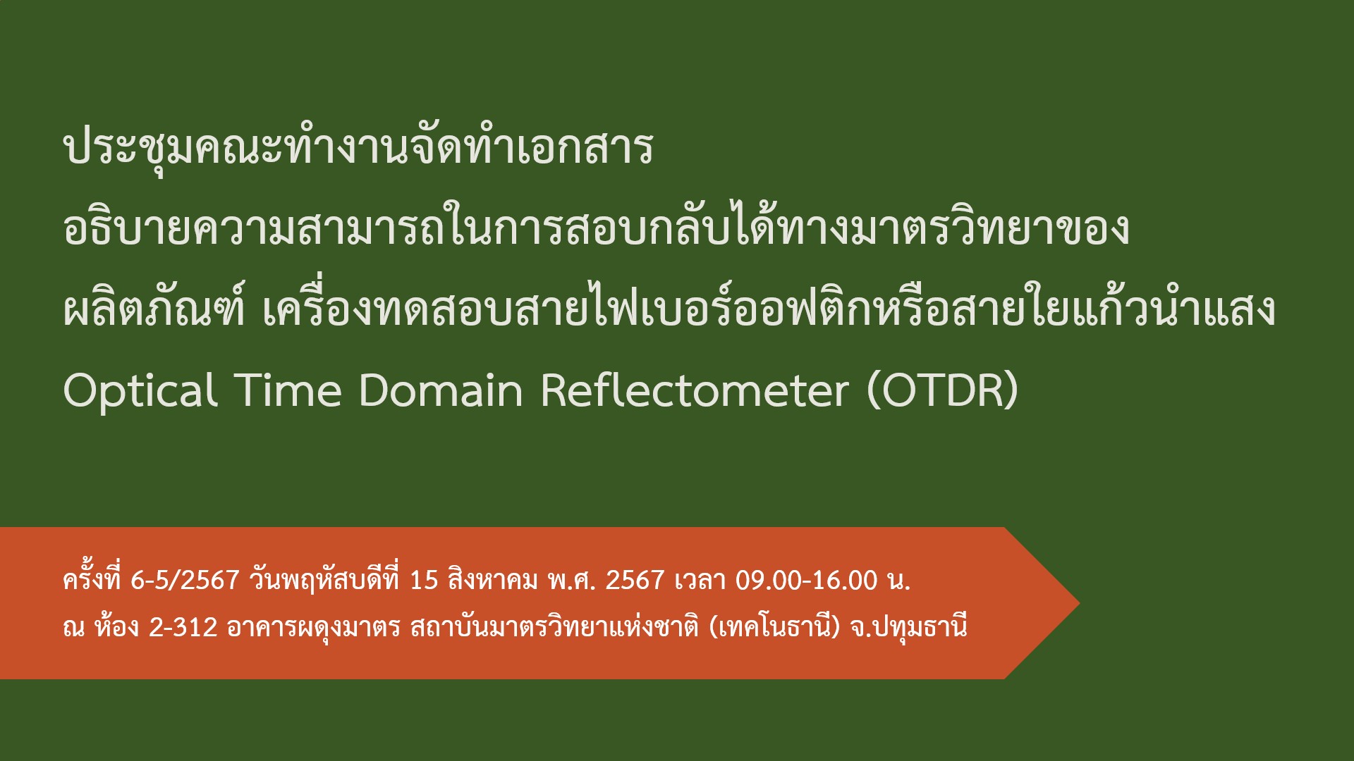 มว. จัดประชุมคณะทำงาน เอกสารการอธิบายความสามารถในการสอบกลับได้ทางมาตรวิทยาของผลิตภัณฑ์เครื่องทดสอบสายไฟเบอร์อฟติกหรือสายใยแก้วนำแสง Optical Time Domain Reflectometer (OTDR) ครั้งที่ 6-5/2567 โดยคณะทำงานดังกล่าวอยู่ภายใต้โครงการ “หลักการและความสามารถสอบกลับได้ทางมาตรวิทยาของผลการวัดเพื่อสนับสนุนห้องปฏิบัติการทดสอบและสอบเทียบ และกระบวนการรับรองห้องปฏิบัติการ” ที่ได้รับการสนับสนุนการจัดทำโครงการจากหน่วยบริหารจัดการทุนด้านการเพิ่มความสามารถในการแข่งขันของประเทศ (บพข.) โดยการประชุมครั้งนี้มีวาระสำคัญเพื่อให้ที่ประชุมพิจารณา และให้ข้อเสนอแนะ (ร่าง) เอกสารแนวทางการสอบเทียบฯ และวางแผนนัดหมายการประชุมในครั้งต่อไป ทั้งนี้เมื่อคณะทำงานชุดนี้ดำเนินการเสร็จเรียบร้อย จะทำให้เกิดประโยชน์ต่อผู้ใช้งานที่ต้องดำเนินการทดสอบ/สอบเทียบ ผลิตภัณฑ์เครื่องทดสอบสายไฟเบอร์ออฟติกหรือสายใยแก้วนำแสง Optical Time Domain Reflectometer (OTDR) ของไทยต่อไป