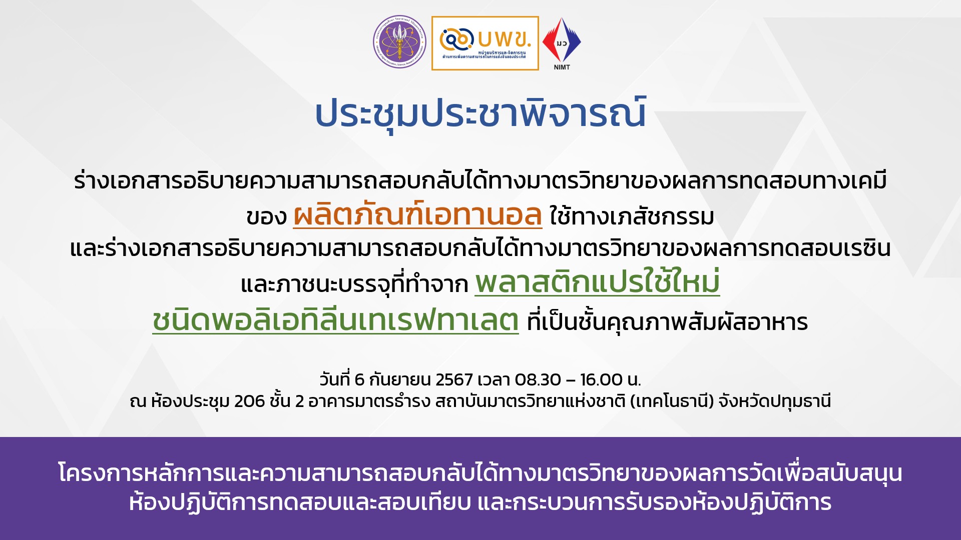 กระทรวงการอุดมศึกษา วิทยาศาสตร์ วิจัยและนวัตกรรม (อว.) โดยสถาบันมาตรวิทยาแห่งชาติ (มว.) ร่วมกับหน่วยงานที่เกี่ยวข้องจัดประชุมประชาพิจารณ์ร่างเอกสารอธิบายความสามารถสอบกลับได้ทางมาตรวิทยาของผลการทดสอบทางเคมีของผลิตภัณฑ์เอทานอลใช้ทางเภสัชกรรม และร่างเอกสารอธิบายความสามารถสอบกลับได้ทางมาตรวิทยาของผลการทดสอบเรซิน และภาชนะบรรจุที่ทำจากพลาสติกแปรใช้ใหม่ชนิดพอลิเอทิลีน เทเรฟเทเลต (Recycled Polyethylene terephthalate; rPET) ที่เป็นชั้นคุณภาพสัมผัสอาหาร (food contact grade) เพื่อให้เอกสารตอบสนองต่อความต้องการของกลุ่มผู้มีส่วนได้ส่วนเสีย และเกิดการยอมรับ ก่อนนำไปใช้งาน ซึ่งการจัดทำร่างเอกสารดังกล่าวอยู่ภายใต้โครงการหลักการและความสามารถสอบกลับได้ทางมาตรวิทยาของผลการวัดเพื่อสนับสนุนห้องปฏิบัติการทดสอบและสอบเทียบ และกระบวนการรับรองห้องปฏิบัติการ ปีนี้เป็นปีที่ 2 ที่ มว. ได้รับการสนับสนุนทุนจากหน่วยบริหารและจัดการทุนด้านการเพิ่มความสามารถในการแข่งขันของประเทศ (บพข.) สำนักงานนโยบายการอุดมศึกษา วิทยาศาสตร์ วิจัย และนวัตกรรม (สอวช.) โดยการประชุมประชาพิจารณ์ดังกล่าว จัดขึ้น ณ อาคารมาตรธำรง (มว.) คลองห้า จังหวัดปทุมธานี