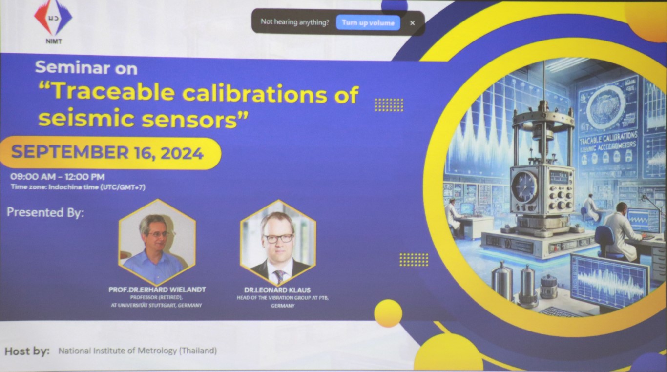 กระทรวงการอุดมศึกษา วิทยาศาสตร์ วิจัยและนวัตกรรม (อว.) สถาบันมาตรวิทยาแห่งชาติ (มว.) โดยพล.ต.ท.นพ.พรชัย สุธีรคุณ ผู้อำนวยการ กล่าวเปิดการสัมมนา และให้การต้อนรับ Prof. Dr. Erhard Weilandt นักวิชาการอิสระ ผู้เขียนตำราด้านหัววัดแผ่นดินไหวและการสอบเทียบรวมทั้งเป็นหนึ่งในคณะทำงานจัดทำคู่มือการสอบเทียบหัววัดแผ่นดินไหวของทาง National Institute of Standards and Technology (NIST) และ Dr. Leonard Klaus หัวหน้ากลุ่ม Vibration จาก Physikalisch-Technische Bundesanstalt (PTB) ซึ่งมีงานตีพิมพ์ที่มีชื่อเสียงทางด้านการสอบเทียบหัววัดแผ่นดินไหว โดยการบรรยายดังกล่าวเกี่ยวกับหัวข้อ หัววัดการสั่นสะเทือนของพื้นดิน และการสอบเทียบด้วยวิธีต่าง ๆ (Seismic sensors and their calibrations) ให้แก่พนักงานและผู้สนใจเข้าร่วมฟัง โดยเฉพาะหน่วยงานภาครัฐที่มีส่วนเกี่ยวข้องกับงานทางด้านการวัด และการสอบเทียบหัววัดแผ่นดินไหวในประเทศ อันจะเป็นประโยชน์ ให้เกิดการยอมรับถึงความจำเป็น และความน่าเชื่อถือของวิธีการสอบเทียบ รวมถึงจะเป็นการสร้างความร่วมมือ ในการพิจารณาร่างประกาศเกี่ยวกับการสอบเทียบหัววัดแผ่นดินไหวของประเทศ ที่กำลังจะจัดทำขึ้นต่อไป กิจกรรมการสัมมนาดังกล่าวจัดขึ้น ณ อาคารมาตรธำรง (มว.) คลองห้า จังหวัดปทุมธานี