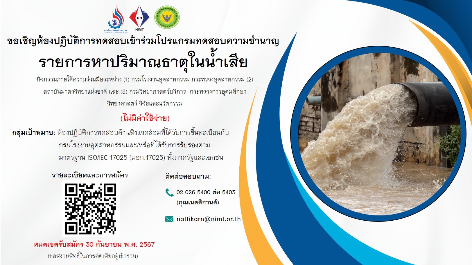 ห้องปฏิบัติการวิเคราะห์อนินทรีย์เคมี ฝ่ายมาตรวิทยาเคมีและชีวภาพ สถาบันมาตรวิทยาแห่งชาติ (มว.) ขอเชิญห้องปฏิบัติการทดสอบ เข้าร่วมโปรแกรมทดสอบความชำนาญรายการหาปริมาณธาตุในน้ำเสีย (ไม่มีค่าใช้จ่าย) กิจกรรมนี้เป็นความร่วมมือของ 3 หน่วยงาน ได้แก่ 1) กรมโรงงานอุตสาหกรรม กระทรวงอุตสาหกรรม 2) สถาบันมาตรวิทยาแห่งชาติ และ 3) กรมวิทยาศาสตร์บริการ กระทรวงการอุดมศึกษา วิทยาศาสตร์ วิจัยและนวัตกรรม ในการพัฒนาโปรแกรมทดสอบความชำนาญด้านน้ำเสียของประเทศ ธาตุที่จะวิเคราะห์ ได้แก่ As Ba Cd Cr Cu Mn Ni Pb Se และ Zn ซึ่งสามารถวิเคราะห์ทุกธาตุ หรือเลือกวิเคราะห์เฉพาะธาตุที่สนใจ กลุ่มเป้าหมายได้แก่ ห้องปฏิบัติการทดสอบด้านสิ่งแวดล้อมที่ได้รับการขึ้นทะเบียนกับกรมโรงงานอุตสาหกรรทและ/หรือ ที่ได้รับการรับรองตามมาตรฐาน ISO/IEC 17025 (มอก.17025) ทั้งภาครัฐและเอกชน คลิกลิงก์เพื่อลงทะเบียนเข้าร่วม https://forms.gle/9kru9nrNx5srpnXPS หมดเขตรับสมัคร วันที่ 30 กันยายน 2567 ผู้จัดจะส่งอีเมลตอบรับการเข้าร่วมโปรแกรมทดสอบความชำนาญ ภายในวันที่ 1 ตุลาคม 2567 สอบถามข้อมูลเพิ่มเติมได้ที่ ห้องปฏิบัติการวิเคราะห์อนินทรีย์เคมี ฝ่ายมาตรวิทยาเคมีและชีวภาพ สถาบันมาตรวิทยาแห่งชาติ โทรศัพท์ : 0 2026 5400 ต่อ 5403 ดร.เนตติกานต์