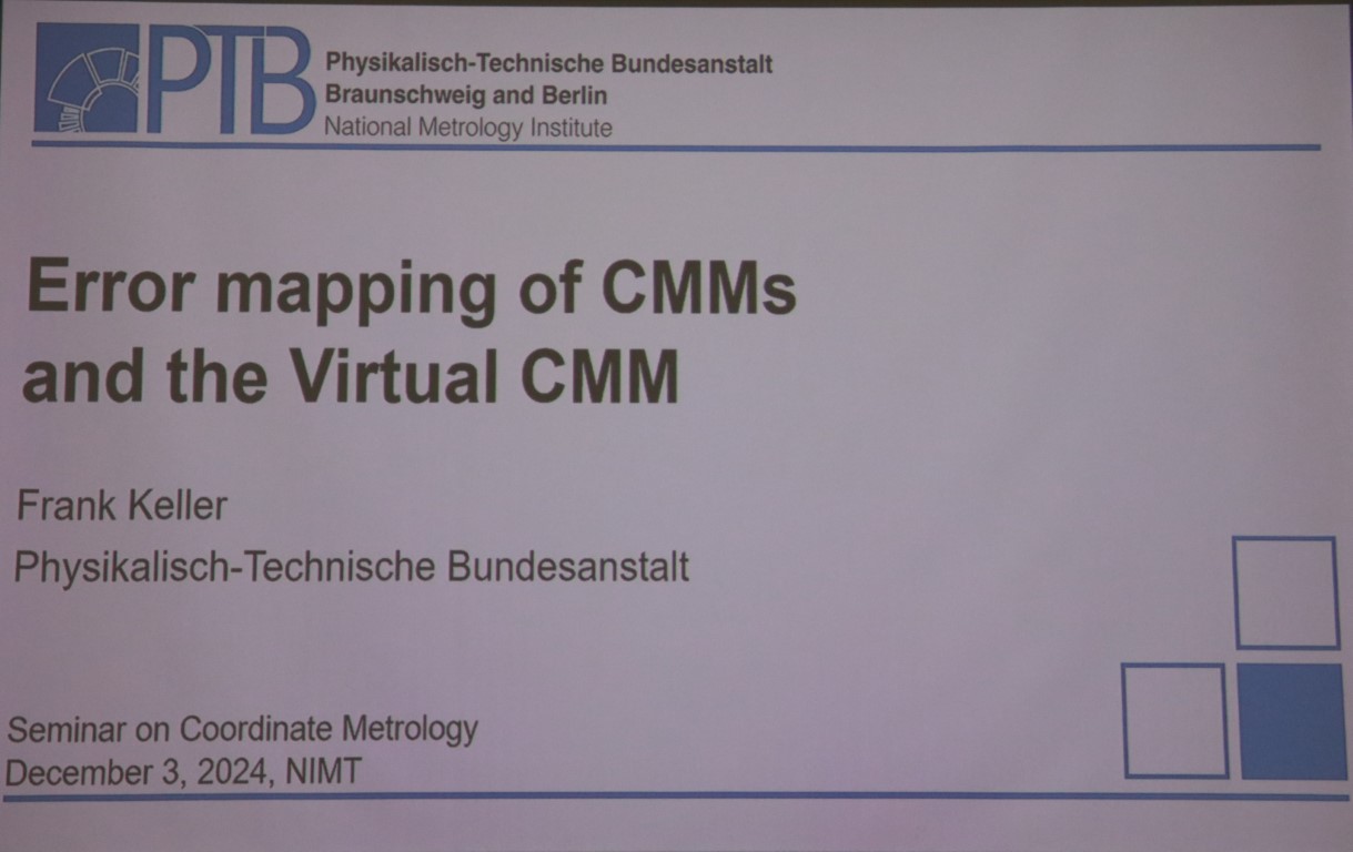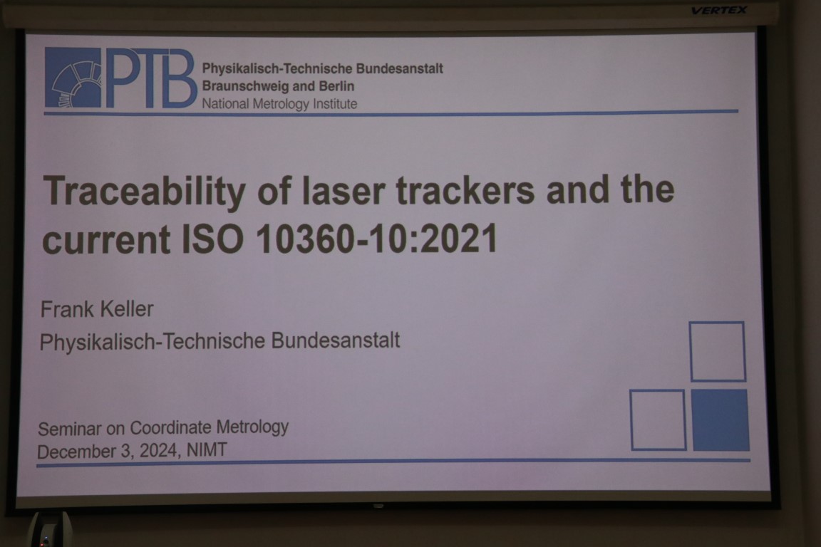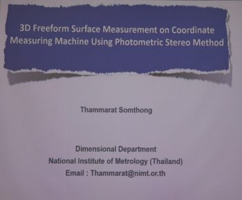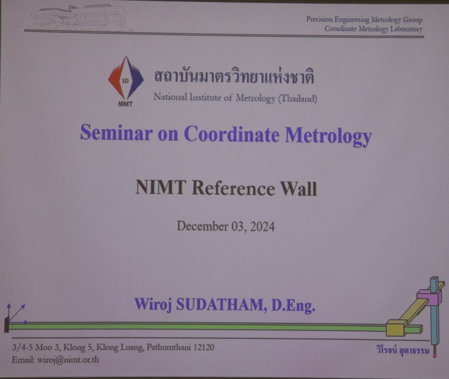 กระทรวงการอุดมศึกษา วิทยาศาสตร์ วิจัยและนวัตกรรม (อว.) สถาบันมาตรวิทยาแห่งชาติ (มว.) โดย พล.ต.ท.นพ.พรชัย สุธีรคุณ ผู้อำนวยการ ประธานเปิดการสัมมนาเชิงวิชาการเรื่อง เทคโนโลยีการวัดด้าน Coordinate Metrology จากนั้นเป็นการบรรยาย โดยนายอนุสรณ์ ทนหมื่นไวย รองผู้อำนวยการ บรรยายเรื่อง มาตรฐานการวัดแห่งชาติสำหรับการวัดฟรีฟอร์ม ต่อด้วย การบรรยายเรื่อง Traceability of laser trackers and the current ISO 10360-10:2021 บรรยายโดย Dr. Frank Keller, Div.5 Precision Engineering, Physikalisch-Technische Bundesanstalt, PTB หัวข้อการพัฒนามาตรฐาน ISO สำหรับ Optical 3D CMS, และ Simultaneous geometric error identification of CMM บรรยายโดย Dr. Makoto Abe, Chief Corporate Metrologist, Mitutoyo, Japan จากนั้นเป็นการบรรยายเรื่อง Establishing NIMT’s reference wall for laser trackers verifications บรรยายโดย ดร.วิโรจน์ สุดาธรรม นักมาตรวิทยา ฝ่ายมาตรวิทยามิติ มว. คุณวัชริน จรัสโชติกุล Sales Manager จากบริษัท เฮกซากอน เมโทรโลจี (ประเทศไทย) จำกัด บรรยายเรื่อง Evolution of Coordinate Metrology, the science of measurement และคุณเอกชัย ศรีปัญญานุช President จากบริษัท TBTS (Thailand) Co., Ltd. บรรยายเรื่อง 3D Scanners Driven Innovation and Laser Tracker Application ส่วนในช่วงบ่าย เป็นการบรรยายเรื่อง 3D Freeform Surface Measurement on Coordinate Measuring Machine using Photometric Stereo Method โดย ดร.ธรรมรัตน์ สมทอง นักมาตรวิทยา ฝ่ายมาตรวิทยามิติ มว. และการบรรยายเรื่อง Error mapping of CMMs and Virtual CMM โดย Dr. Frank Keller จาก PTB ก่อนที่จะไปเยี่ยมชมห้องปฏิบัติการของสถาบันมาตรวิทยาแห่งชาติ ที่อาคารพัฒนาระบบราง การจัดสัมมนาเชิงวิชาการในครั้งนี้มีวัตถุประสงค์เพื่อถ่ายทอดเทคโนโลยีการวัดด้าน Coordinate Metrology .ให้แก่กลุ่มผู้ใช้งาน ผู้ขาย ห้องปฏิบัติการสอบเทียบ ภาคการศึกษา และหน่วยงานที่เกี่ยวข้องกับโครงสร้างพื้นฐานทางคุณภาพ เสริมสร้างความสามารถในการสอบกลับได้ (Traceability) ของมาตรฐานการวัดแห่งชาติ Reference Wall เพื่อให้เกิดการสอบกลับได้ของกลุ่มเครื่องมือตาม ISO10360-10 ที่กลุ่มงานวิศวกรรมวัดละเอียด ฝ่ายมาตรวิทยามิติได้จัดสร้างขึ้น กิจกรรมการสัมมนาจัดขึ้น ณ อาคารสำนักงานกลาง (มว.) คลองห้า จังหวัดปทุมธานี