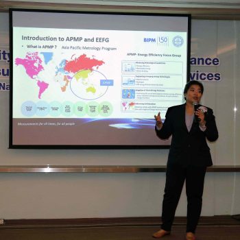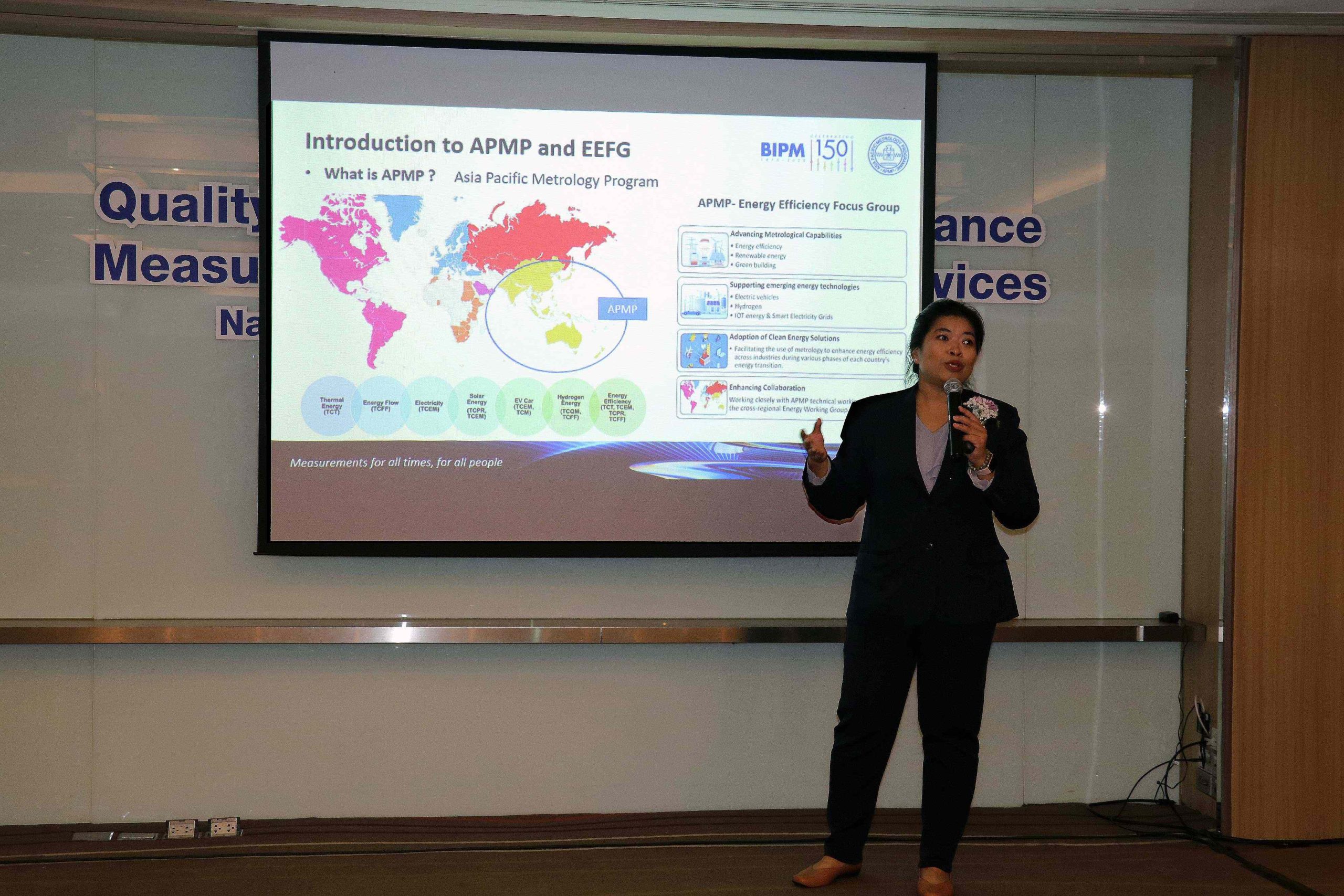• ดร.อ้อยใจ อ่องหร่าย นักมาตรวิทยาชำนาญการพิเศษ กลุ่มงานถ่ายทอดค่ามาตรฐานและความชื้น ฝ่ายมาตรวิทยาอุณหภูมิและแสง มว. ในฐานะ Chair of APMP Energy Efficiency Focus Group บรรยายในหัวข้อ “Advancing Solar Energy through Collaboration: the Role of APMP Energy Efficiency”