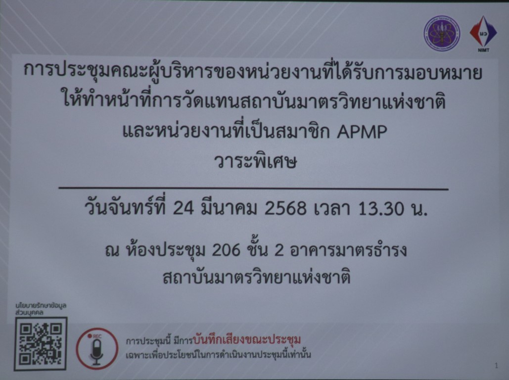 กระทรวงการอุดมศึกษา วิทยาศาสตร์ วิจัยและนวัตกรรม (อว.) สถาบันมาตรวิทยาแห่งชาติ (มว.) โดย พล.ต.ท.นพ.พรชัย สุธีรคุณ ผู้อำนวยการ นายอนุสรณ์ ทนหมื่นไวย รองผู้อำนวยการ ดร.จรัญ ยะฝา ผู้ช่วยผู้อำนวยการ พร้อมด้วยหัวหน้าฝ่ายต่าง ๆ ของ มว. และผู้แทนจากหน่วยงานที่ได้รับมอบหมายให้ทำหน้าที่การวัดแทนสถาบันมาตรวิทยาแห่งชาติ (Designated Institutes) เข้าร่วมประชุมด้วย โดยมีวัตถุประสงค์เพื่อรายงานความคืบหน้าของกิจกรรมที่แต่ละหน่วยงานได้รับมอบหมายจากการประชุมครั้งที่แล้ว รวมถึงหารือแนวทางความร่วมมือของหน่วยงาน DIs และหน่วยงานที่เป็นสมาชิก APMP ความร่วมมือการพัฒนามาตรฐานการวัดเพื่อรองรับเทคโนโลยีอนาคต ขับเคลื่อนการพัฒนาระบบมาตรวิทยาของประเทศให้เป็นที่ยอมรับ และมีผลงานเชิงประจักษ์ในระดับนานาชาติ การประชุมดังกล่าวจัดขึ้น ณ อาคารมาตรธำรง (มว.) คลองห้า จังหวัดปทุมธานี