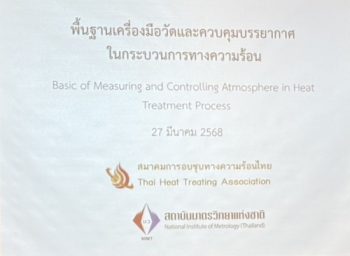 กระทรวงการอุดมศึกษา วิทยาศาสตร์ วิจัยและนวัตกรรม (อว.) โดยสถาบันมาตรวิทยาแห่งชาติ (มว.) ร่วมกับสมาคมการอบชุบทางความร้อนไทย จัดอบรมหลักสูตร “พื้นฐานเครื่องมือวัดและควบคุมบรรยากาศในกระบวนการอบชุบทางความร้อน” (Basic of Measuring and Controlling Atmosphere in Heat Treatment Process) บรรยายโดยวิทยากรหลักจากสถาบันมาตรวิทยาแห่งชาติ ได้แก่ คุณสุวัฒน์ พนากุลวิจิตร (ฝ่ายมาตรวิทยาเชิงกล) คุณพงศ์เทพ ภู่อุณฑะโร (ฝ่ายมาตรวิทยาอุณหภูมิและแสง) และคุณอาณัฐชัย วงศ์จักร (ฝ่ายมาตรวิทยาเคมีและชีวภาพ) ซึ่งนอกจากจะให้ความรู้แล้ววิทยากรยังเปิดโอกาสให้ผู้เข้าร่วมอบรมสอบถามปัญหาได้อย่างใกล้ชิดด้วย โดยผู้เข้าร่วมอบรมประกอบด้วยวิศวกร นักเทคนิค และผู้เชี่ยวชาญจากอุตสาหกรรมที่เกี่ยวข้อง ซึ่งรวมถึงบริษัทชั้นนำอย่าง วาตานาเบ้ ฮีททรีทเมนท์ บี.เค.เจ. แอดวานซ์โพเซสส์ ไทยอินดักชั่นส์ เซอร์วิส โพรลิฟิค เอ็นจิเนียริ่ง แอนด์ เซอร์วิส ไอชิน ออโต้พาร์ทส์ ไทยปาร์กเกอร์ไรซิ่ง และซีเอชเอส-เอเซีย จำกัด การอบรมในครั้งนี้นำทีมโดย รศ.สมนึก วัฒนศรียกุล นายกสมาคมการอบชุบทางความร้อนไทย ผศ.ดร.รัตน บริสุทธิกุล ที่ปรึกษาสมาคม จากมหาวิทยาลัยเทคโนโลยีสุรนารี และ ดร.อ้อยใจ อ่องหร่าย จากฝ่ายมาตรวิทยาอุณหภูมิและแสง สถาบันมาตรวิทยาแห่งชาติ ซึ่งการอบรมนี้ได้มุ่งเน้นเพื่อเสริมสร้างความเข้าใจหลักการและมาตรฐานการวัดสำหรับกระบวนการอบชุบทางความร้อนอย่างไร ยกตัวอย่างเช่น การควบคุมความดันสุญญากาศ อุณหภูมิ ความชื้น และองค์ประกอบบรรยากาศ ที่จะส่งผลต่อคุณภาพของผลิตภัณฑ์โลหะได้ การอบรมในครั้งนี้ถือเป็นก้าวสำคัญก้าหนึ่งในการเสริมสร้างศักยภาพให้กับบุคลากรในอุตสาหกรรมไทย และยกระดับมาตรฐานการผลิตเพื่อความสามารถในการแข่งขันระดับสากลอย่างยั่งยืน กิจกรรมดังกล่าวจัดขึ้น ณ โรงแรมโมริโนะ โฮเทล จังหวัดชลบุรี