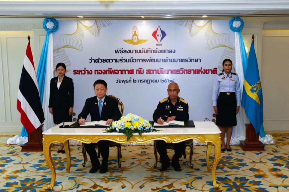 พล.อ.ท.สิทธิศักดิ์ สายเงิน เจ้ากรมสื่อสารอิเล็กทรอนิกส์ทหารอากาศ ผู้รับมอบอำนาจ กองทัพอากาศ กระทรวงกลาโหม และ พล.ต.ท. นพ.พรชัย สุธีรคุณ ผู้อำนวยการสถาบันมาตรวิทยาแห่งชาติ กระทรวงการอุดมศึกษา วิทยาศาสตร์ วิจัยและนวัตกรรม ร่วมลงนามบันทึกข้อตกลงความร่วมมือว่าด้วยความร่วมมือการพัฒนาด้านมาตรวิทยา เพื่อการพัฒนาความรู้ความสามารถด้านวิชาการเกี่ยวกับการสอบเทียบมาตรฐานเครื่องวัด และการพัฒนาระบบมาตรวิทยา ตลอดจนภารกิจด้านการวิจัยและพัฒนาระบบการวัดของกองทัพอากาศ ซึ่งเป็นเครื่องมือพื้นฐานในการซ่อมบำรุง และสร้างยุทโธปกรณ์ ให้มีความถูกต้อง แม่นยำเป็นที่เชื่อถือยอมรับได้ทั่วไปในระดับสากลเป็นการพัฒนาระบบมาตรวิทยา และเสริมสร้างขีดความสามารถของการถ่ายทอดค่าการวัดจากมาตรฐานแห่งชาติ (National Standards) สู่มาตรฐานอ้างอิง (Reference Standards) ตามลำดับ เพื่อที่จะทำให้ระบบการวัดแห่งชาติมีความเข้มแข็ง สามารถถ่ายทอดความถูกต้องของการวัดสู่ผู้ใช้งานภายในประเทศได้อย่างเต็มประสิทธิภาพ เป็นรากฐานที่มั่นคงต่อการพัฒนาเทคโนโลยีด้านความมั่นคงของประเทศในระยะยาว เมื่อวันที่ 2 กรกฎาคม 2568 ณ ห้องรับรองบริพัตร กองบัญชาการกองทัพอากาศ กรุงเทพมหานคร
