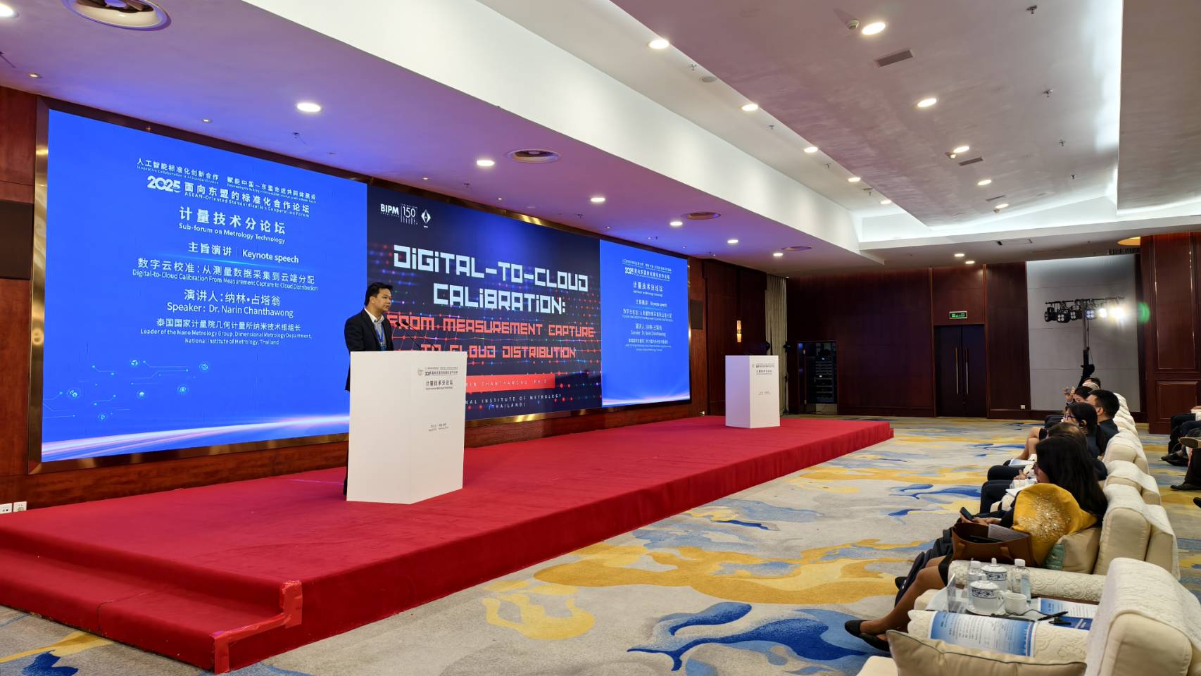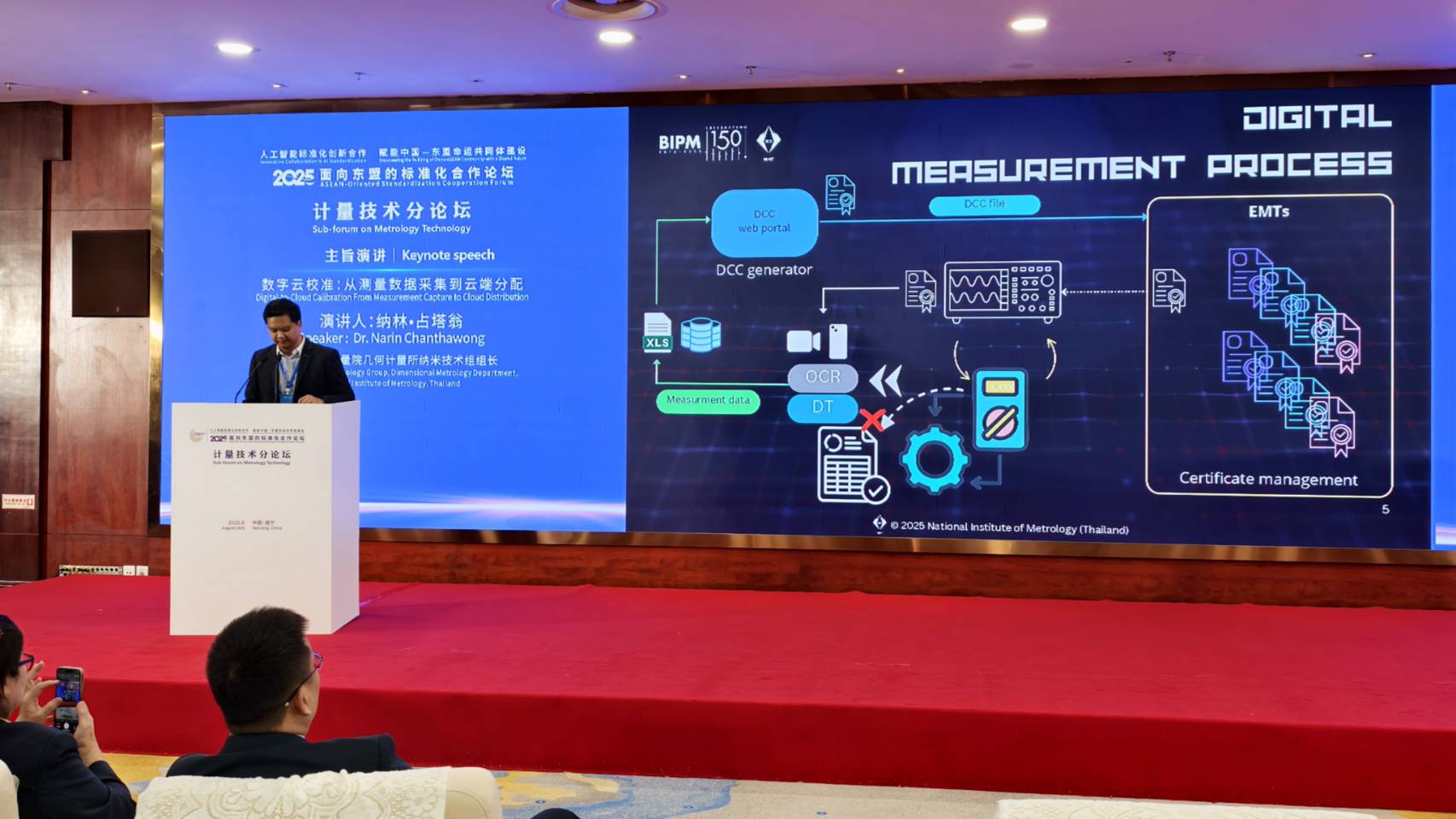 ดร.นรินทร์ ได้บรรยายในหัวข้อ “Digital-to-Cloud Calibration: From Measurement Capture to Cloud Distribution” โดยกล่าวถึงบทบาทของมาตรวิทยาดิจิทัลในการสนับสนุนการพัฒนามาตรฐานและการอำนวยความสะดวกทางการค้าในภูมิภาค