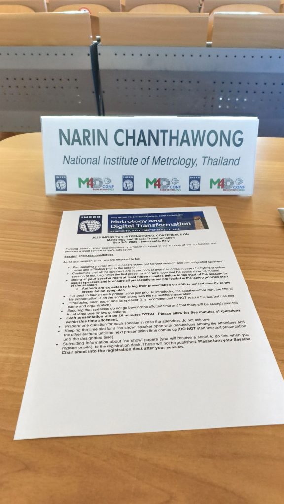 โดย ดร.นรินทร์ จันทวงศ์ ทำหน้าที่ Session Chair ใน Session 3.2 – Advancing Sensor Network Metrology for Industry 4.0 and IoT Applications ซึ่งเป็นเซสชันที่มุ่งเน้นการพัฒนามาตรวิทยาสำหรับระบบเซนเซอร์เครือข่ายและการปรับใช้เชิงอุตสาหกรรม