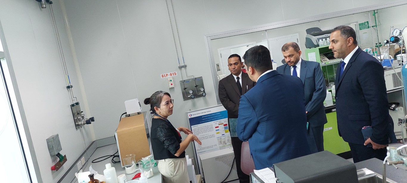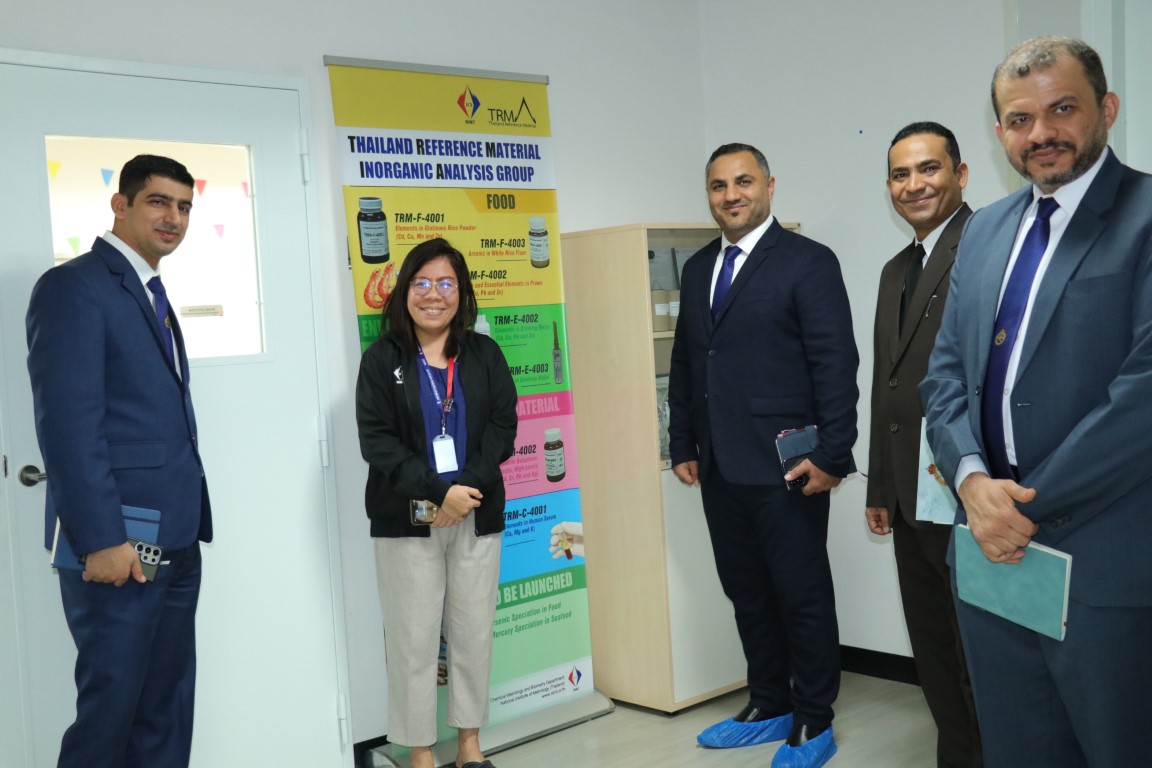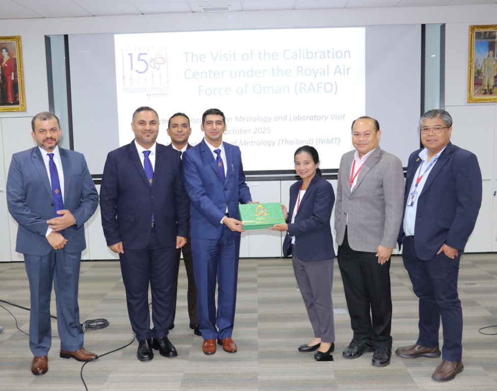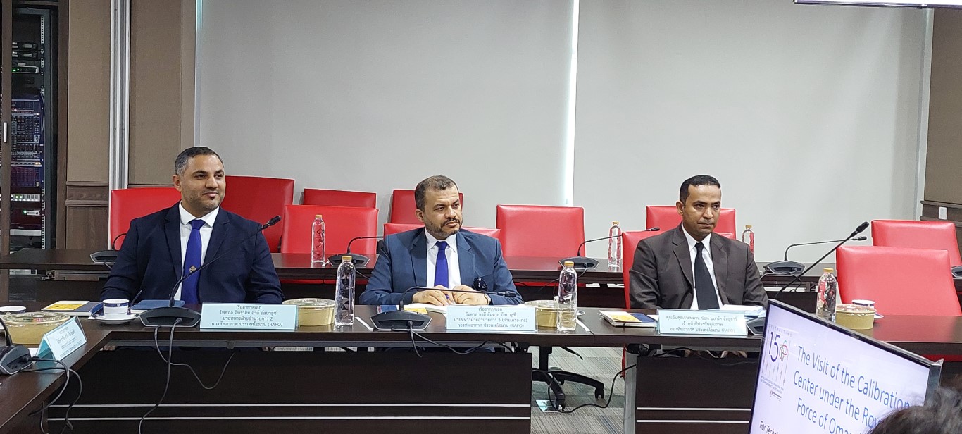 ดร.จรัญ ยะฝา ผู้ช่วยผู้อำนวยการ สถาบันมาตรวิทยาแห่งชาติ (มว.) พร้อมด้วย ดร.กิตติยา เชียร์แมน หัวหน้าฝ่ายมาตรวิทยาเคมีและชีวภาพ พร้อมด้วยหัวหน้ากลุ่มงานต่างๆ ของฝ่ายมาตรวิทยาเคมีและชีวภาพ ให้การต้อนรับ Wing Commander (Eng) Ishaq Al Shammakhi พร้อมทีมงานจาก Calibration Center ภายใต้ the Royal Air Force of Oman (RAFO) รัฐสุลต่านโอมาน ในโอกาสเข้าหารือและเยี่ยมชมห้องปฏิบัติการของสถาบัน โดยวัตถุประสงค์ของการเยี่ยมชมในครั้งนี้เพื่อจัดตั้งห้องปฏิบัติการมาตรวิทยาเคมีภายในศูนย์ พัฒนาทักษะการจัดเตรียม และการตรวจสอบวัสดุอ้างอิงที่ได้รับการรับรอง จัดหลักสูตรอบรมเฉพาะทางสำหรับเจ้าหน้าที่ฝ่ายเทคนิคในสาขามาตรวิทยาเคมี ศึกษาความเป็นไปได้ในการร่วมมือในโครงการทดสอบความชำนาญ (PT) รวมทั้งเรียนรู้จากผู้เชี่ยวชาญของสถาบันมาตรวิทยาแห่งชาติ ในการดำเนินงานของห้องปฏิบัติการเคมีตามมาตรฐาน ISO/IEC 17025 และ ISO 17034 กิจกรรมการหารือและเยี่ยมชมห้องปฏิบัติการของสถาบัน จัดขึ้น ณ อาคารมาตรธำรง (มว.) คลองห้า จังหวัดปทุมธานี