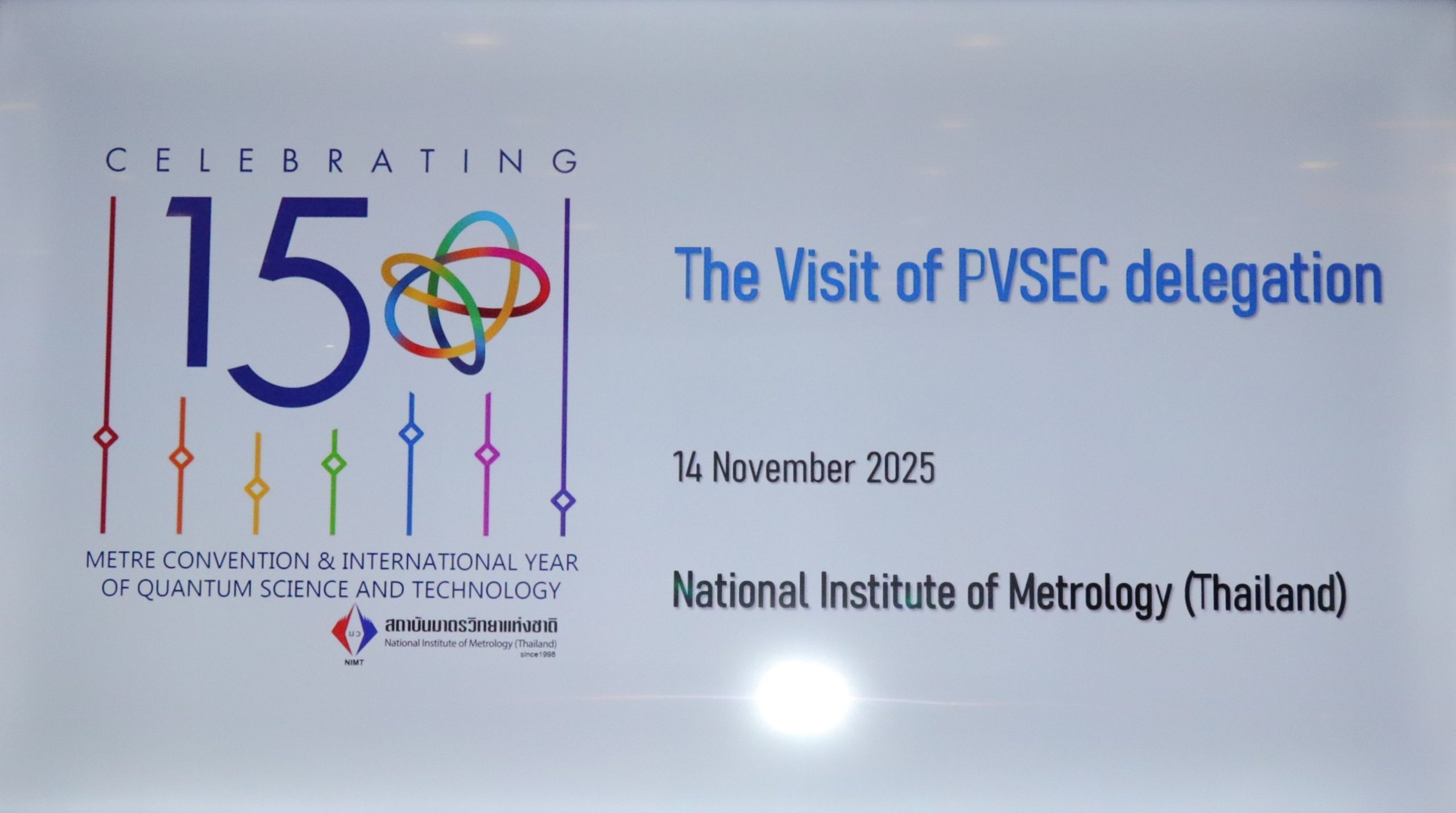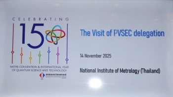 พล.ต.ท.นพ.พรชัย สุธีรคุณ ผู้อำนวยการ มว. ให้การต้อนรับผู้แทนจากสถาบันมาตรวิทยาแห่งเยอรมนี (PTB-Physikalisch-Technische Bundesanstalt) และคณะผู้เข้าร่วมการประชุมจาก Photovoltaic Science and Engineering Conference (PVSEC) อันได้แก่ผู้เข้าร่วมจากประเทศอินเดีย อินโดนีเซีย และเวียดนาม ในโอกาสเข้าหารือและเยี่ยมชมห้องปฏิบัติการของ มว. โดยมีวัตถุประสงค์เพื่อเปิดโอกาสให้ผู้เข้าเยี่ยมชมได้ศึกษากระบวนการด้านมาตรวิทยาที่เกี่ยวข้องกับเทคโนโลยีพลังงานแสงอาทิตย์ ตลอดจนแลกเปลี่ยนองค์ความรู้ เทคนิคและประสบการณ์ ซึ่งจะสามารถนำไปประยุกต์ใช้เพื่อสนับสนุนการพัฒนาด้านพลังงานหมุนเวียนในแต่ละประเทศได้ กิจกรรมข้างต้นจัดขึ้น ณ อาคารผดุงมาตร (มว.) คลองห้า จังหวัดปทุมธานี