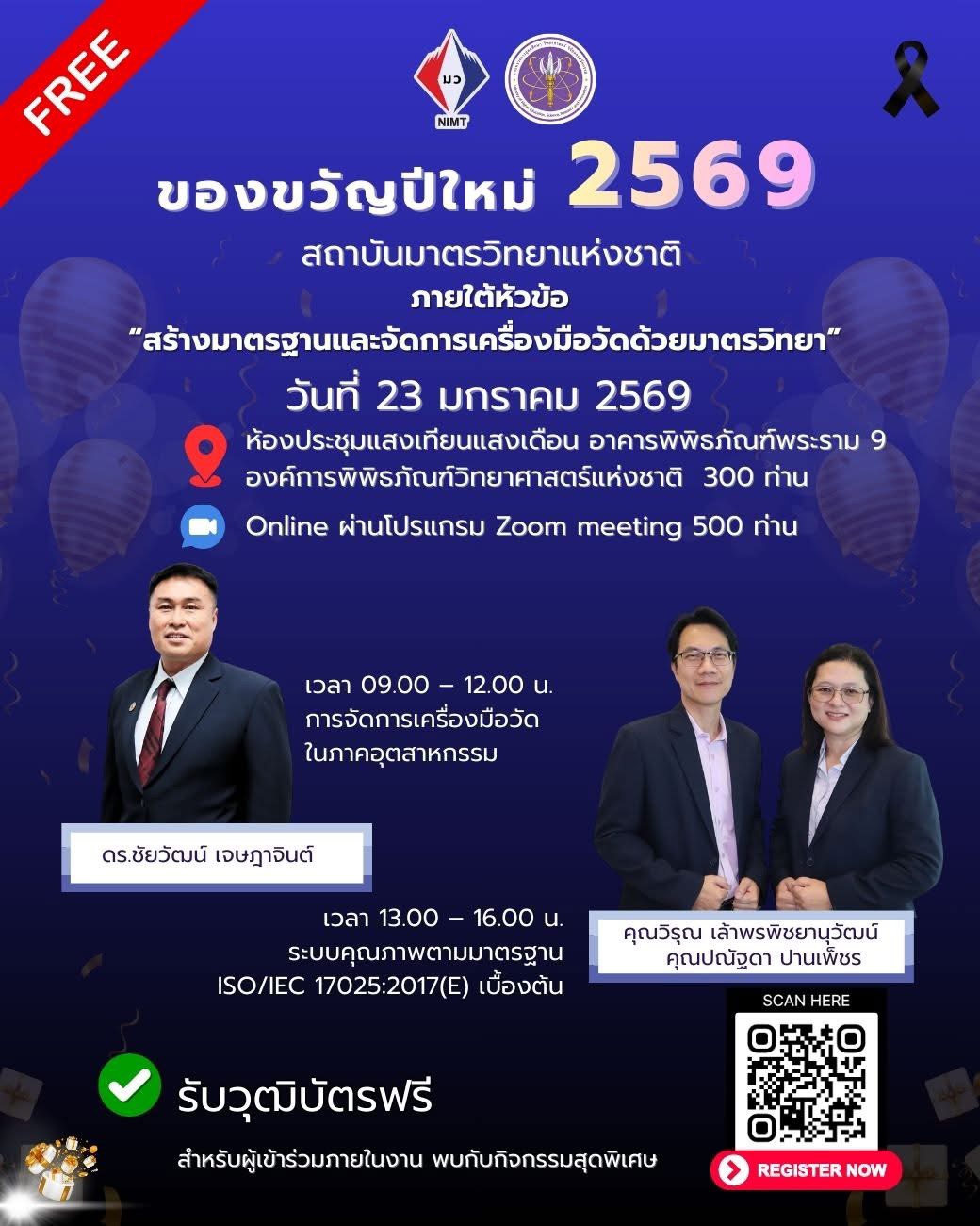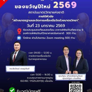 สำหรับของขวัญปีใหม่ 2569 ของ มว. นำทีมโดย พล.ต.ท. นพ.พรชัย สุธีรคุณ ผู้อำนวยการฯ พร้อมด้วยพนักงาน มว. ได้มีส่วนร่วมส่งความสุขให้ประชาชน ในกล่องที่ 3 “Upskill – Reskill เปลี่ยนความรู้เป็นอาชีพ เปลี่ยนทักษะเป็นอนาคต” จัดให้มีบริการวิชาการ/ฝึกอบรมหลักสูตร Upskill-Reskill ให้แก่ภาคอุตสาหกรรมและประชาชนที่สนใจทั่วประเทศ ภายใต้หัวข้อ “สร้างมาตรฐานและจัดการเครื่องมือวัดด้วยมาตรวิทยา” โดยไม่เสียค่าใช้จ่าย ในวันที่ 23 มกราคม 2569 กิจกรรมในงานประกอบด้วย