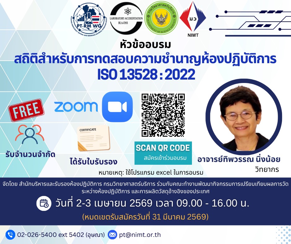 กลุ่มงานอนินทรีย์เคมี ฝ่ายมาตรวิทยาเคมีและชีวภาพ สถาบันมาตรวิทยาแห่งชาติ มว. ร่วมกับ สำนักบริหารและรับรองห้องปฏิบัติการ กรมวิทยาศาสตร์บริการ และคณะทำงานพัฒนากิจกรรมการเปรียบเทียบผลการวัดระหว่างห้องปฏิบัติการ และการผลิตวัสดุอ้างอิงของประเทศ จัดอบรมหัวข้อ สถิติสำหรับการทดสอบความชำนาญห้องปฏิบัติการ ISO 13528:2022 ได้รับเกียรติบรรยายโดย อาจารย์ทิพวรรณ นิ่งน้อย จะจัดขึ้นในวันที่ 2-3 เมษายน 2569 เวลา 09.00 – 16.00 น. สนใจติดต่อสอบถามเพิ่มเติมได้ที่ คุณอุษณา โทร. 02-026-5400 ต่อ 5402 หรือ pt@nimt.or.th