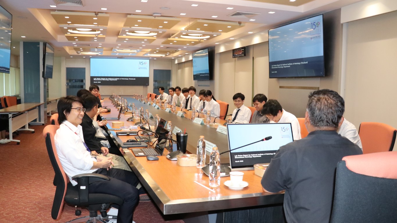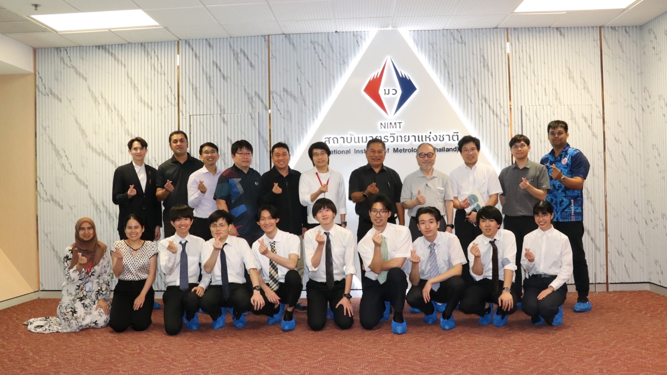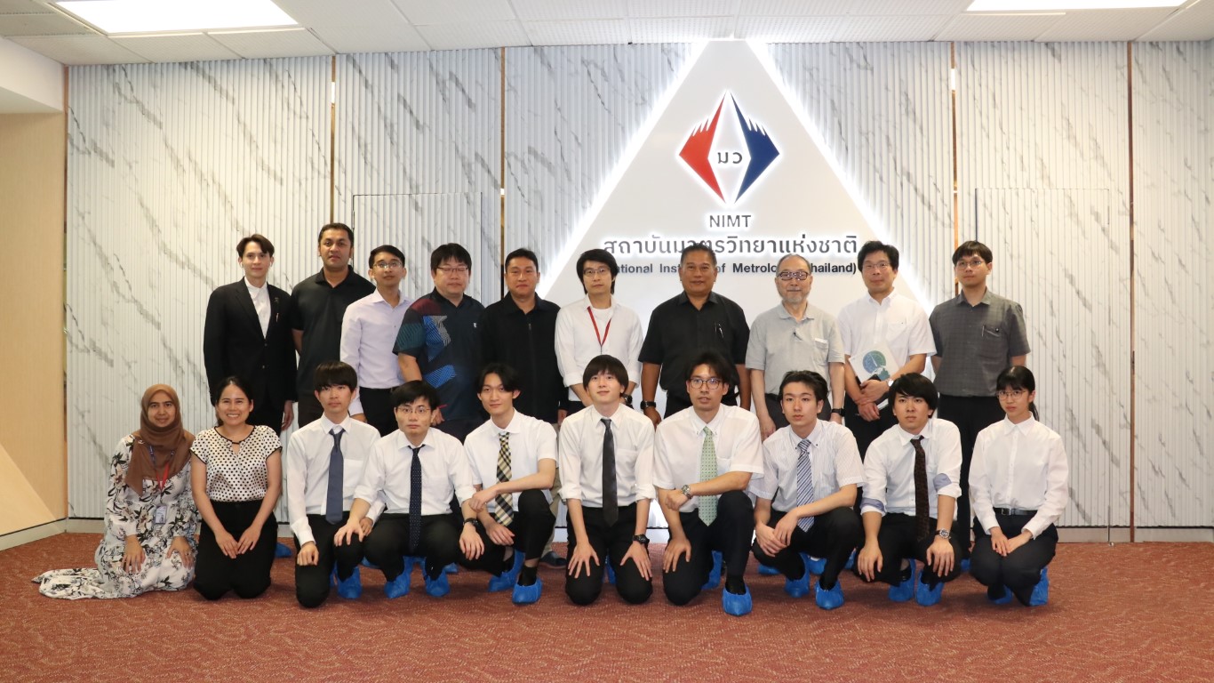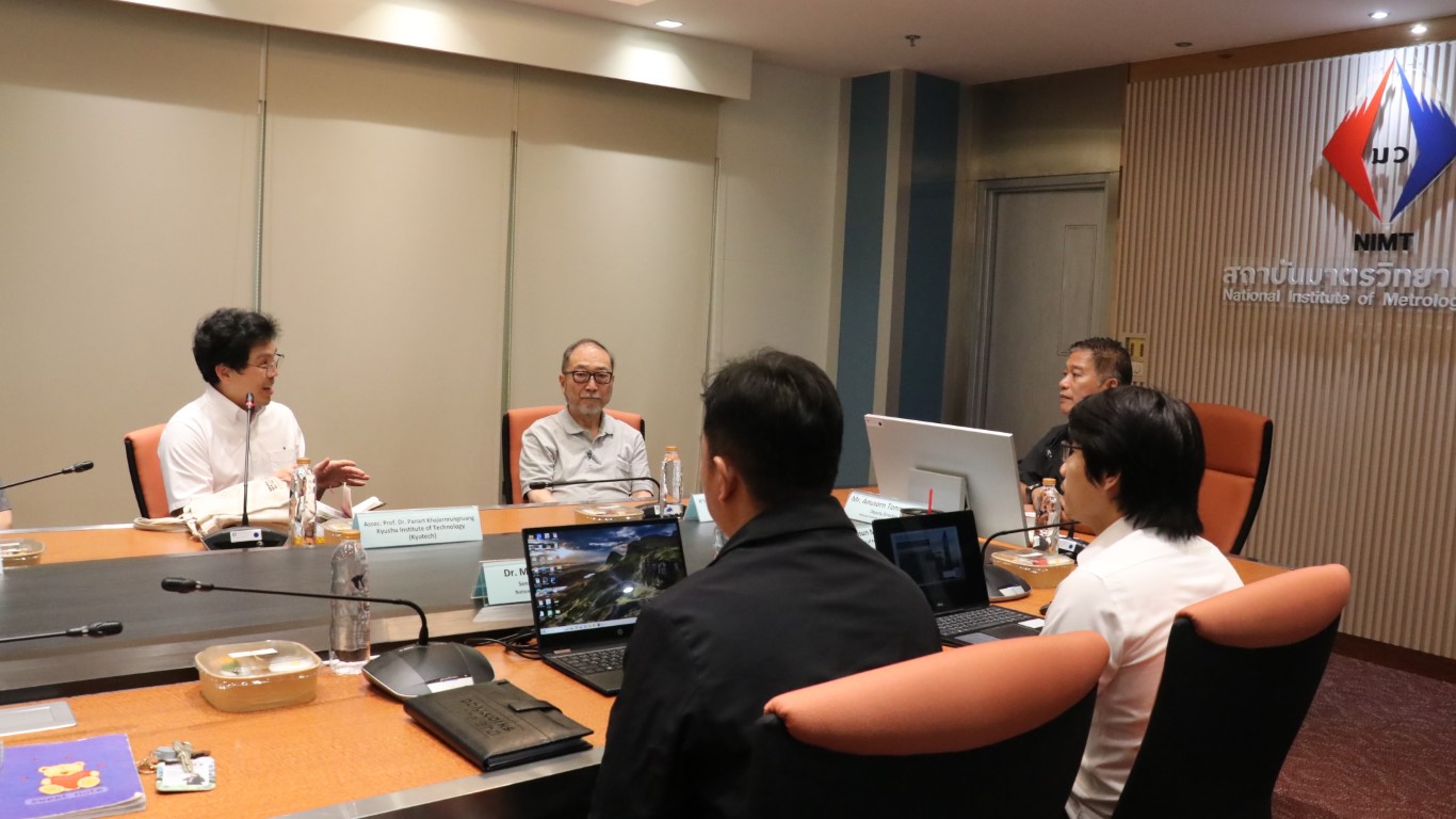 นายอนุสรณ์ ทนหมื่นไวย รองผู้อำนวยการ สถาบันมาตรวิทยาแห่งชาติ (มว.) พร้อมด้วย ดร.กิตติสัณห์ มงคลสุทธิรัตน์ หัวหน้ากลุ่มงานมาตรฐานปฐมภูมิความยาว ดร.มูฮัมหมัด หมัดเด็น หัวหน้าห้องปฏิบัติการรูปร่าง ดร.ธรรมรัตน์ สมทอง หัวหน้าห้องปฏิบัติการพื้นผิว ดร.อัชยา เทพพิทักษ์ศักดิ์ นักมาตรวิทยา ฝ่ายมาตรวิทยามิติ ให้การต้อนรับ Emeritus Prof. Dr. Keiichi Kimura, Assoc. Prof. Dr. Panart Khajornrungruang, Dr. Thitipat Permpatdechakul จาก Kyushu Institute of Technology (Kyutech), Asst. Prof. Dr. Aran Blattler, Asst. Prof. Dr. Teppakorn Sittiwanchai, Asst. Prof. Dr. Natthapon BUN-A-THUEK จาก King Mongkut’s University of Technology North Bangkok (KMUTNB) ในโอกาสนำนักศึกษาจาก Kyutech เข้าเยี่ยมชมห้องปฏิบัติการของฝ่ายมาตรวิทยามิติ โดยกิจกรรมการเยี่ยมชมดังกล่าวจัดขึ้น ณ อาคารผดุงมาตร (มว.) คลองห้า จังหวัดปทุมธานี