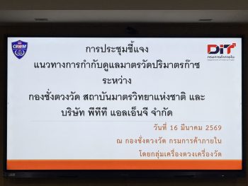 นายอนุสรณ์ ทนหมื่นไวย รองผู้อำนวยการ สถาบันมาตรวิทยาแห่งชาติ (มว.) พร้อมด้วย ดร.พัชรพล กอกิตรัตนกุล นักมาตรวิทยาชำนาญการ กลุ่มงานกลศาสตร์ของไหล ฝ่ายมาตรวิทยาเชิงกล มว. เข้าร่วมประชุมหารือร่วมกับหน่วยงานชั่งตวงวัด โดยมีวัตถุประสงค์เพื่อชี้แจงแนวทางการกำกับดูแลมาตรวัดปริมาตรก๊าซ ระหว่างกองชั่งตวงวัด สถาบันมาตรวิทยาแห่งชาติ และบริษัท พีทีที แอลเอ็นจี จำกัด การประชุมดังกล่าวจัดขึ้น ณ กองชั่งตวงวัด กรมการค้าภายใน กระทรวงพาณิชย์ จังหวัดนนทบุรี