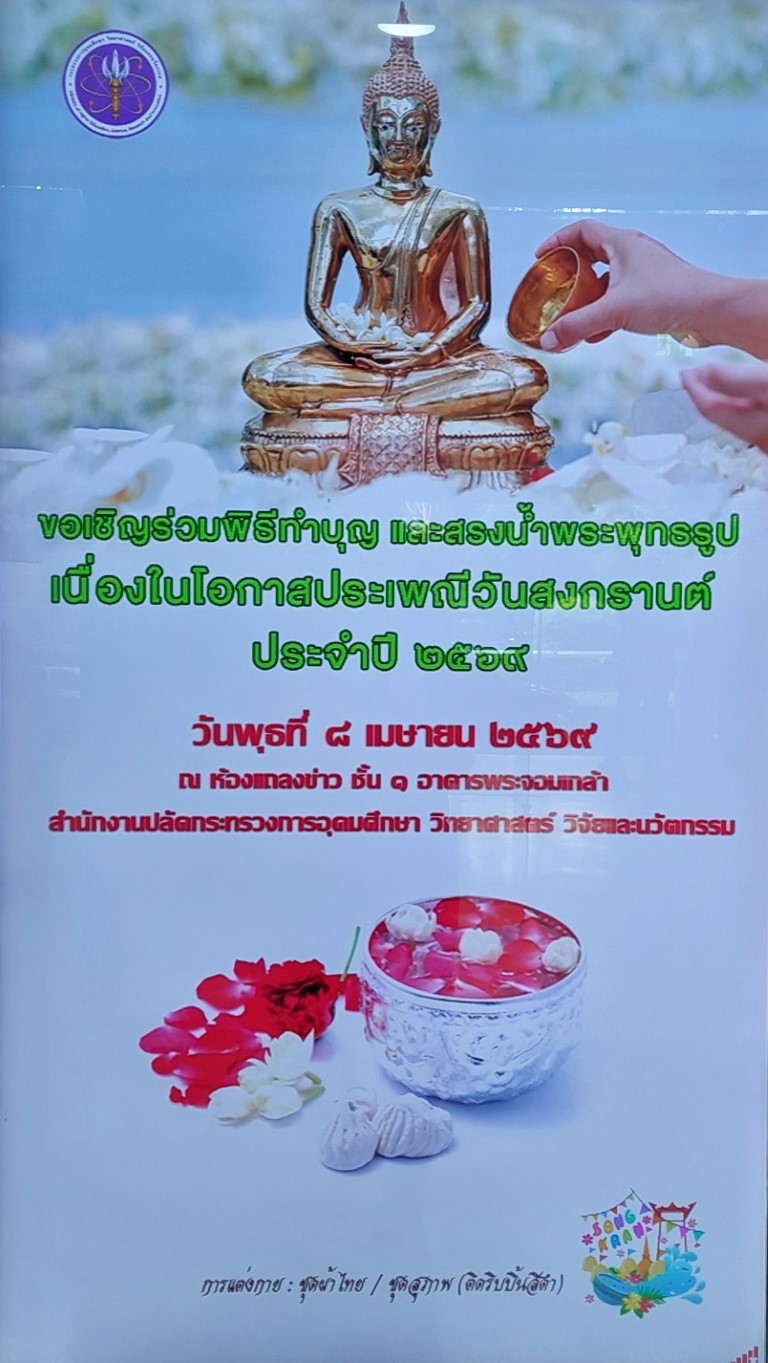 ศ.ดร.ยศชนัน วงศ์สวัสดิ์ รองนายกรัฐมนตรีและรัฐมนตรีว่าการกระทรวงการอุดมศึกษา วิทยาศาสตร์ วิจัยและนวัตกรรม (อว.) พร้อมด้วย ศ.ดร.ศุภชัย ปทุมนากุล ปลัดกระทรวง อว. และผู้บริหารหน่วยงานในสังกัด เข้าร่วมงานสืบสานประเพณีสงกรานต์ ๒๕๖๙ เพื่อสืบสานประเพณีและวัฒนธรรมไทย ในการนี้ พล.ต.ท. พรชัย สุธีรคุณ ผู้อำนวยการ สถาบันมาตรวิทยาแห่งชาติ (มว.) พร้อมด้วย นายทศพร เอียดคง หัวหน้ากลุ่มงานบริหารและพัฒนาทรัพยากรบุคคล ฝ่ายบริหารกลาง และพนักงาน ได้เข้าในพิธีดังกล่าวด้วย ณ ห้องโถงชั้น 1 อาคารพระจอมเกล้า สำนักงานปลัดกระทรวง อว. (ถนนโยธี) กรุงเทพฯ