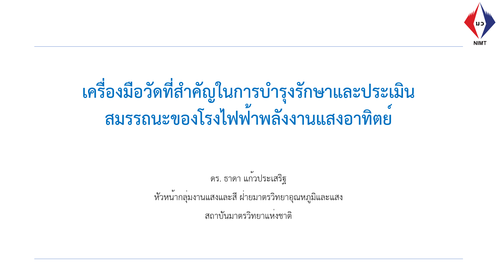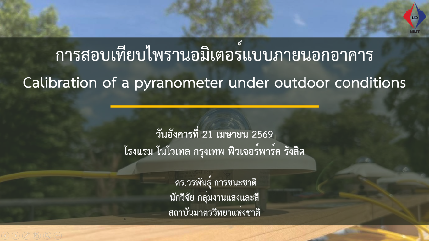 ฝ่ายมาตรวิทยาอุณหภูมิและแสง สถาบันมาตรวิทยาแห่งชาติ (มว.) จัดสัมมนา Photovoltaic Metrology 2026 (PVMET 2026)_และกิจกรรมชมรมมาตรวิทยาอุณหภูมิ 2569 ซึ่งการจัดกิจกรรมในครั้งนี้จัดขึ้นโดยมีวัตถุประสงค์เพื่อถ่ายทอดองค์ความรู้และนวัตกรรมการวัดที่ทันสมัย ในการสนับสนุนภาคพลังงานสะอาด และภาคการเกษตรของไทยให้มีมาตรฐานในระดับสากล โดยในช่วงเช้าเป็นการบรรยาย เจาะลึกเครื่องมือวัดสำคัญการบำรุงรักษาโรงไฟฟ้าพลังงานแสงอาทิตย์ และเทคนิคการสอบเทียบ Pyranometer และ Solar Irradiance Meter ทั้งแบบ Indoor และ Outdoor โดยผู้เชี่ยวชาญจากกลุ่มงานแสงและสี ส่วนในช่วงบ่ายเป็นการอัปเดตนวัตกรรมให้แก่สมาชิกชมรม ได้แก่ “เครื่องสร้างความชื้นกลีเซอรอล” เพื่อยกระดับการทวนสอบภาคสนาม รวมถึงบทบาทสำคัญของมาตรวิทยาอุณหภูมิในการพัฒนาภาคการเกษตรของไทย การสัมมนาดังกล่าวจัดขึ้น ณ ห้องธัญบุรี โรงแรม โนโวเทล กรุงเทพ ฟิวเจอร์พาร์ค รังสิต จังหวัดปทุมธานี