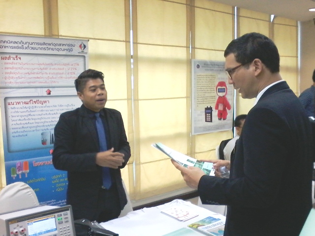 โดยในวันนี้ มว.ได้นำผลงานวิจัย “เทคนิคลดต้นทุนการผลิตแก่อุตสาหกรรมอาหารแช่แข็งด้วยมาตรวิทยา” โดย ดร. นฤดม นวลขาว ฝ่ายมาตรวิทยาอุณหภูมิ ไปนำเสนอเพื่อเป็นการเรียกน้ำย่อยก่อนวันงานจริงที่จะมีขึ้นในวันที่ 23-24 กุมภาพันธ์นี้ ซึ่งได้รับการตอบรับที่ดีเกินคาด มีผู้ประกอบการจากอุตสาหกรรมอาหารแช่แข็งต่างๆ ให้ความสนใจ รวมถึงหน่วยงานที่เกี่ยวข้องหลายหน่วยงาน อาทิ สภาอุตสาหกรรมแห่งประเทศไทย (สอท.) สถาบันวิจัยวิทยาศาสตร์แห่งประเทศไทย (วว.) รวมถึงตัวแทนจากมหาวิทยาลัยต่างๆ เป็นต้น เนื่องจากมีแนวคิดที่สอดคล้องกับความต้องการของภาคการผลิตในแง่ของการหาวิธีเพื่อลดต้นทุนการผลิตสินค้า โดยเฉพาะอย่างยิ่งอุตสาหกรรมอาหารแช่แข็ง โดยเนื้อหาที่นำเสนอเบื้องต้นในวันเปิดตัวงานวิจัยในวันนี้ เป็นการแสดงผลที่เกิดขึ้นจริง จากการลงพื้นที่เพื่อดำเนินงานให้แก่โรงงานต้นแบบ 2 โรงงาน ที่สามารถลดการใช้พลังงานในกระบวนการแช่แข็งลงได้มากกว่าร้อยละ 20 จากนั้นเป็นการอธิบายขั้นตอนเบื้องต้นเกี่ยวกับการวัดอุณหภูมิอย่างถูกต้อง และการปรับปรุงการควบคุมอุณหภูมิในกระบวนการผลิต เพื่อให้ได้ผลิตภัณฑ์ตรงตามมาตรฐาน ตลอดจนสามารถลดความสูญเสียที่จะเกิดขึ้นในกระบวนการผลิต