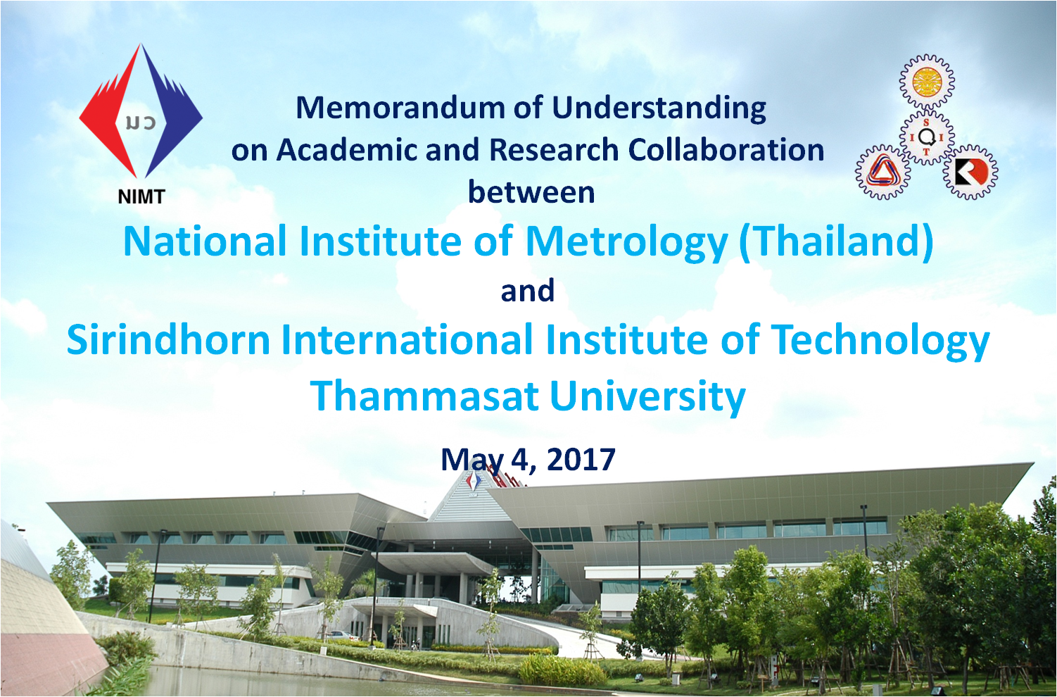 4 พฤษภาคม 2560 : สถาบันมาตรวิทยาแห่งชาติ (มว.) กระทรวงวิทยาศาสตร์และเทคโนโลยี นางอัจฉรา เจริญสุข ผู้อำนวยการสถาบันมาตรวิทยาแห่งชาติ และ ศ.ดร. สมนึก ตั้งเดิมสิริอุดมศักดิ์ ผู้อำนวยการสถาบันเทคโนโลยีนานาชาติสิรินธร ได้ร่วมลงนามบันทึกข้อตกลงโครงการความร่วมมือด้านวิชาการร่วมกันระหว่าง สถาบันมาตรวิทยาแห่งชาติ (National Institute of Metrology (Thailand) : NIMT กับ สถาบันเทคโนโลยีนานาชาติสิรินธร มหาวิทยาลัยธรรมศาสตร์ (Sirindhorn International Institute of Technology, Thammasat University : SIIT) พร้อมด้วย นายอนุสรณ์ ทนหมื่นไวย ผู้ช่วยผู้อำนวยการ มว. และ Dr. Stanislav S. Makhanov, SIIT ร่วมเป็นสักขีพยาน โดยบันทึกข้อตกลงโครงการดังกล่าวเป็นความร่วมมือภายใต้การวิจัยร่วมกัน รวมทั้งการประสานงาน การสัมมนา การประชุม หรือร่วมทุนการศึกษาสำหรับหลักสูตรของ SIIT สำหรับพนักงานของ มว. โดยมีวัตถุประสงค์เพื่อส่งเสริมการวิจัยและการศึกษาที่สร้างศักยภาพการวัดของทั้งสององค์กรในการใช้ทรัพยากรร่วมกันพัฒนางานวิจัยด้านการวัดเพื่อพัฒนางานมาตรวิทยาในการต่อยอดไปสู่ภาคการผลิตของอุตสาหกรรมและส่งเสริมศักยภาพ สนับสนุนแนวคิดการพัฒนาประเทศไทย 4.0 การเปลี่ยนแปลงโครงสร้างเศรษฐกิจไปสู่เศรษฐกิจที่ขับเคลื่อนด้วยนวัตกรรม ณ อาคารผดุงมาตร มว. จ.ปทุมธานี